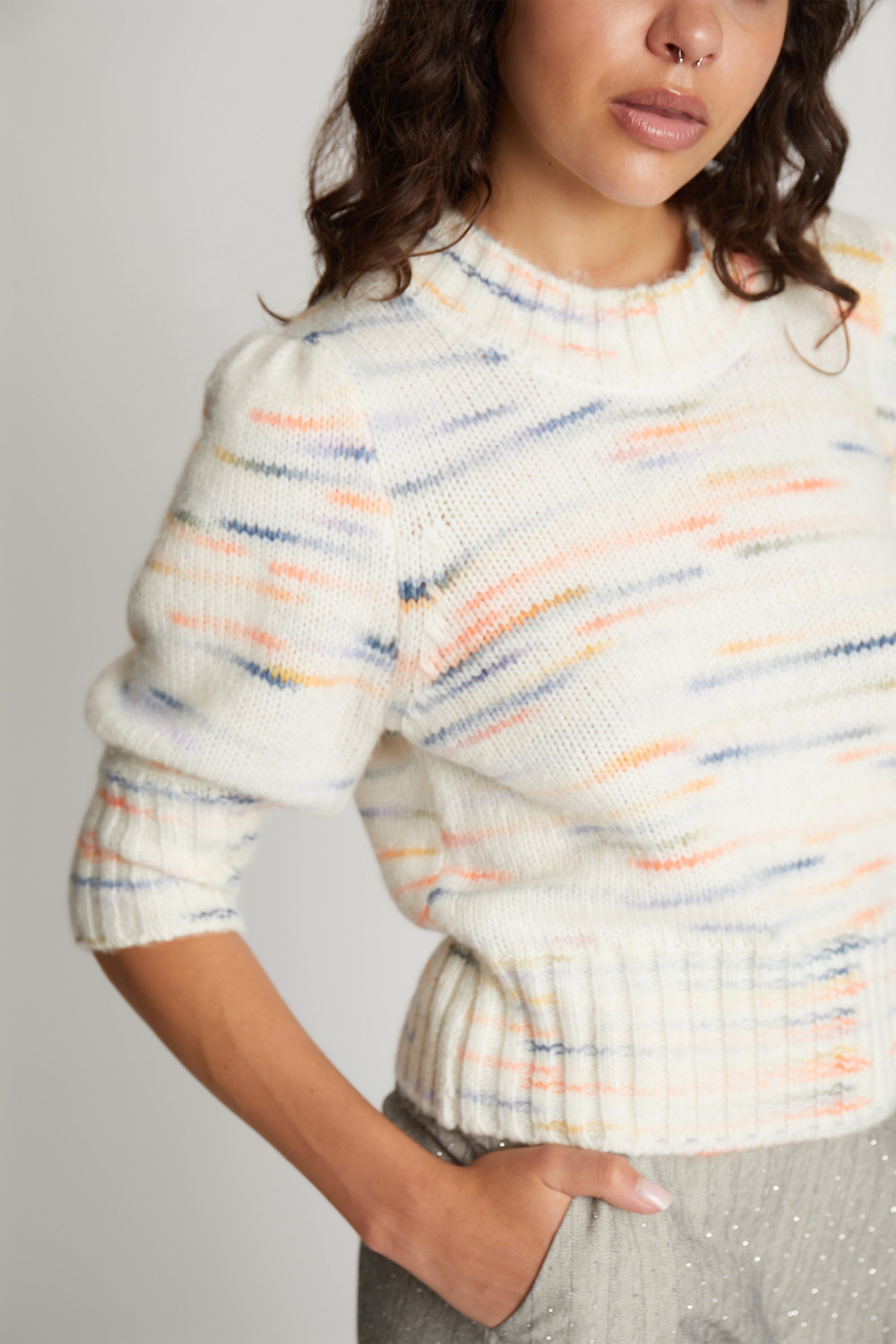 Soft knit with a beautiful textured pattern made of a soft wool blend. This knit is designed with elegant semi-short puff sleeves and is made for a regular fit.