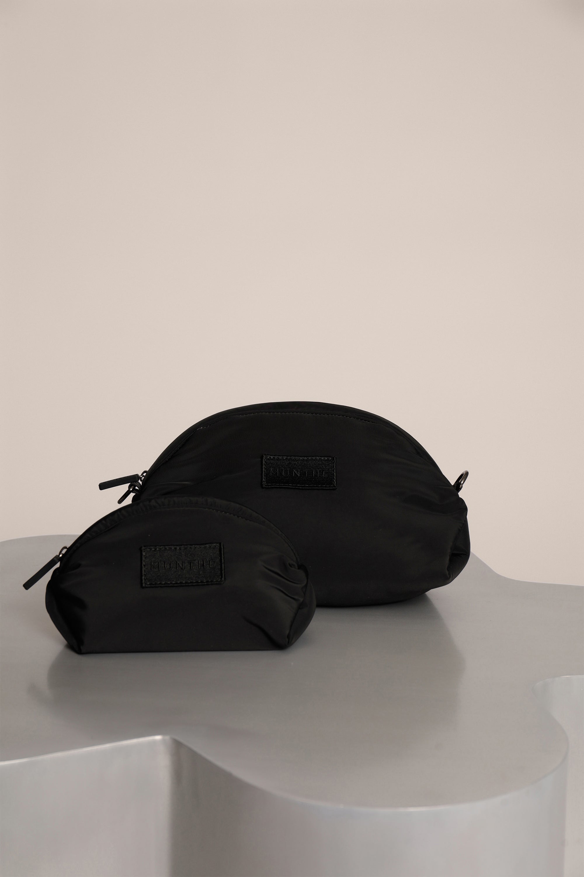 A small bag with an elegant MUNTHE logo patch and a zip closure. The bag has a size that can hold your keys, makeup, or other small items. This bag is the small bag on the picture.