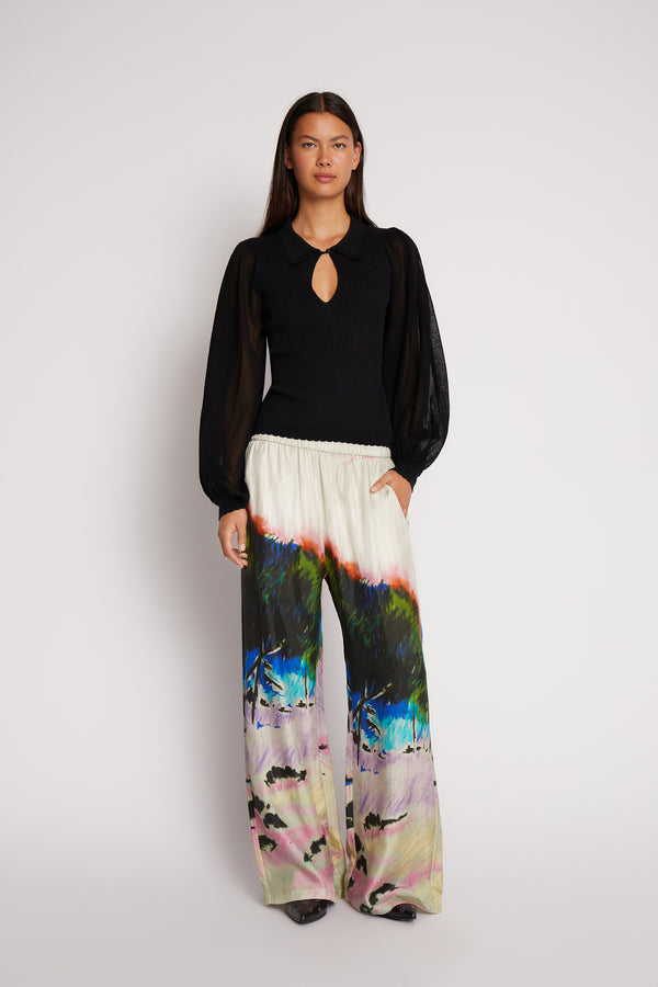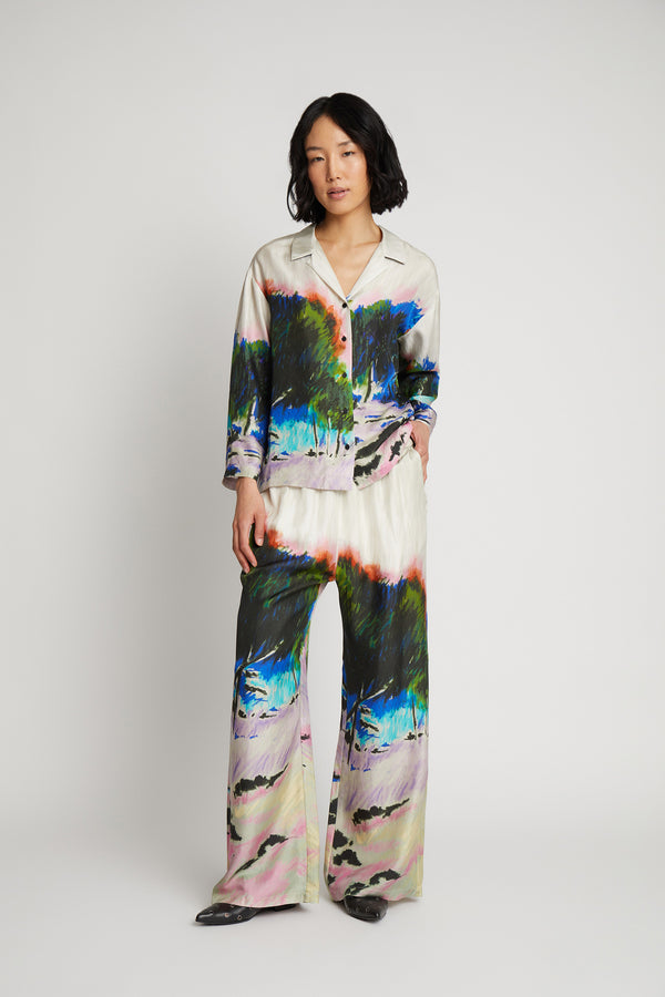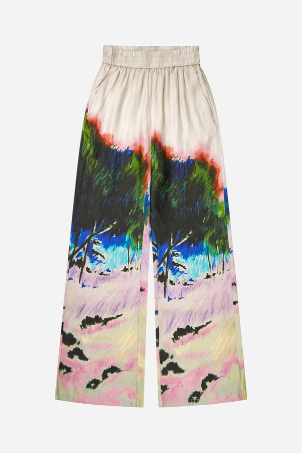 Pants with a beautiful all-over landscape print made from 100% silk. The pants are designed with pockets and an elastic waist.
