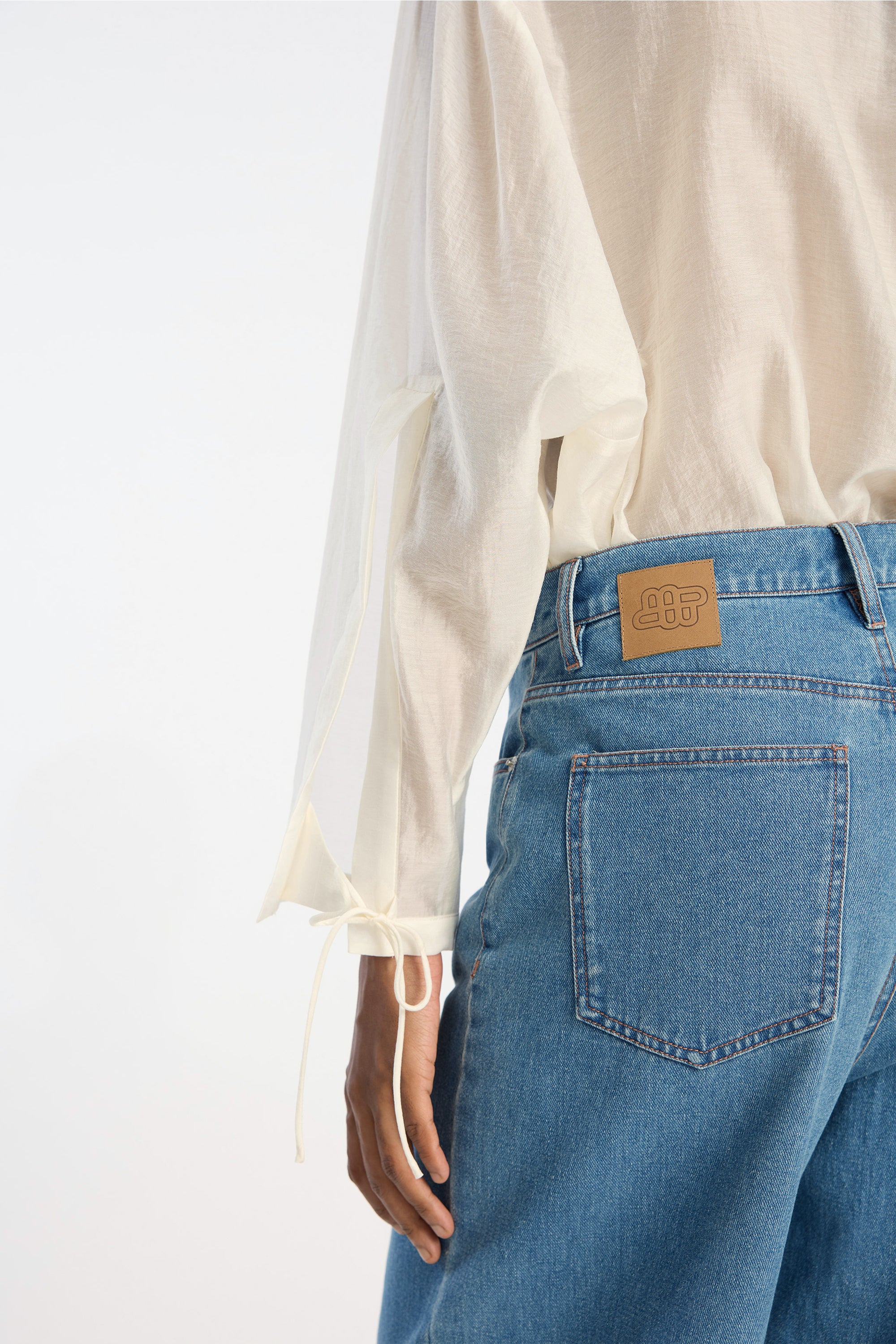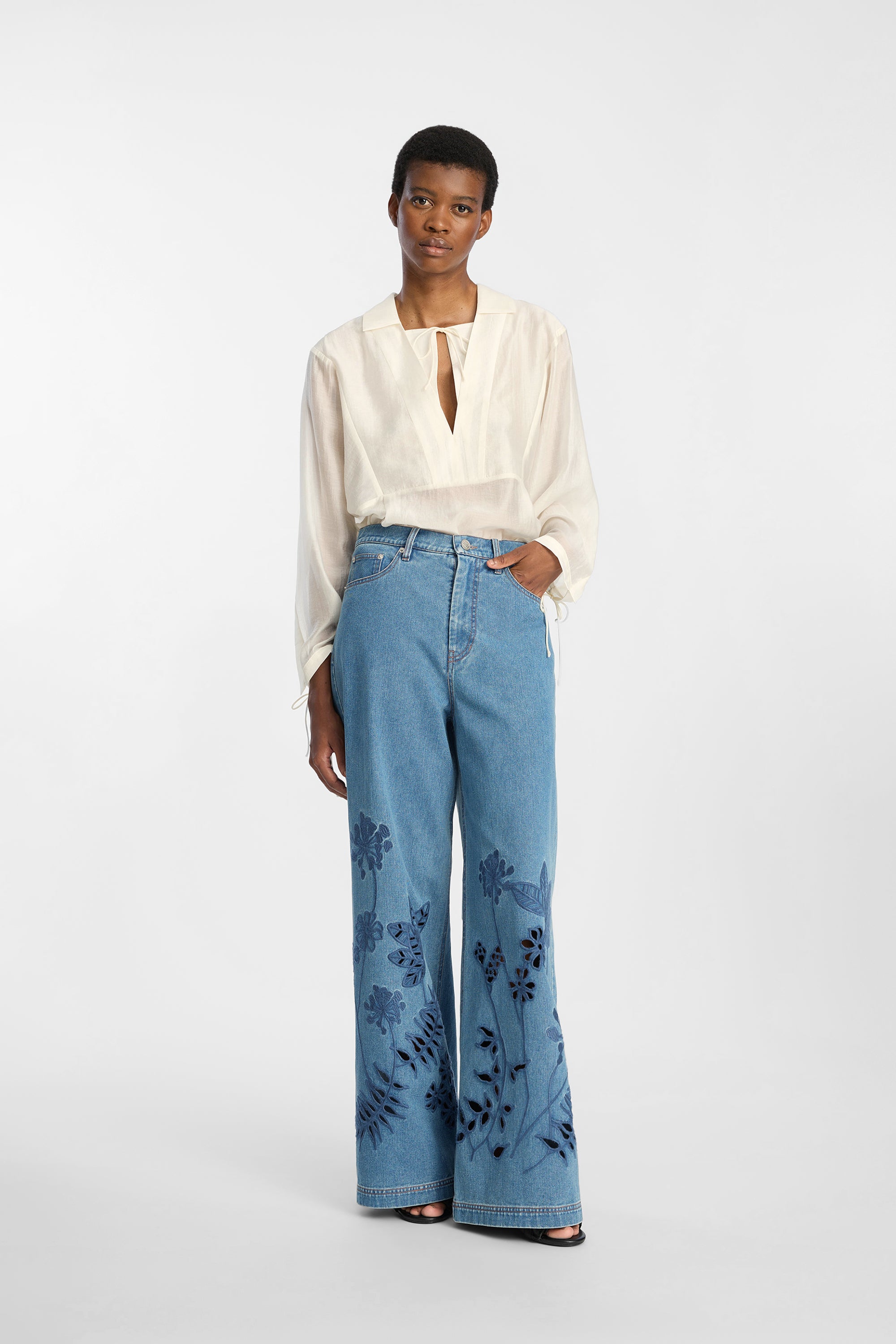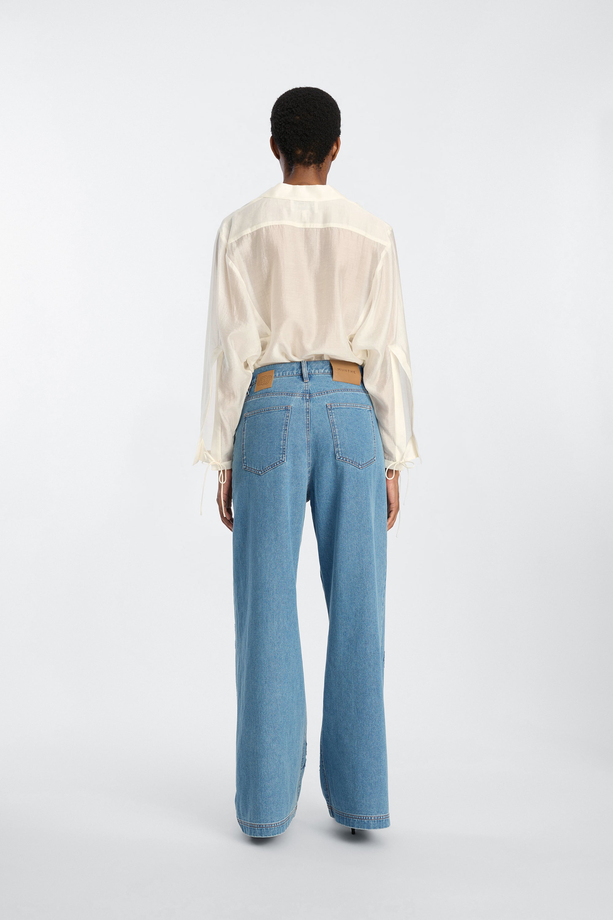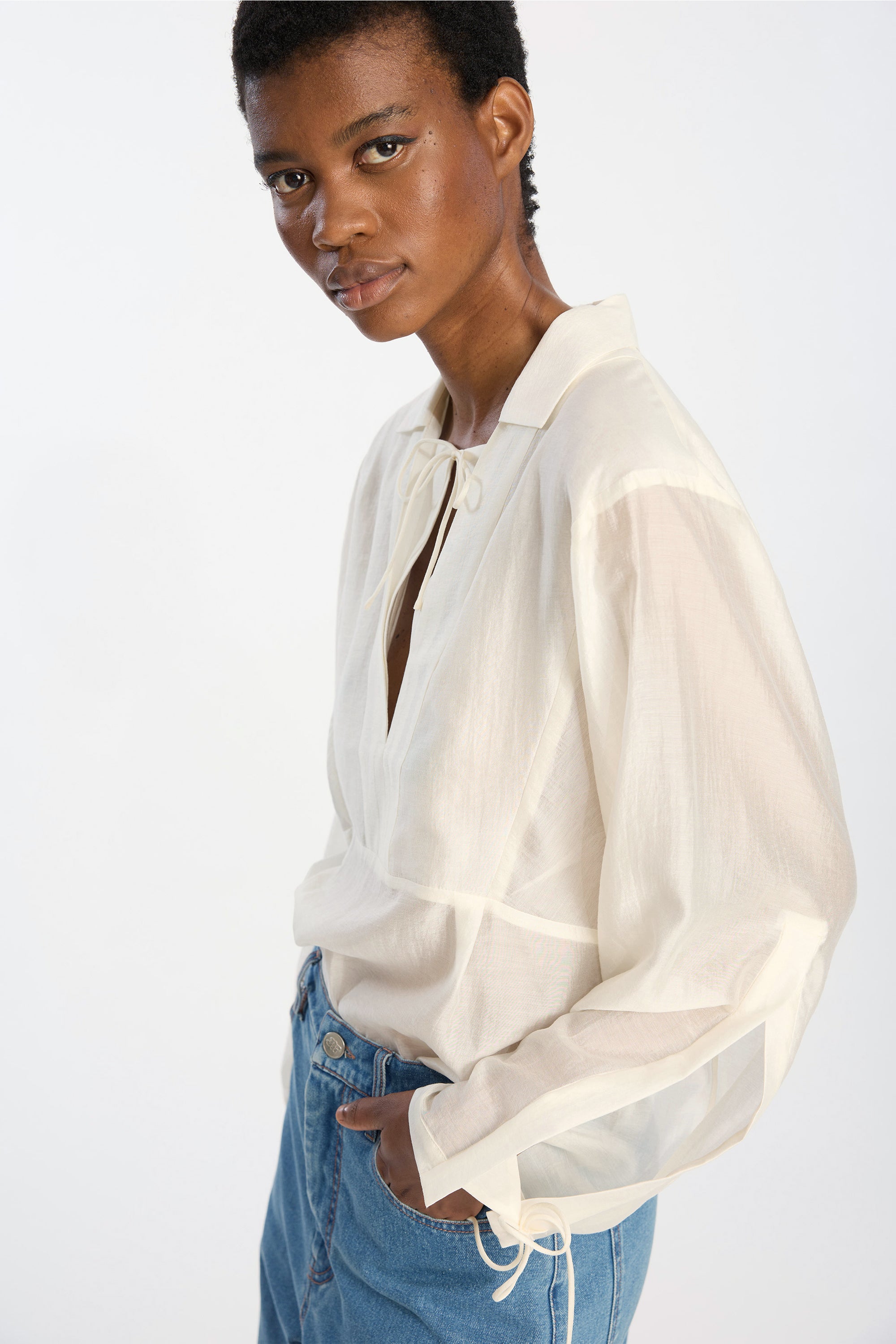 The top is crafted from a lightweight, sheer fabric featuring delicate ties at the neckline and cuffs. It has an open V-neckline, a collar, long sleeves, and a relaxed, airy fit.
