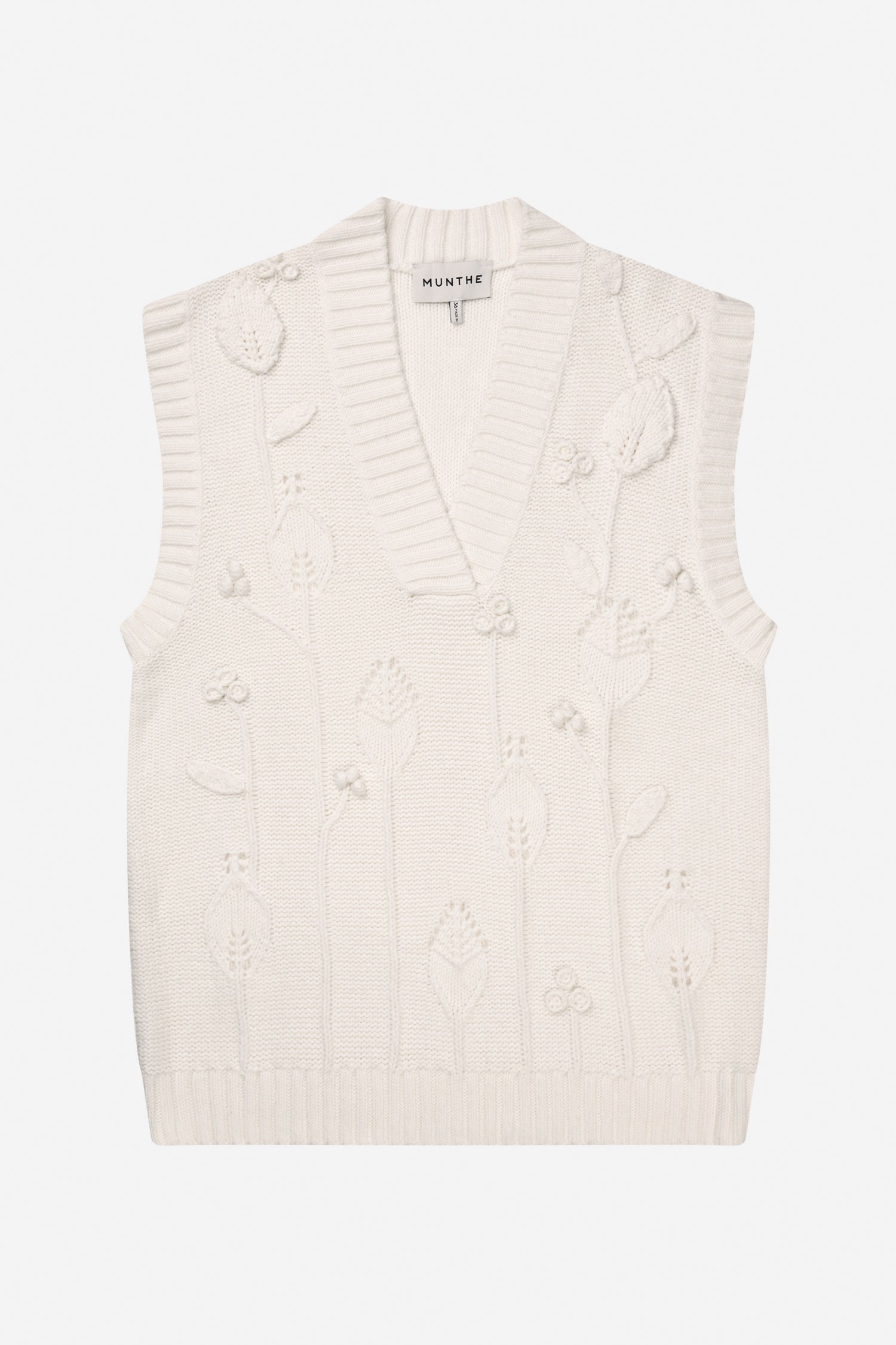 Sleeveless knitted vest with a deep V-neckline and a raised floral knit pattern. Finished with ribbed edges at the neckline, armholes, and hem.