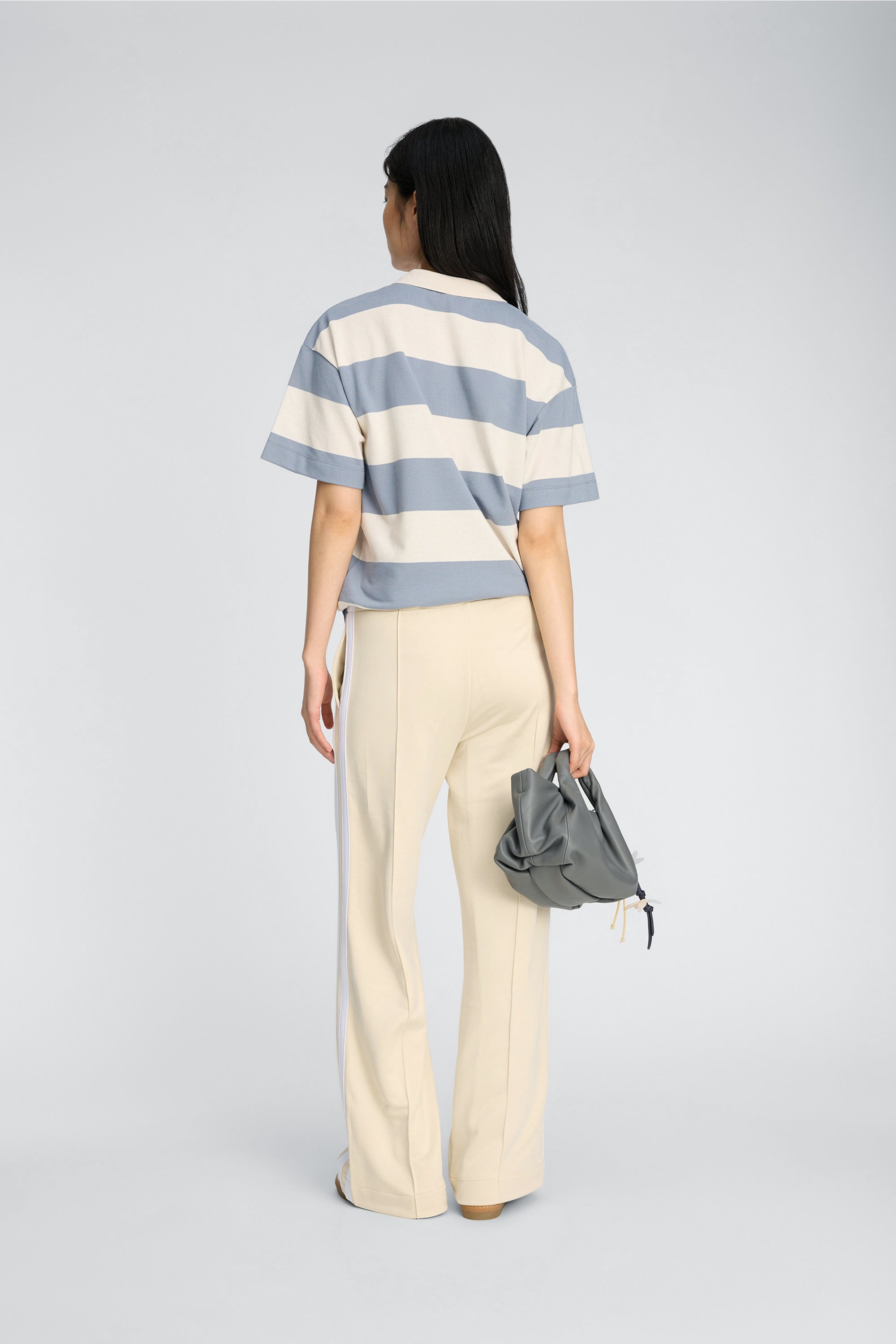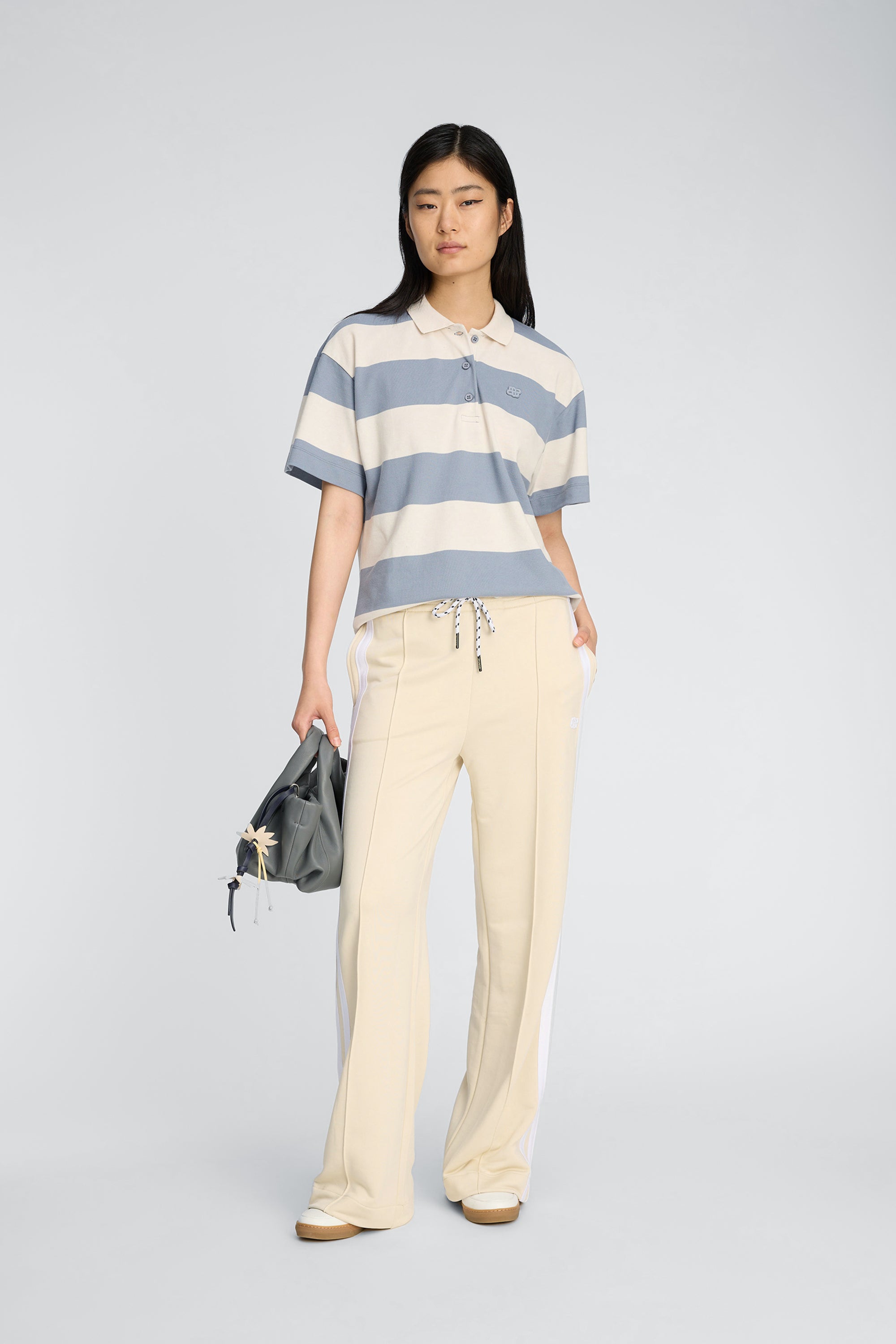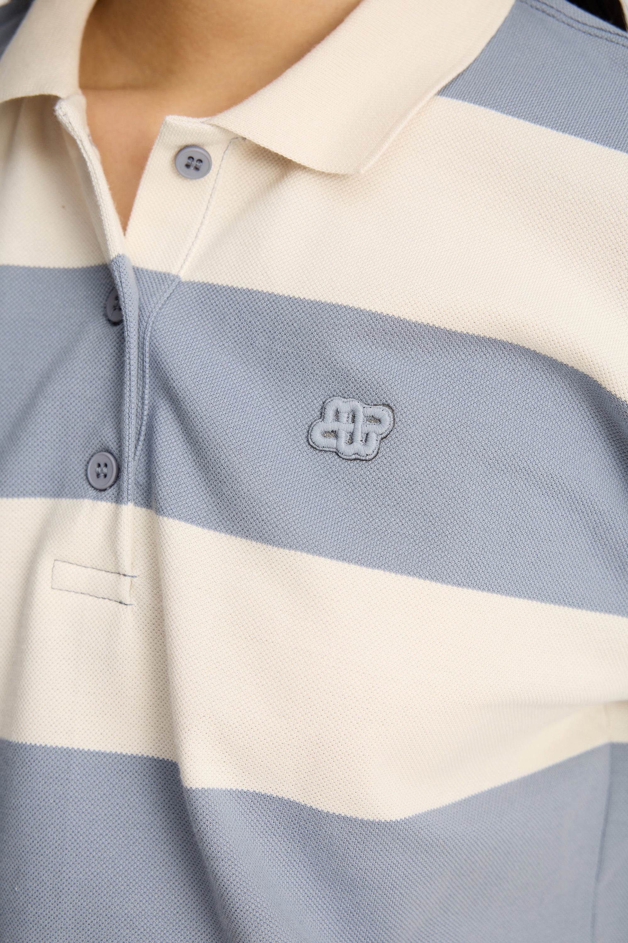 Striped polo T-shirt with a white collar and button details. It features short sleeves, a round neckline, a subtle MUNTHE emblem, and a loose fit.