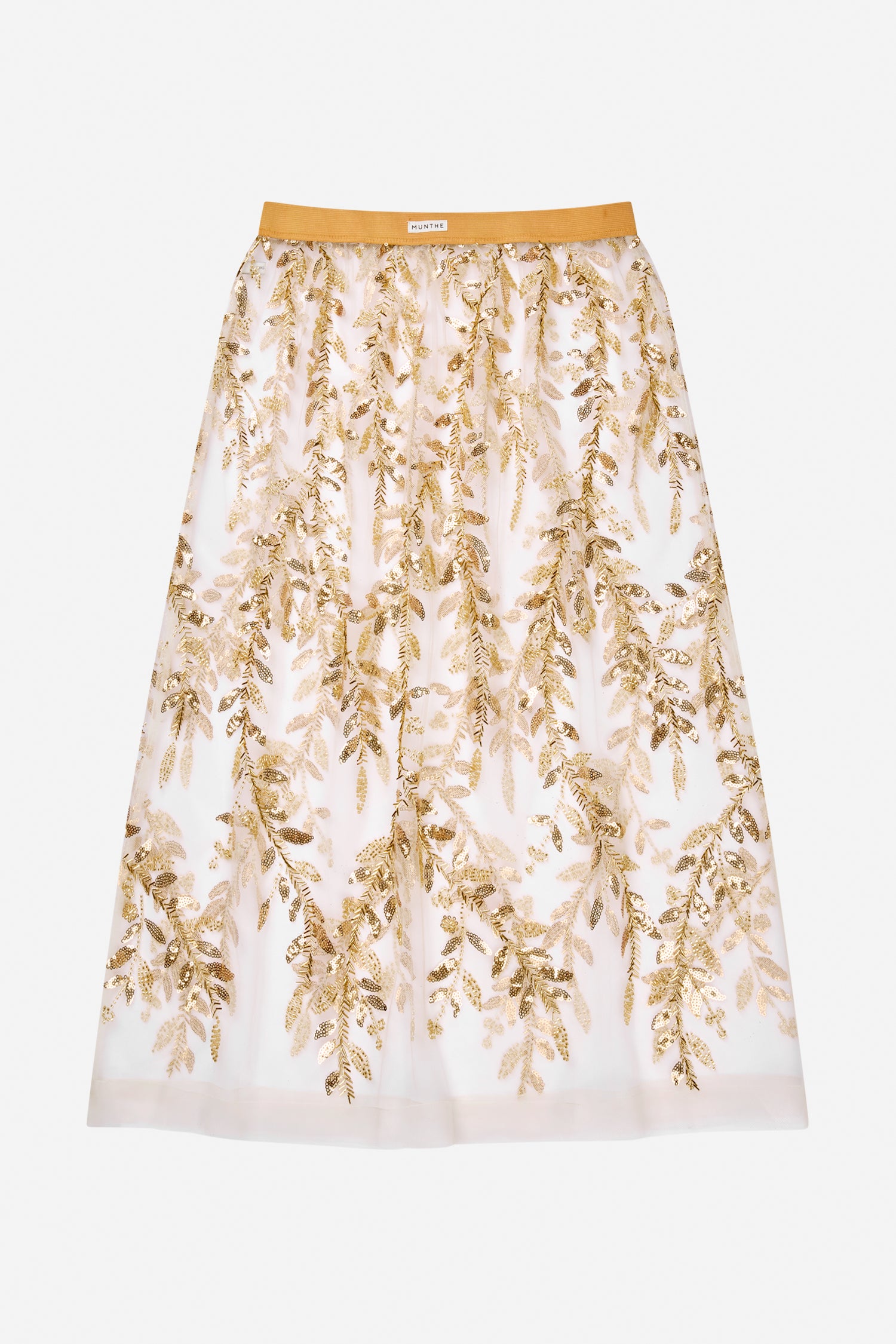 This skirt is crafted from a lightweight, sheer material featuring embroidery in golden tones. It has a contrast waistband with a MUNTE logo, and can be styled on top of our BAIA SLIP skirt or on top of jeans.