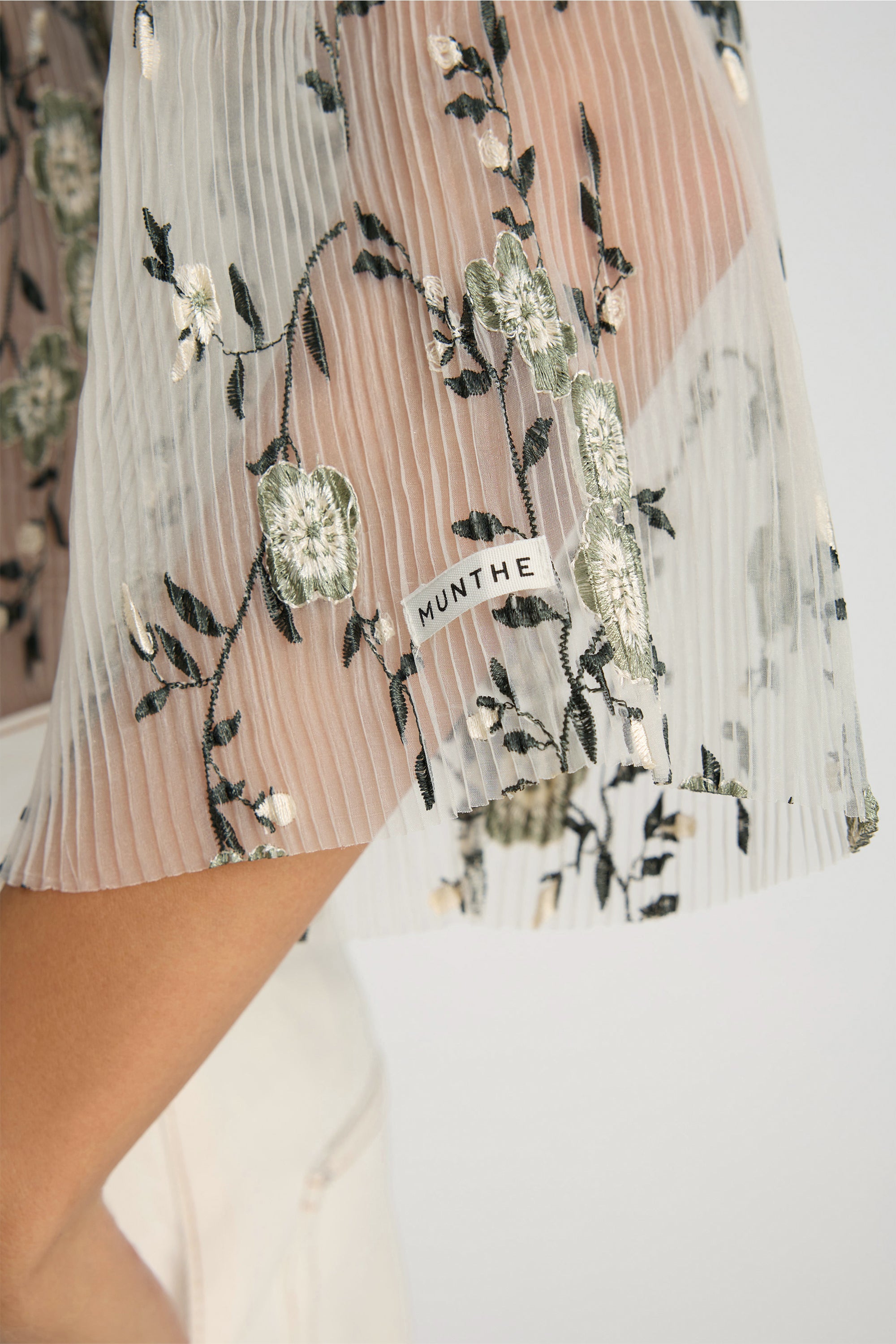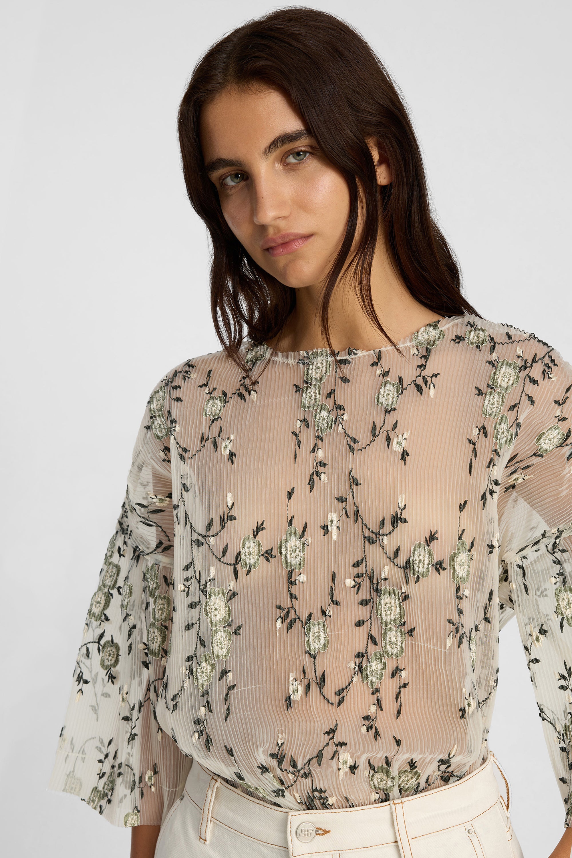 Blouse with all-over floral embroidery, round neck, short sleeves and a loose fit.