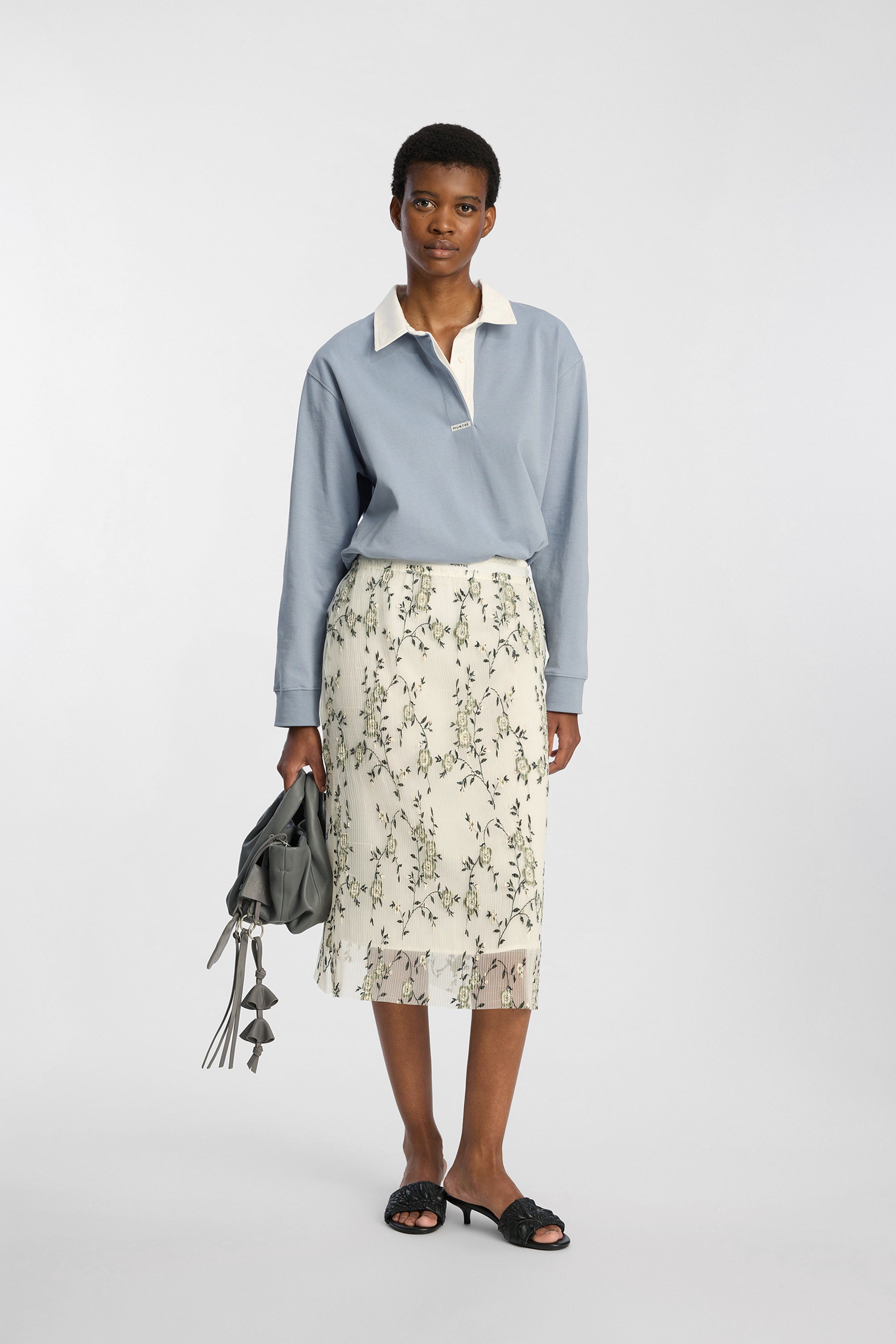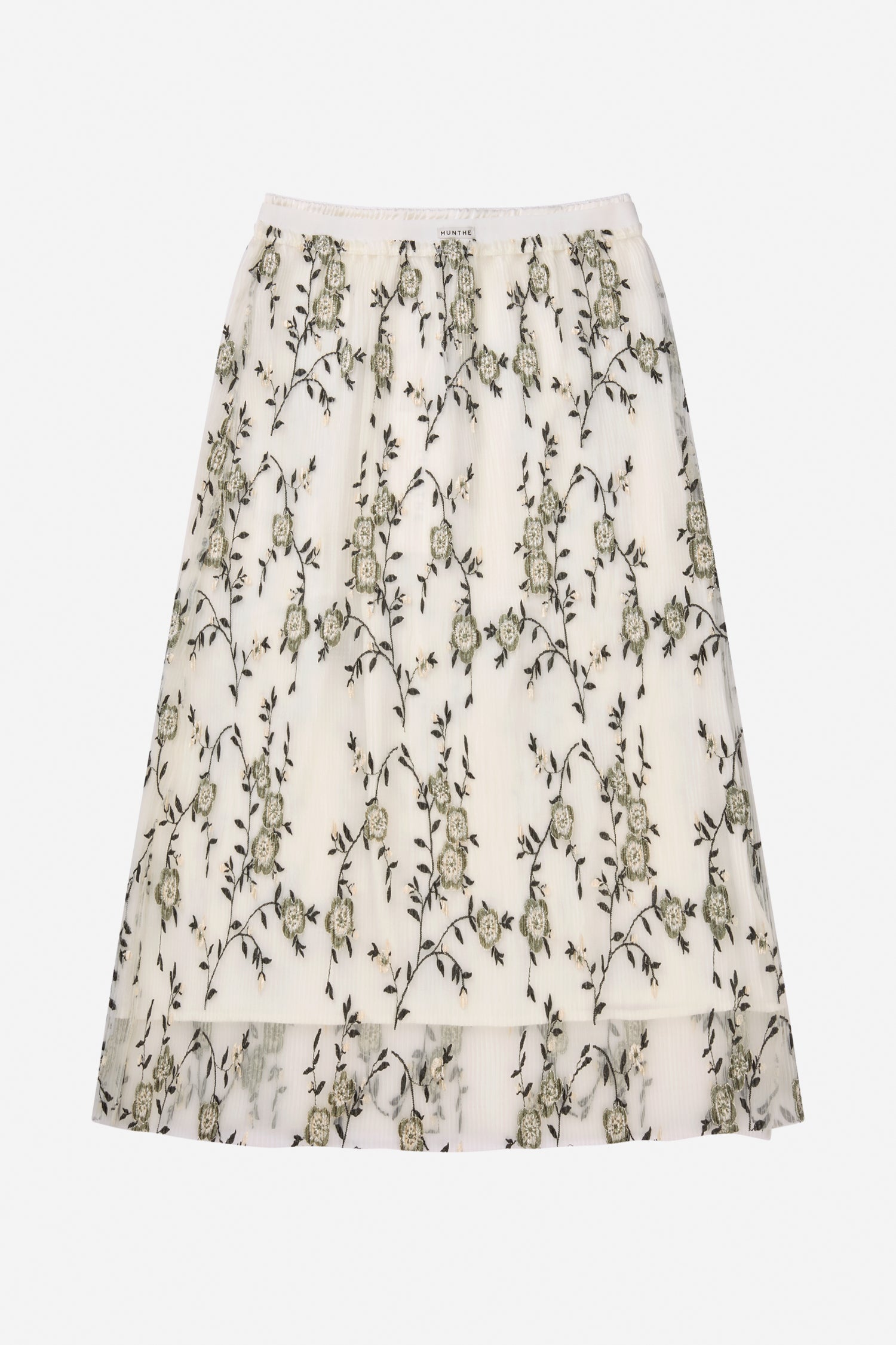 This skirt is crafted from a lightweight, sheer fabric featuring all-over embroidered floral detailing. It has an A-line silhouette, a soft lining, and an elasticated waist for comfortable wear.