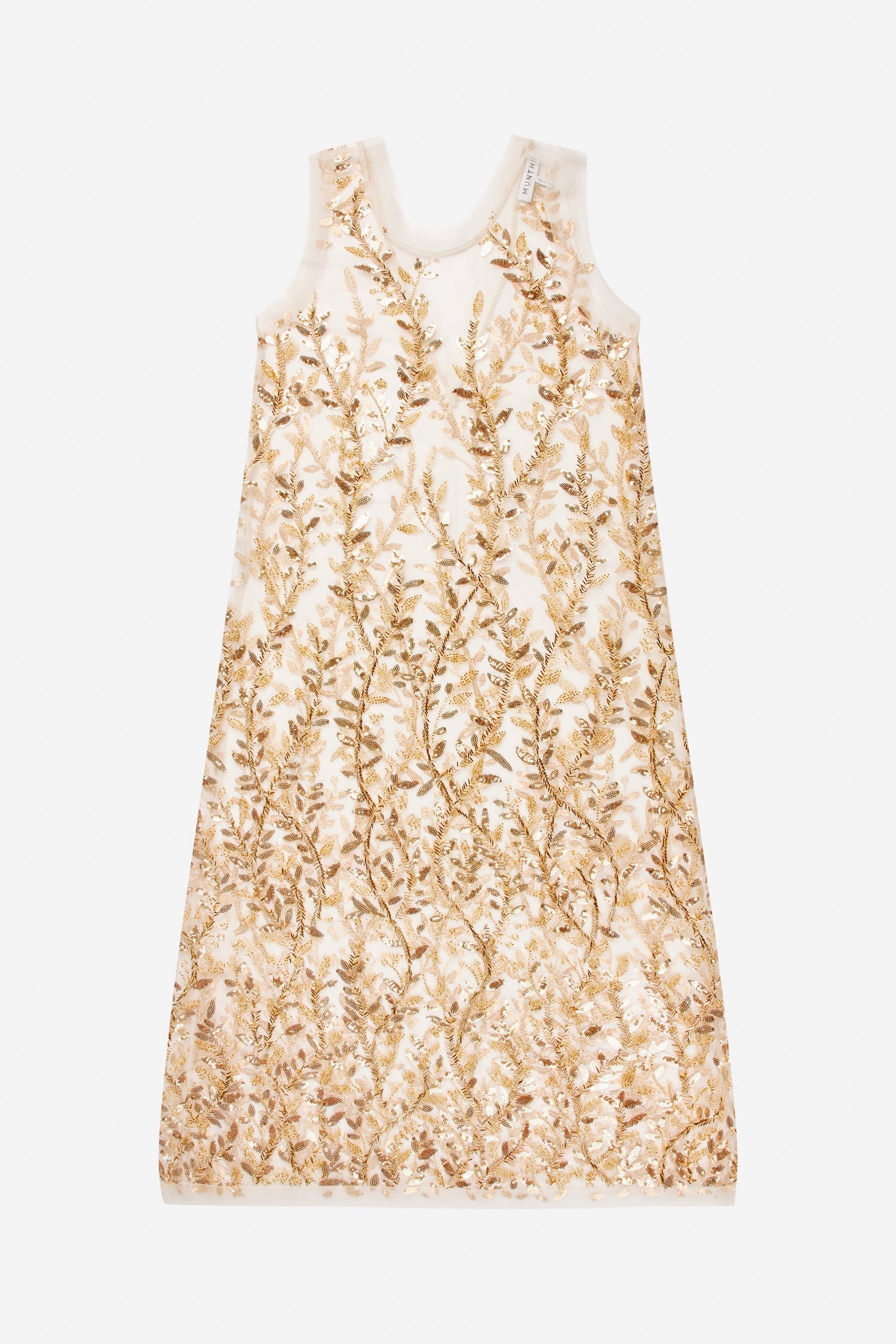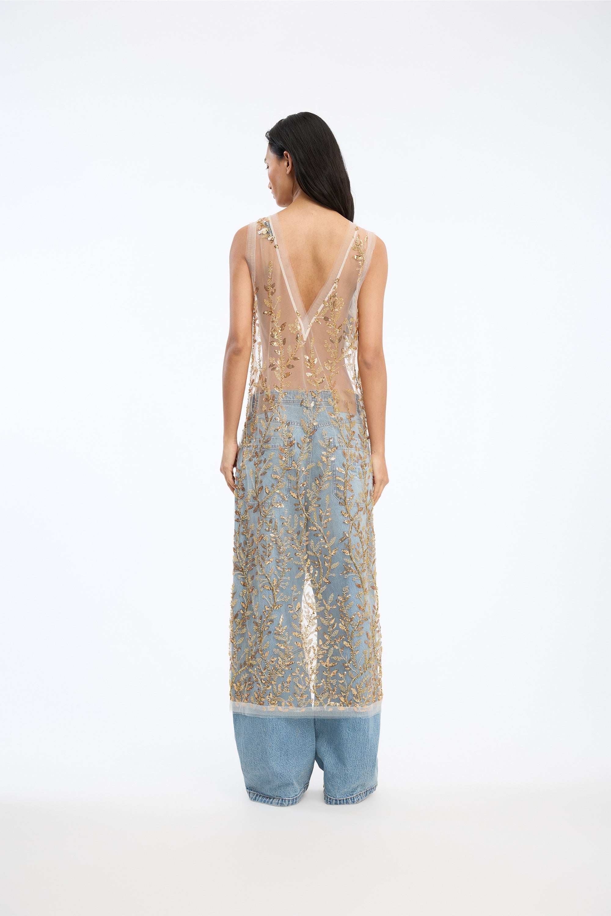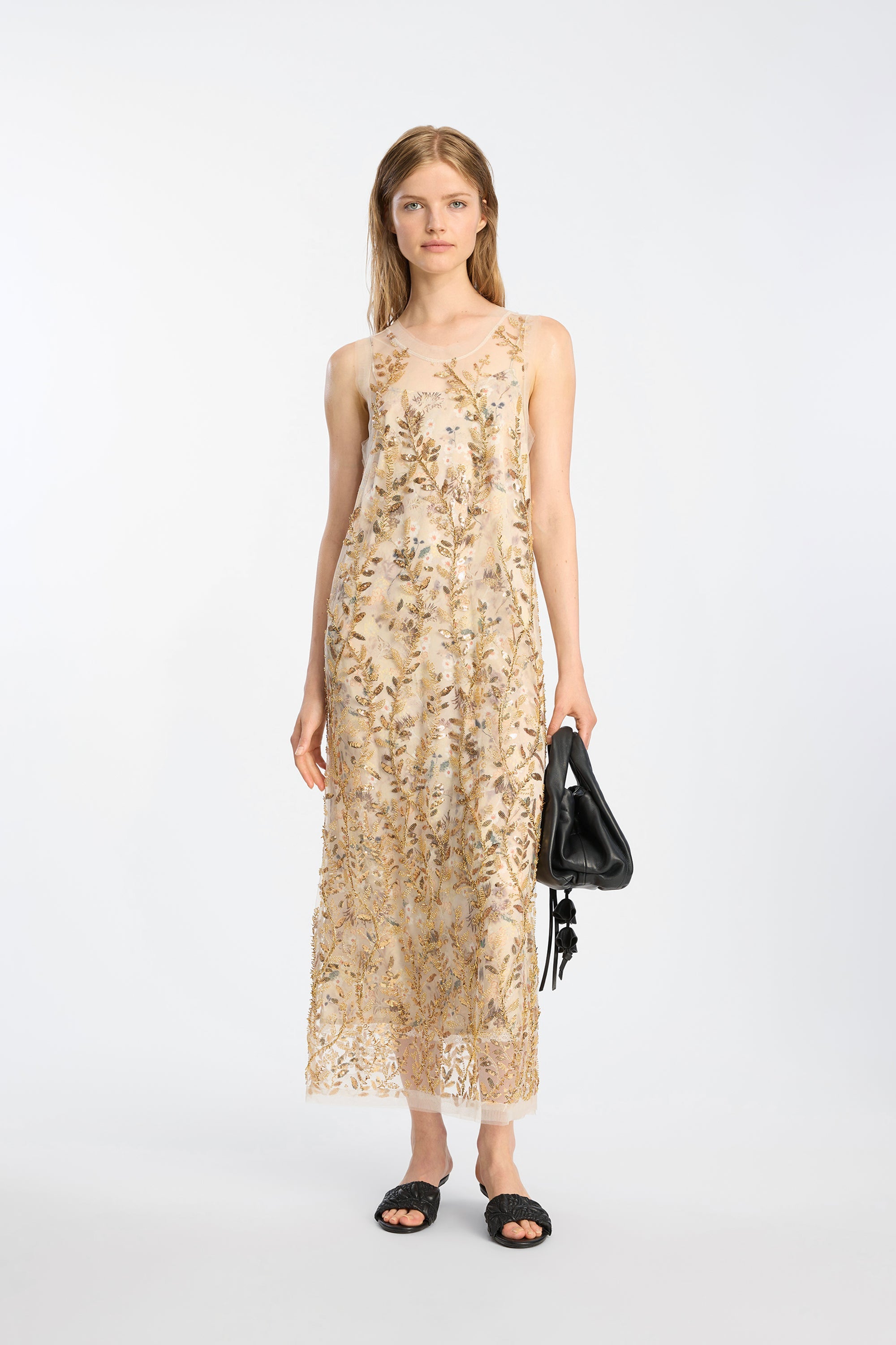 Semi-transparent dress adorned with dense embroidered vines of gold-toned sequins and pearl details. The silhouette is straight, with broad shoulder straps and a sleeveless finish.