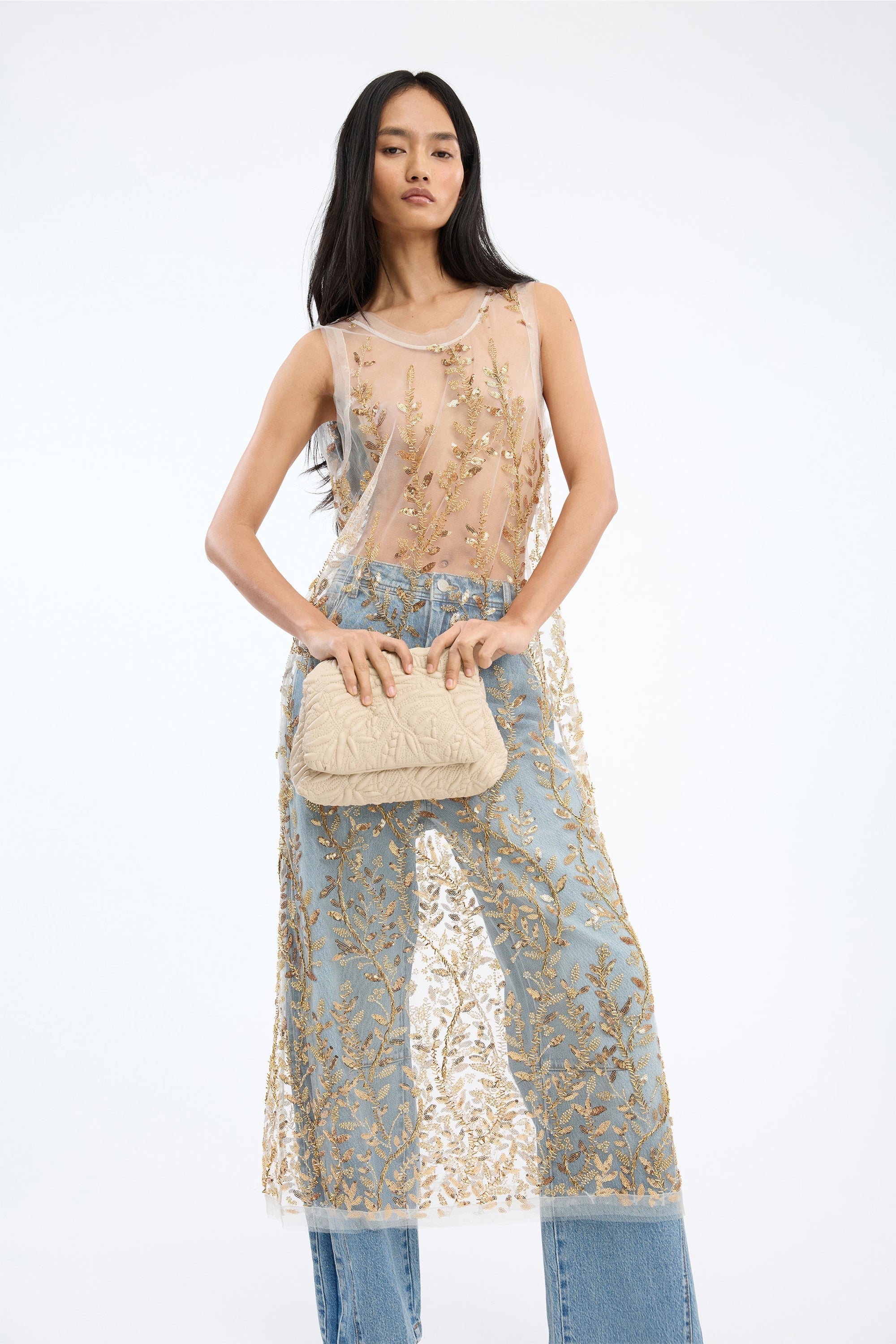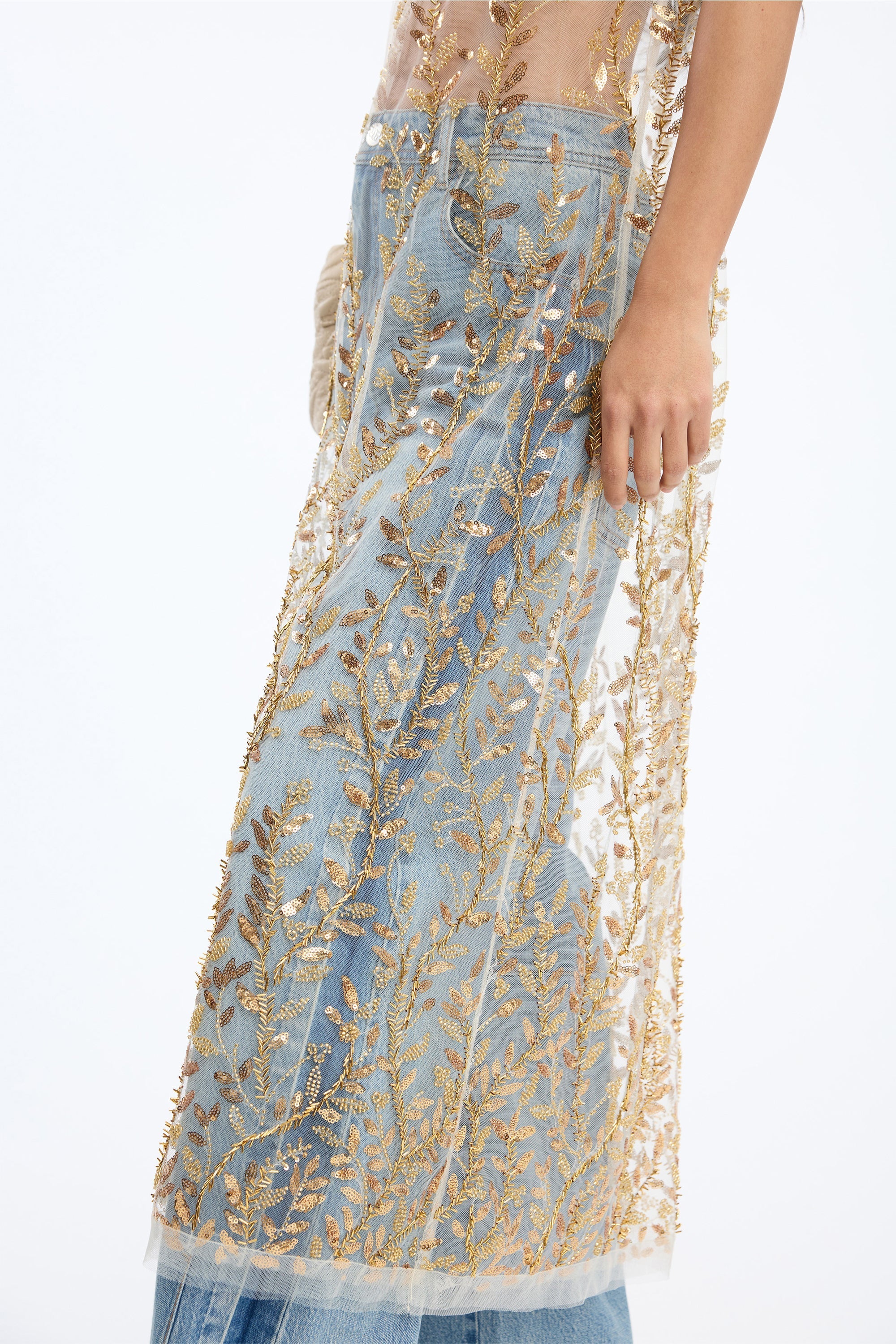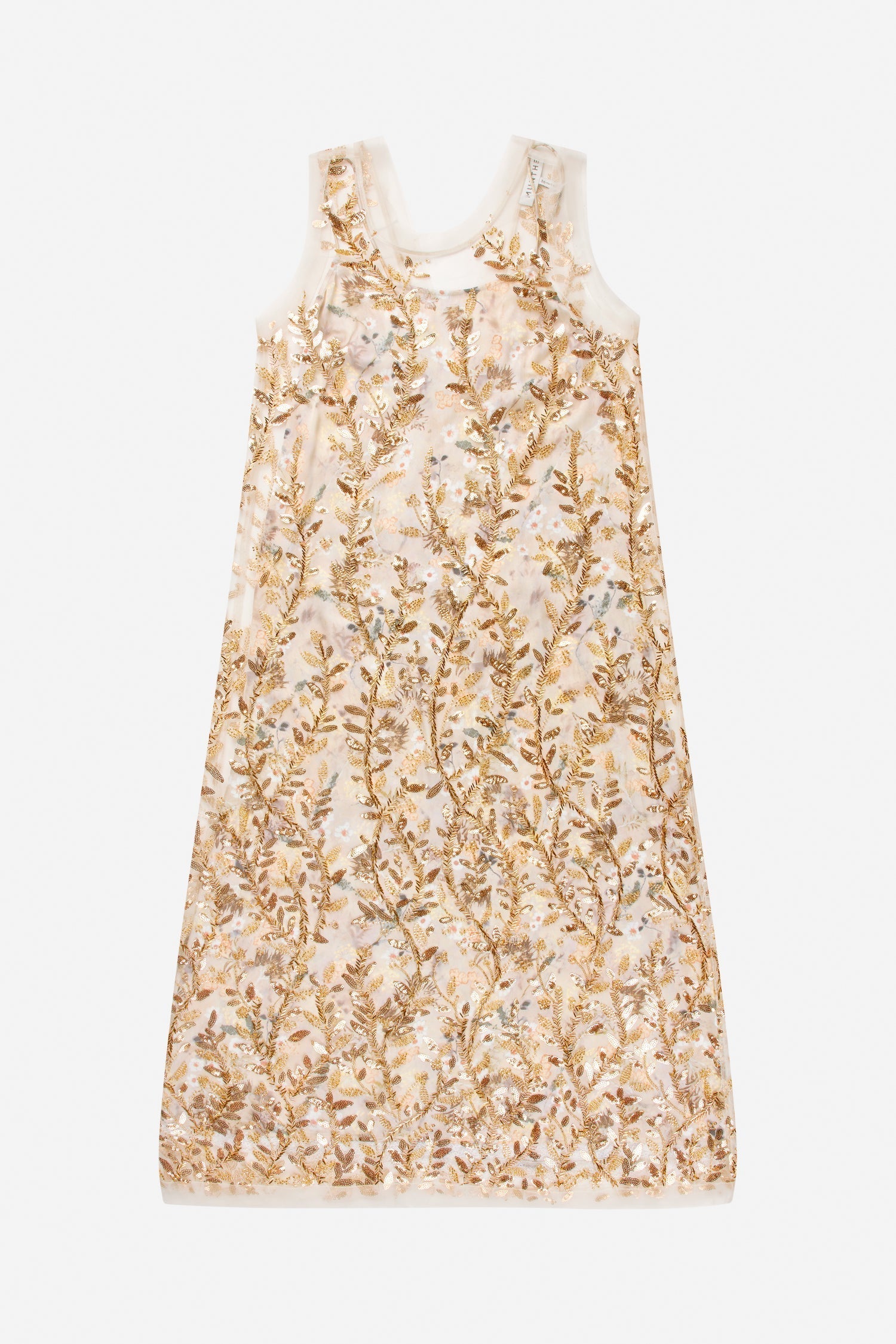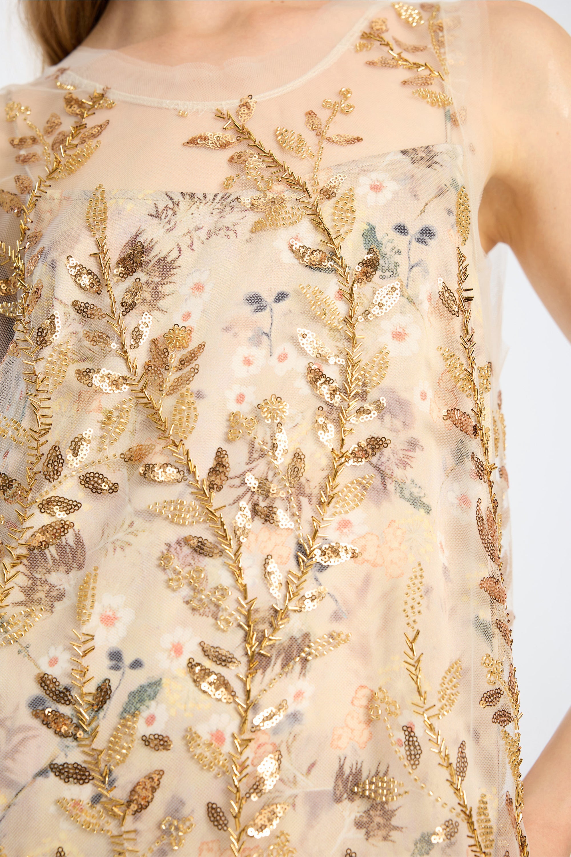 Semi-transparent dress adorned with dense embroidered vines of gold-toned sequins and pearl details. The silhouette is straight, with broad shoulder straps and a sleeveless finish.