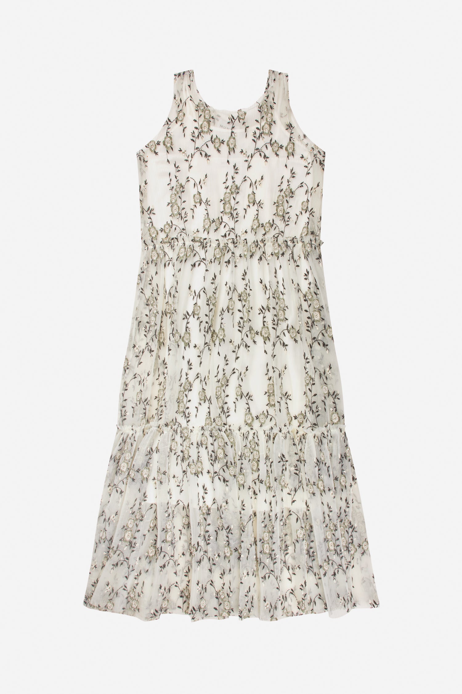 Dress crafted from a lightweight, sheer material with an allover floral embroidery. It is sleeveless, and comes with a neutral coloured dress under the sheer fabric.
