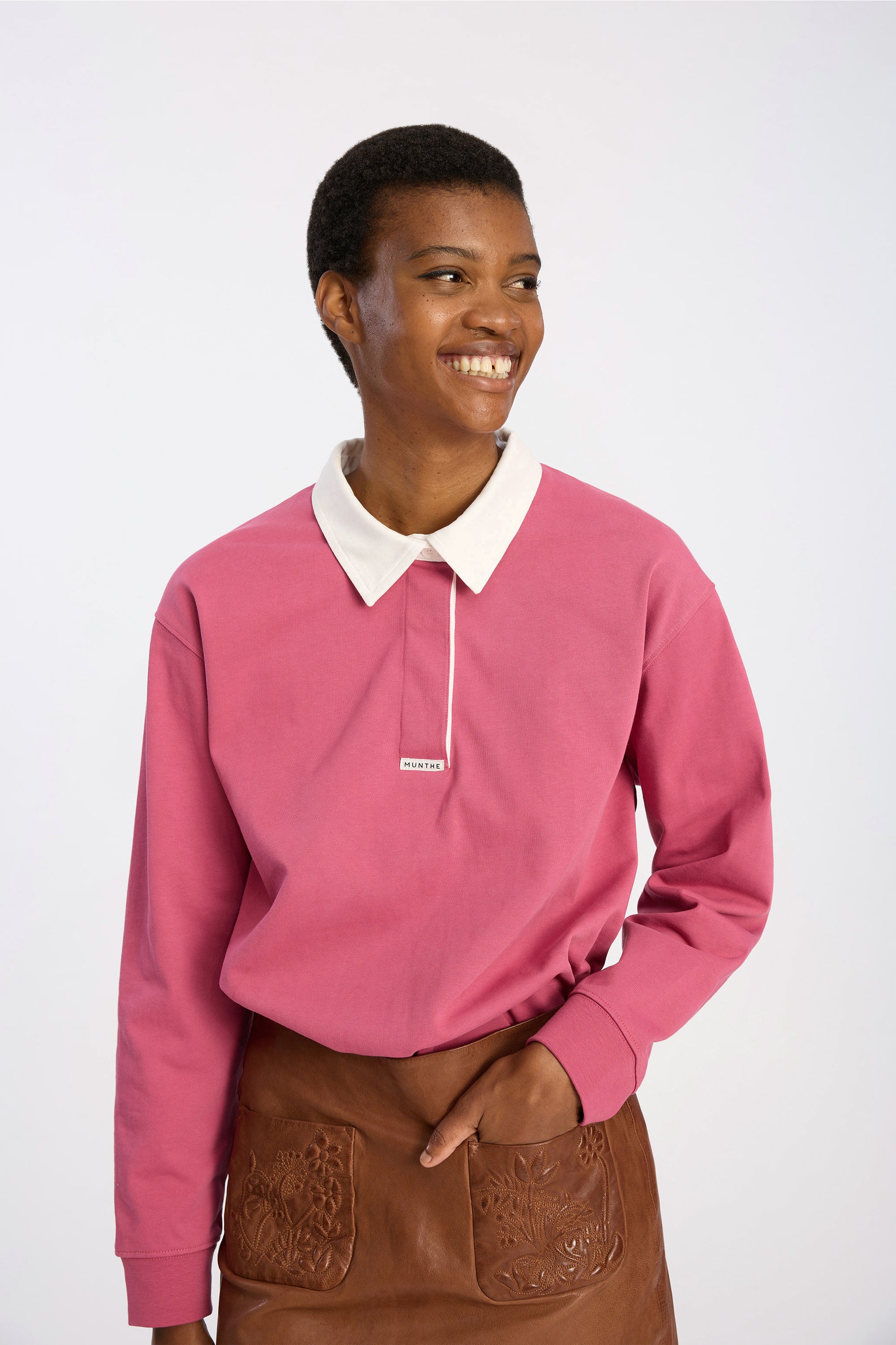 This polo top features a contrasting white collar and long sleeves, all in a stunning berry color. Add a pop of color to your wardrobe with this statement piece.