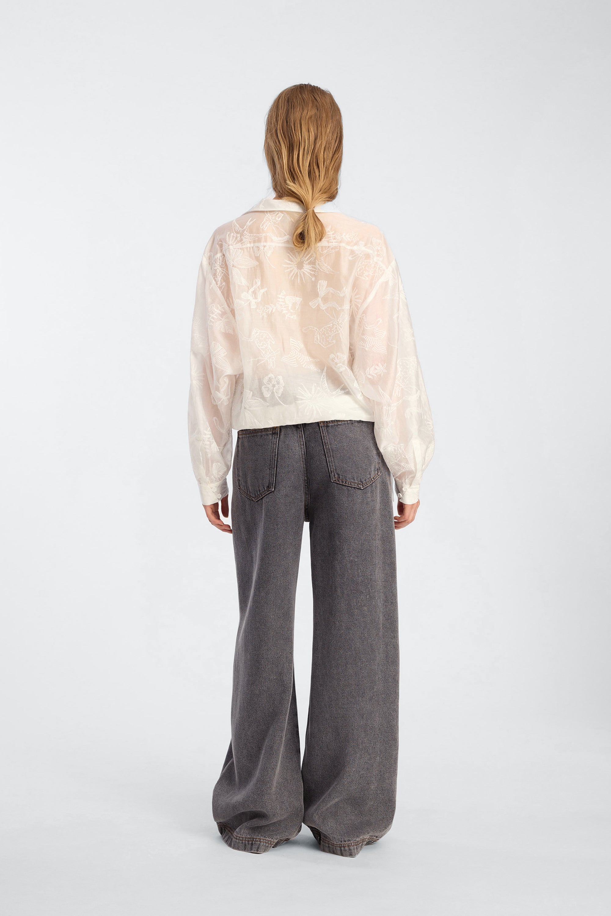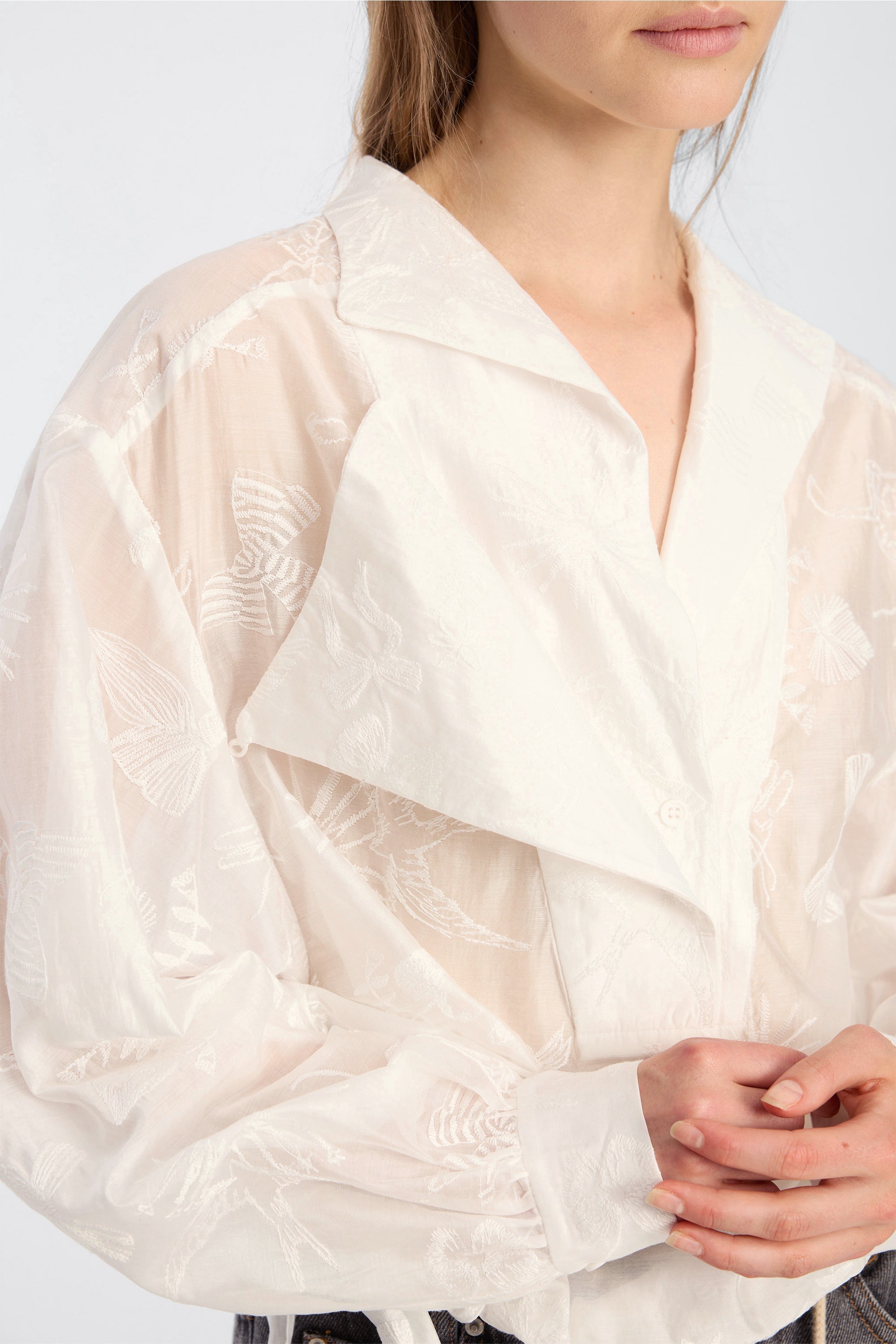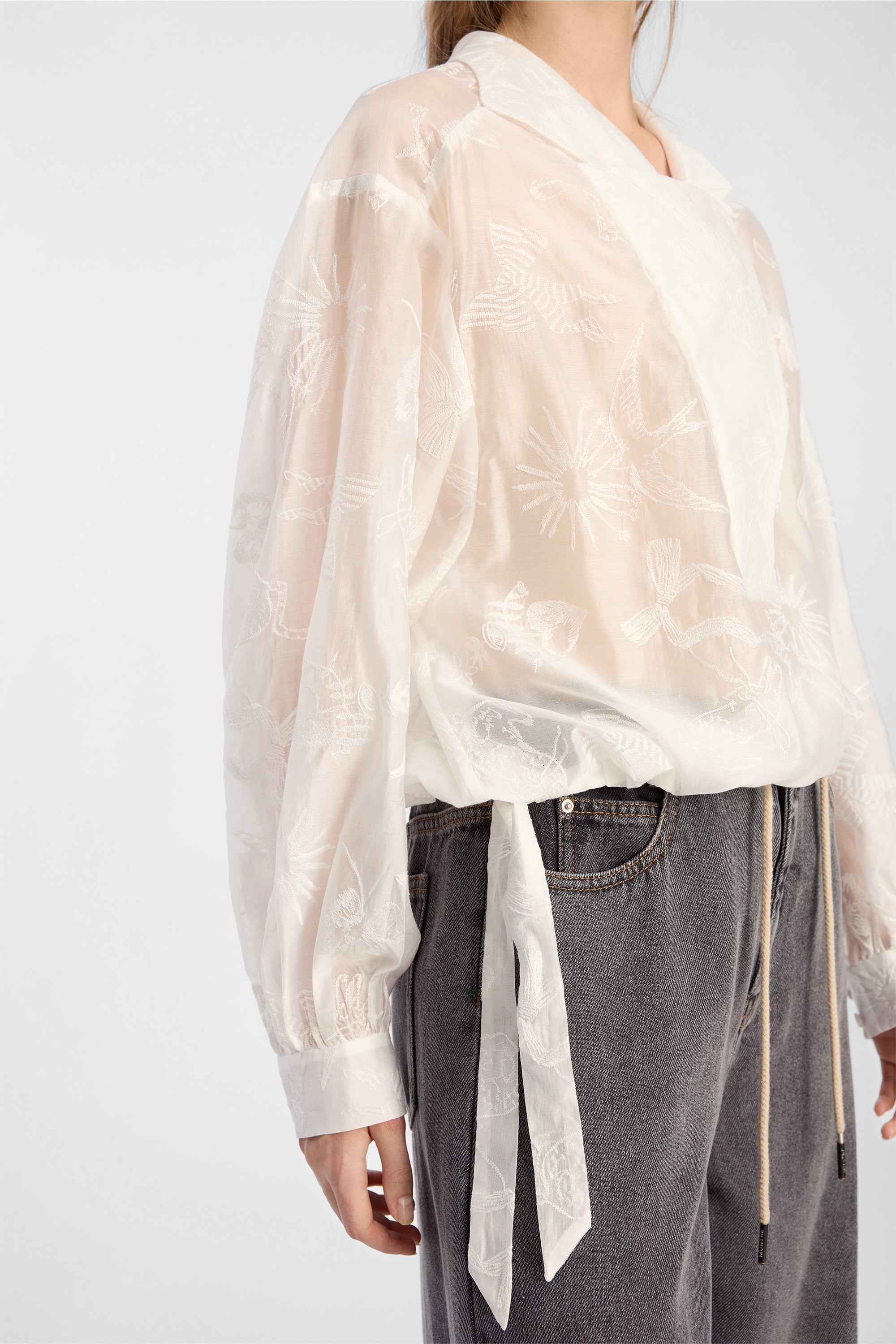 Blouse crafted from a lightweight woven fabric featuring a subtle jacquard pattern. It is designed with a relaxed silhouette, side tie detail, voluminous sleeves, and a V-neckline with a collar element.