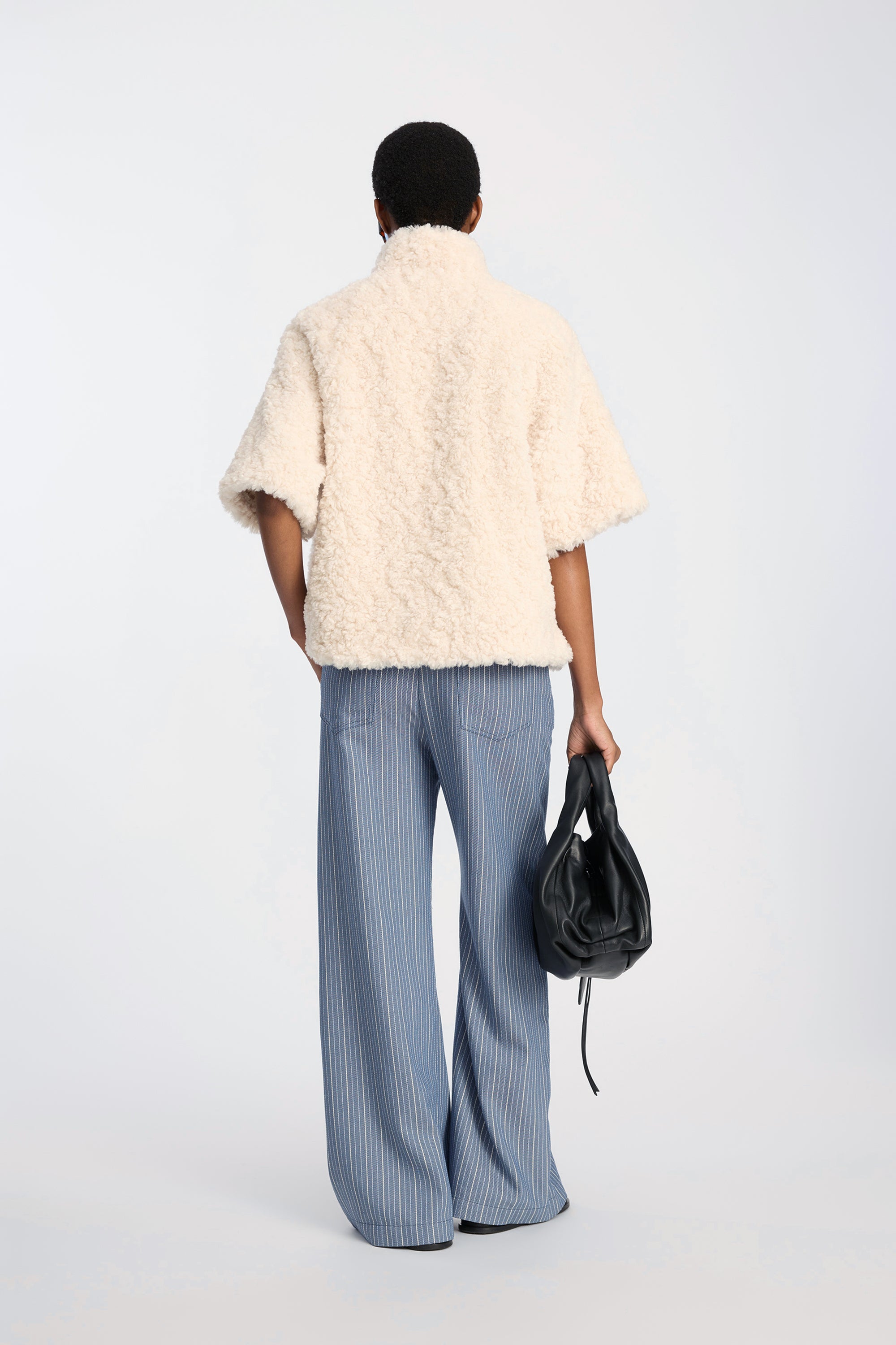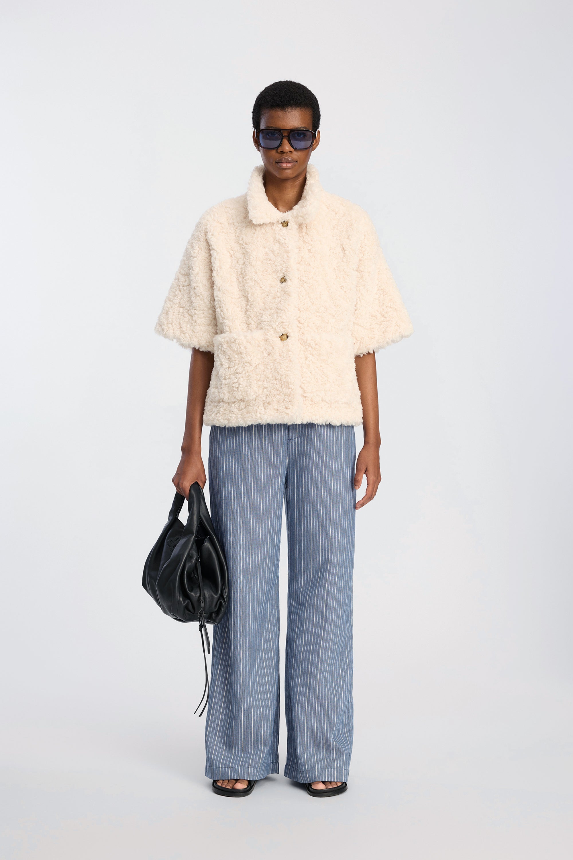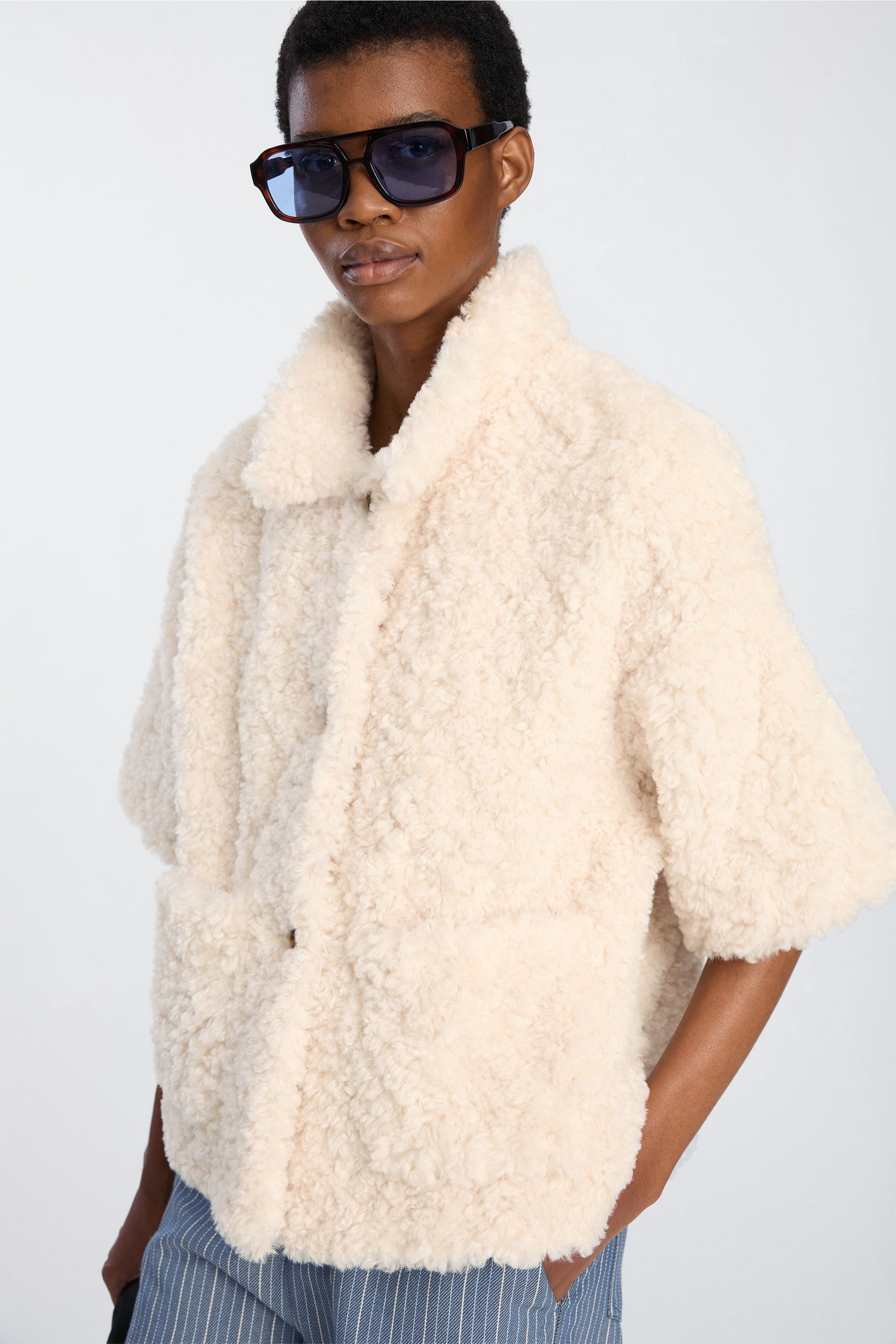 This jacket is crafted in a soft teddy texture and designed with a relaxed, slightly boxy silhouette. It features short, wide sleeves, a classic collar, two front pockets, and a simple button closure. The textured surface bring depth to the design, while the roomy fit makes it an easy layering piece throughout the season.