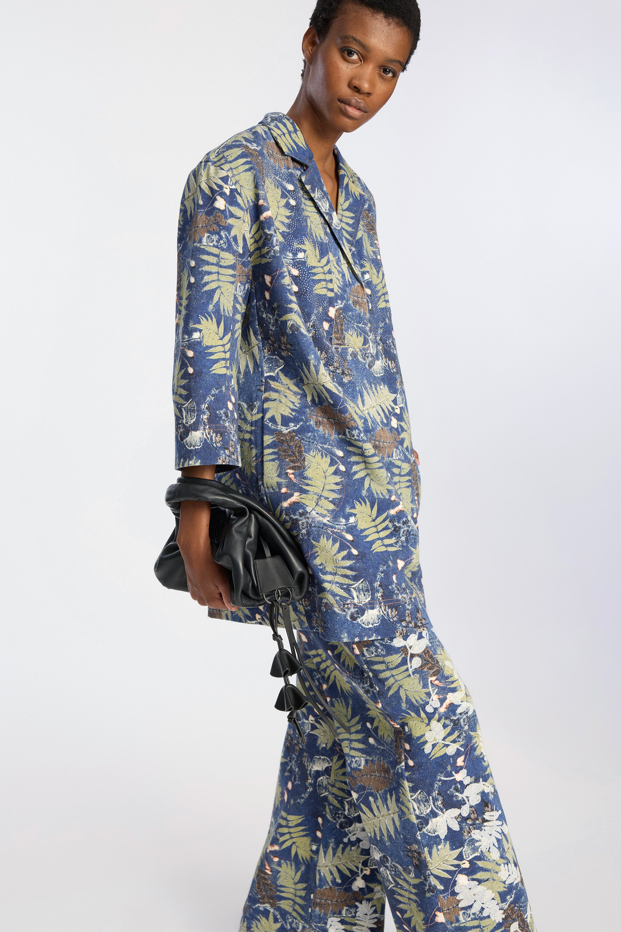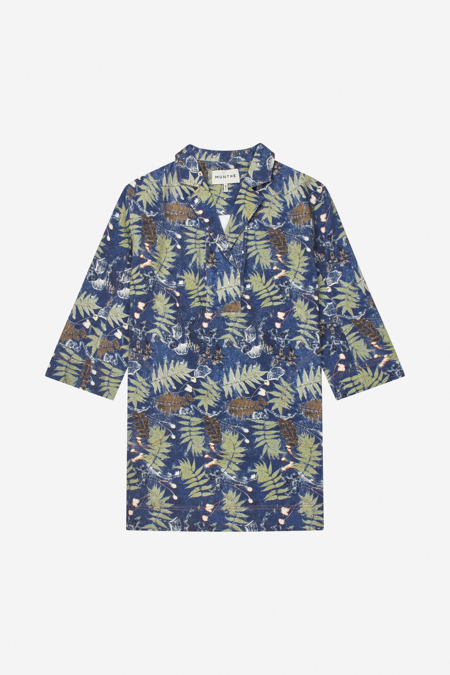 Dress crafted from a lightweight woven fabric featuring a botanical print in deep blue and green tones. It has a straight silhouette, a V-neckline with a small collar, and three-quarter sleeves for a relaxed, well-balanced look.