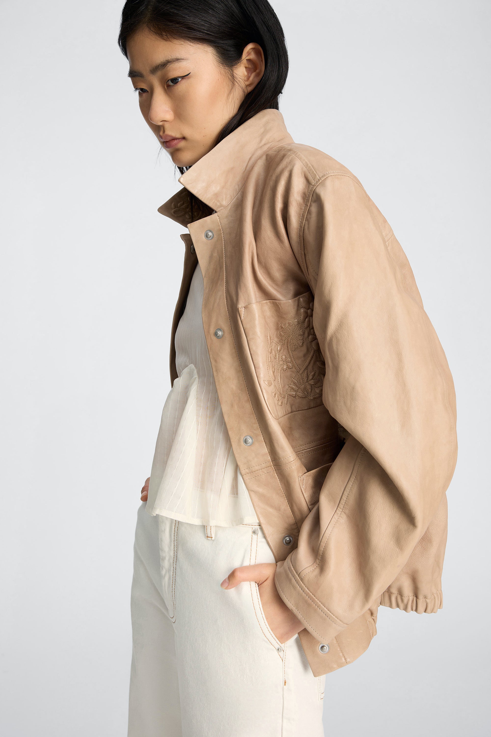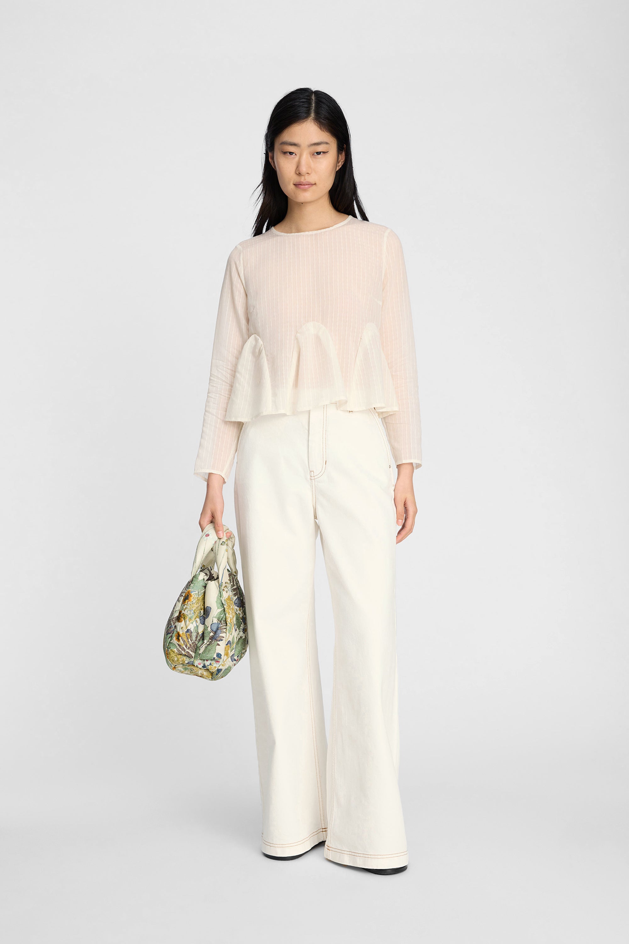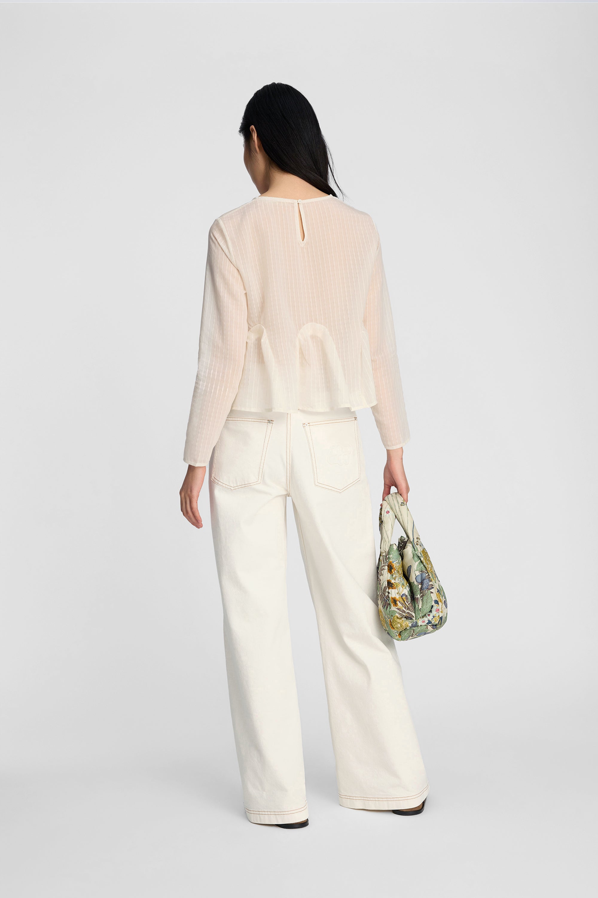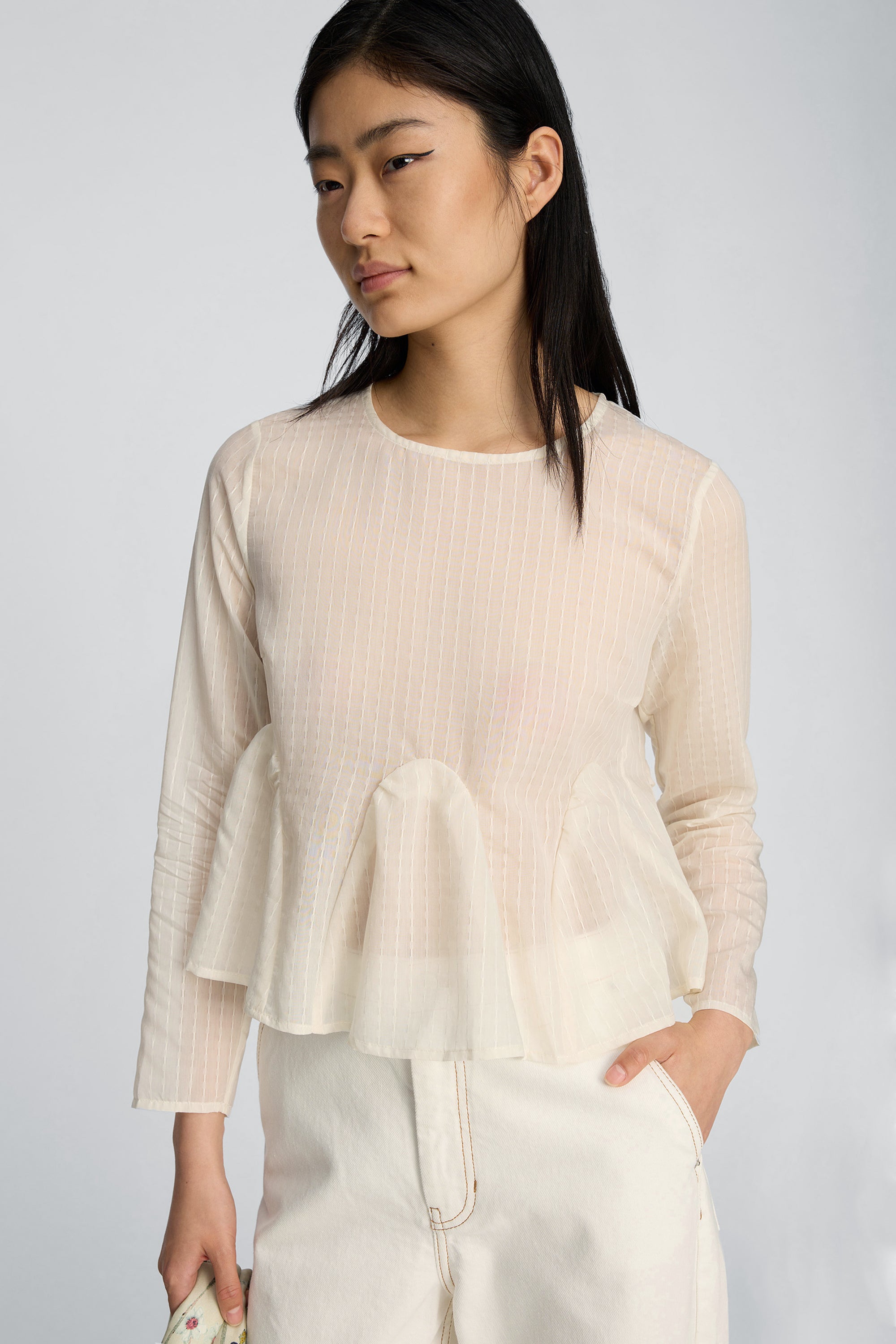 Blouse crafted from a lightweight fabric with subtle vertical stitch detailing, a round neckline and long sleeves. The design is finished with a gentle peplum effect at the hem and a discreet button closure at the back.