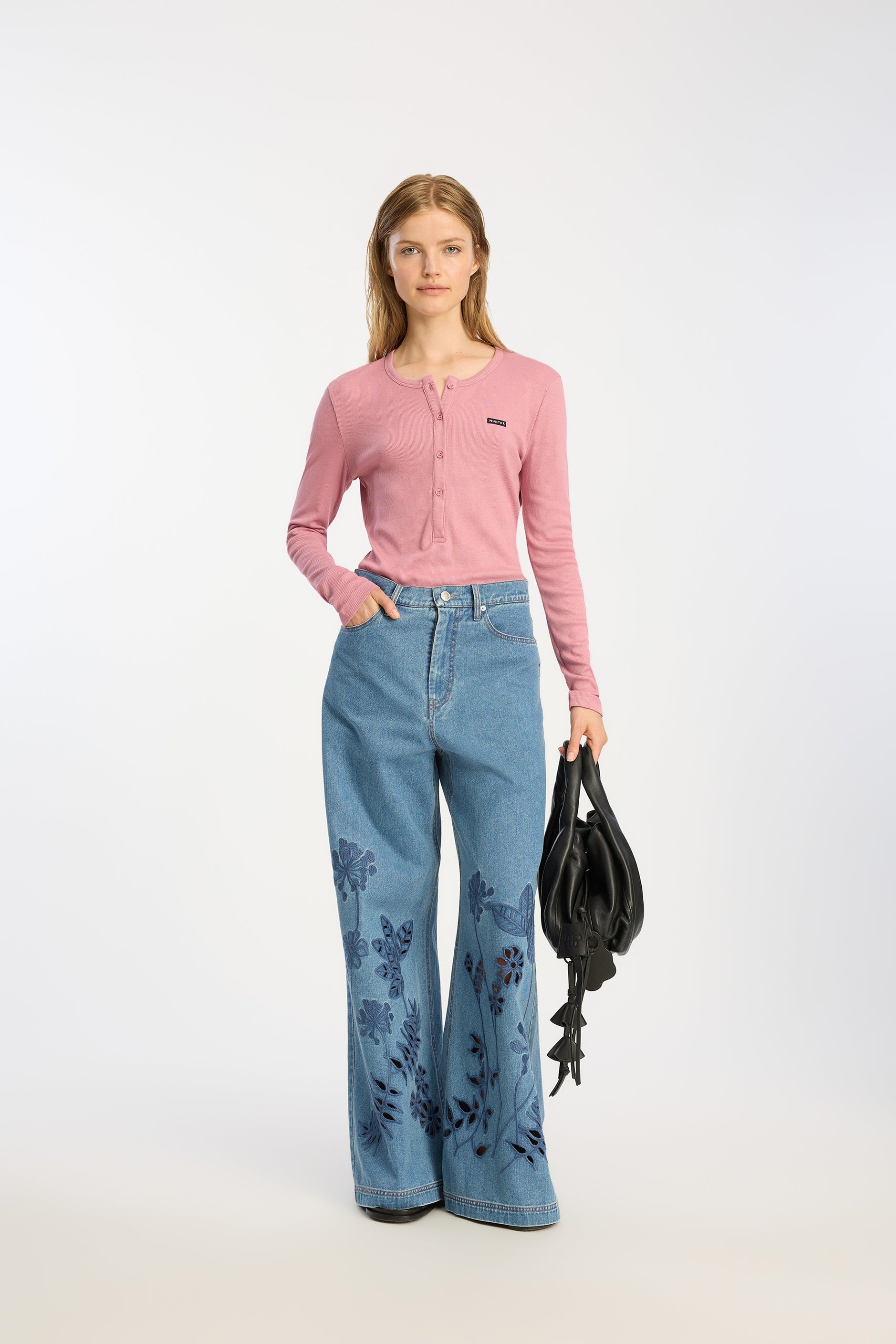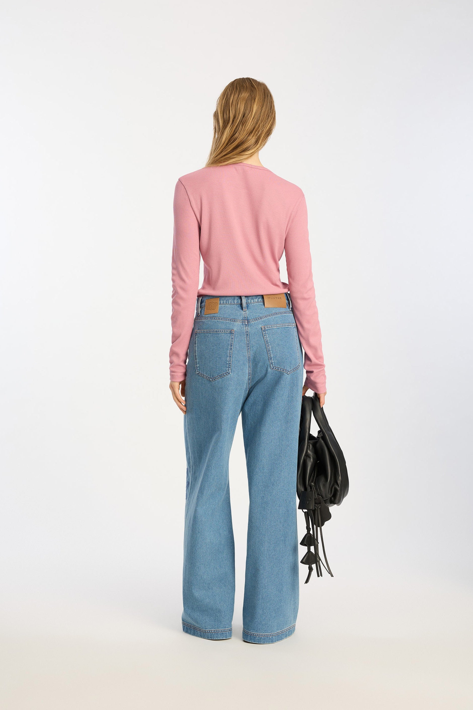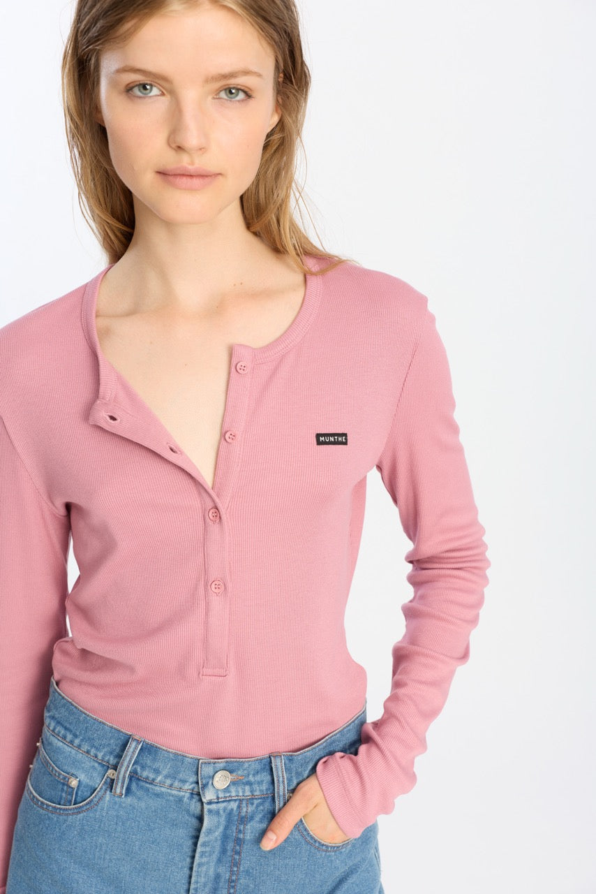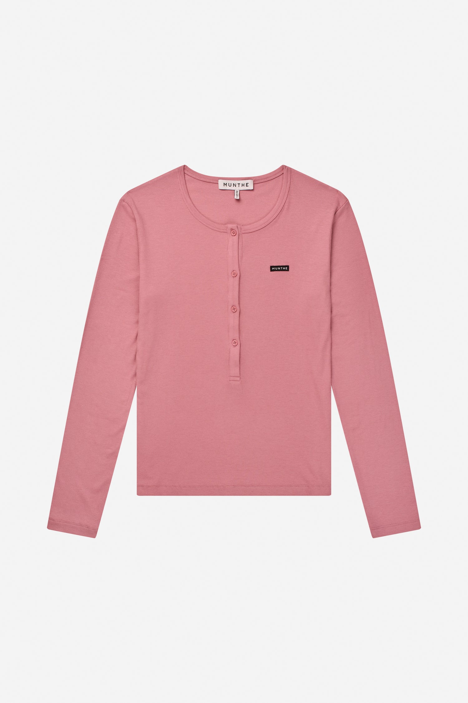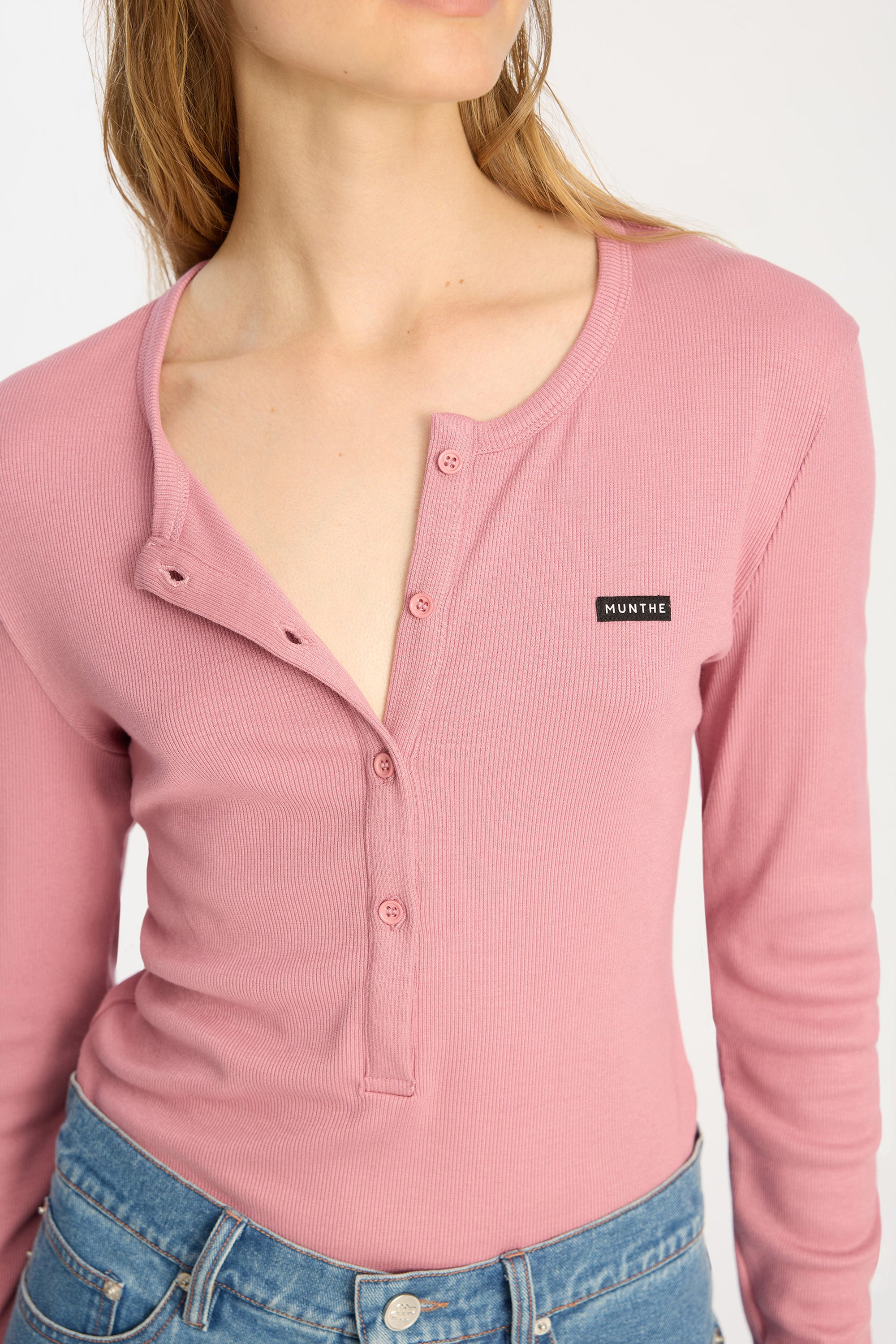 A ribbed T-shirt with an elegant half-button closure and small MUNTHE logo-detail on the chest. This T-shirt has long sleeves and is designed with a round neckline.