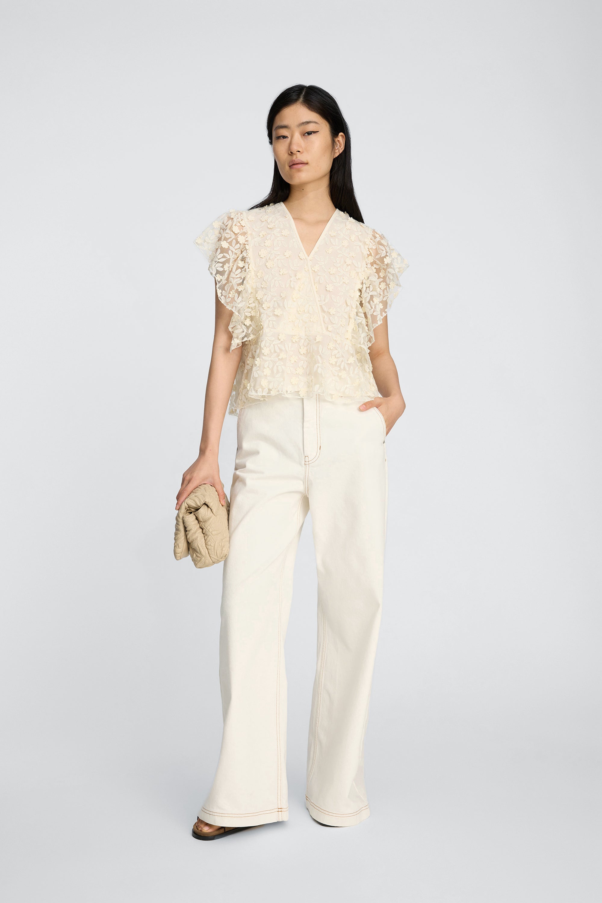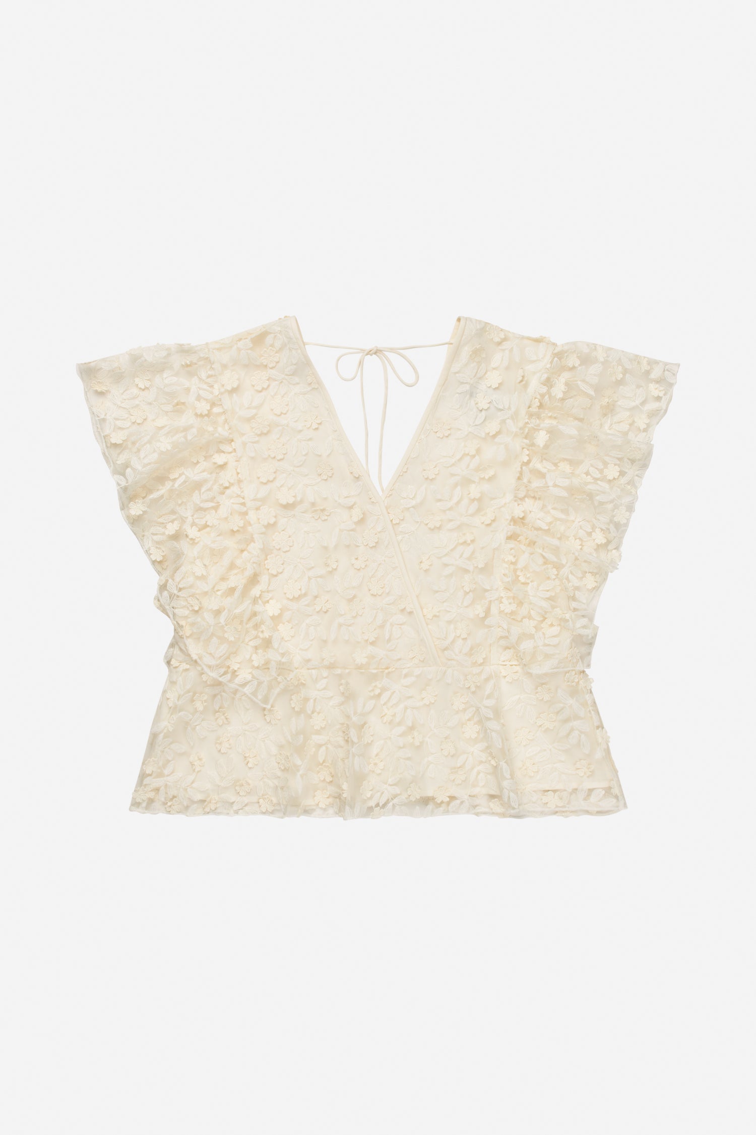 Lace top with delicate floral details. The top features a V-neck at the front and back, short sleeves, a tie detail at the back, and a regular fit with a subtle peplum at the hem.