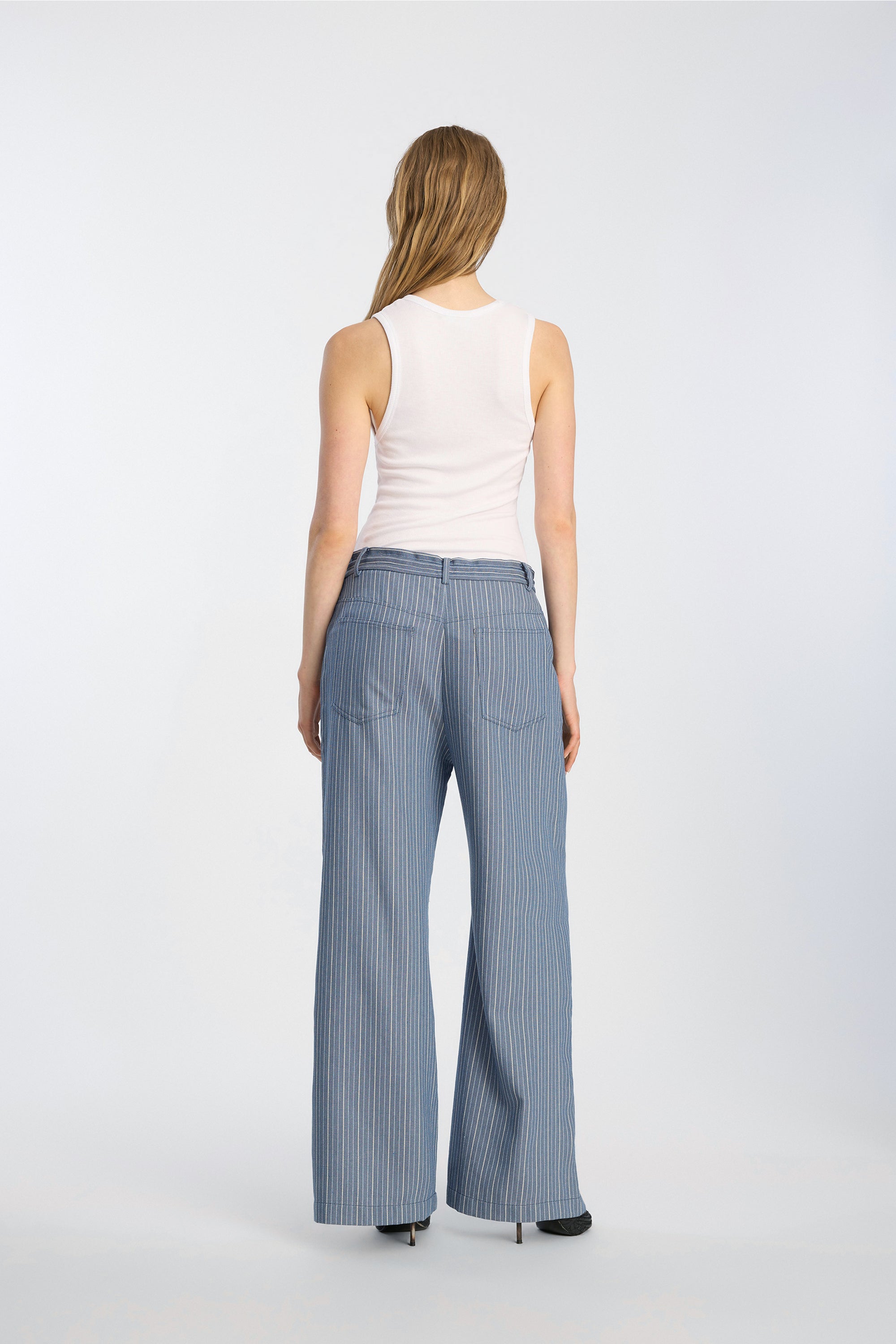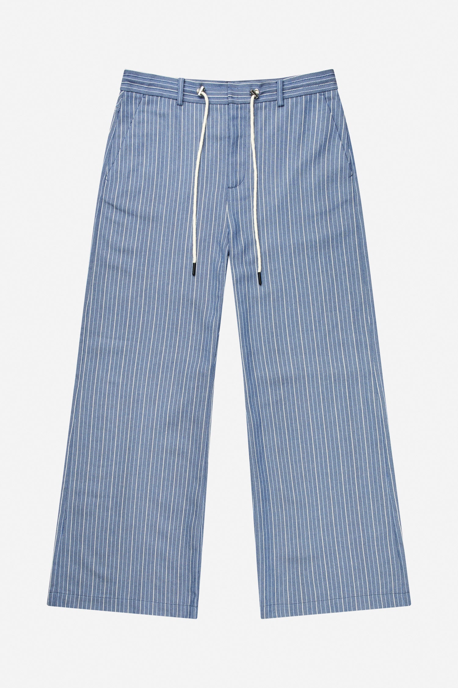 Trousers with a a wide leg silhouette, striped fabric, and an adjustable drawstring at the waist for added comfort and flexibility. A versatile style that strikes the perfect balance between relaxed and polished.