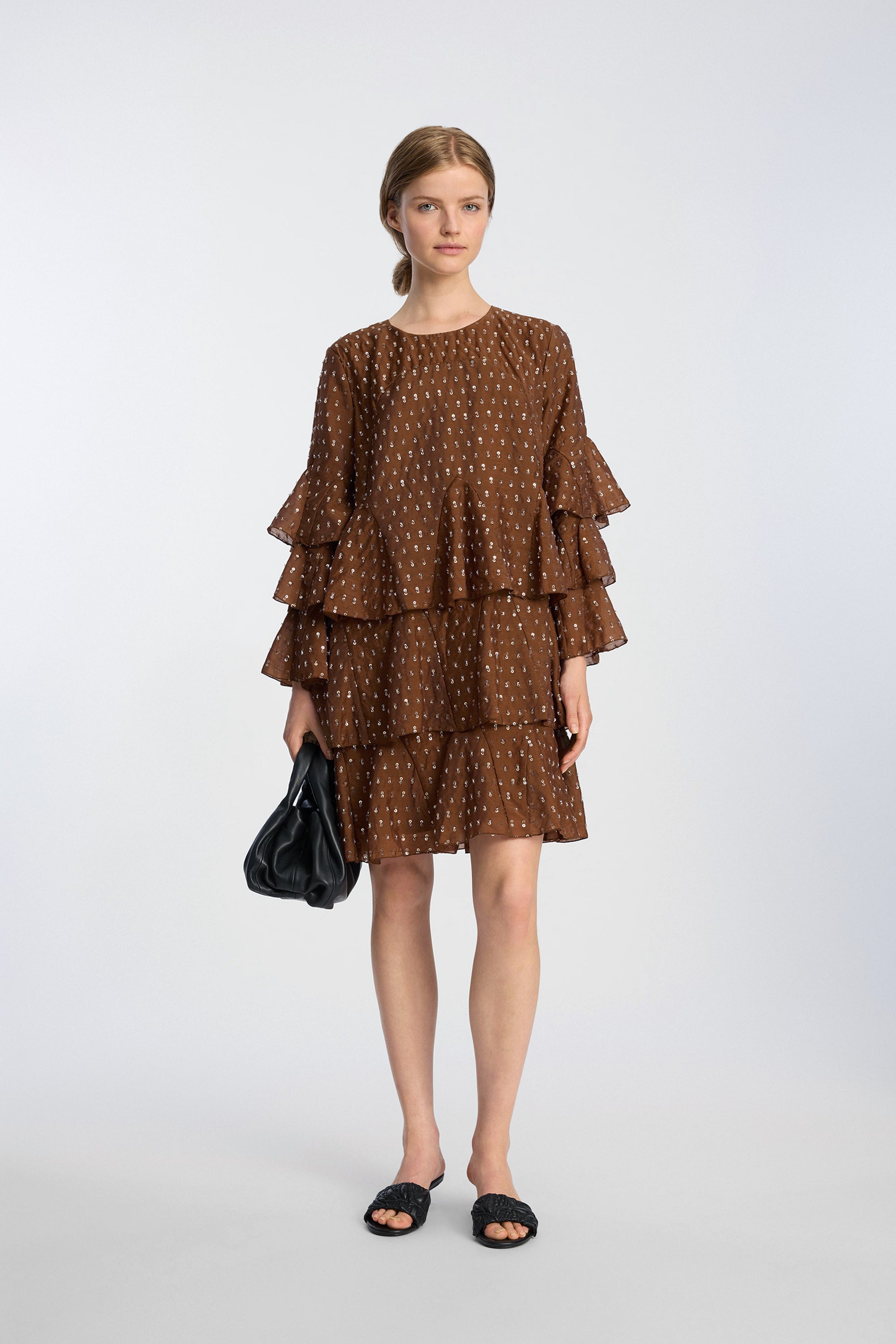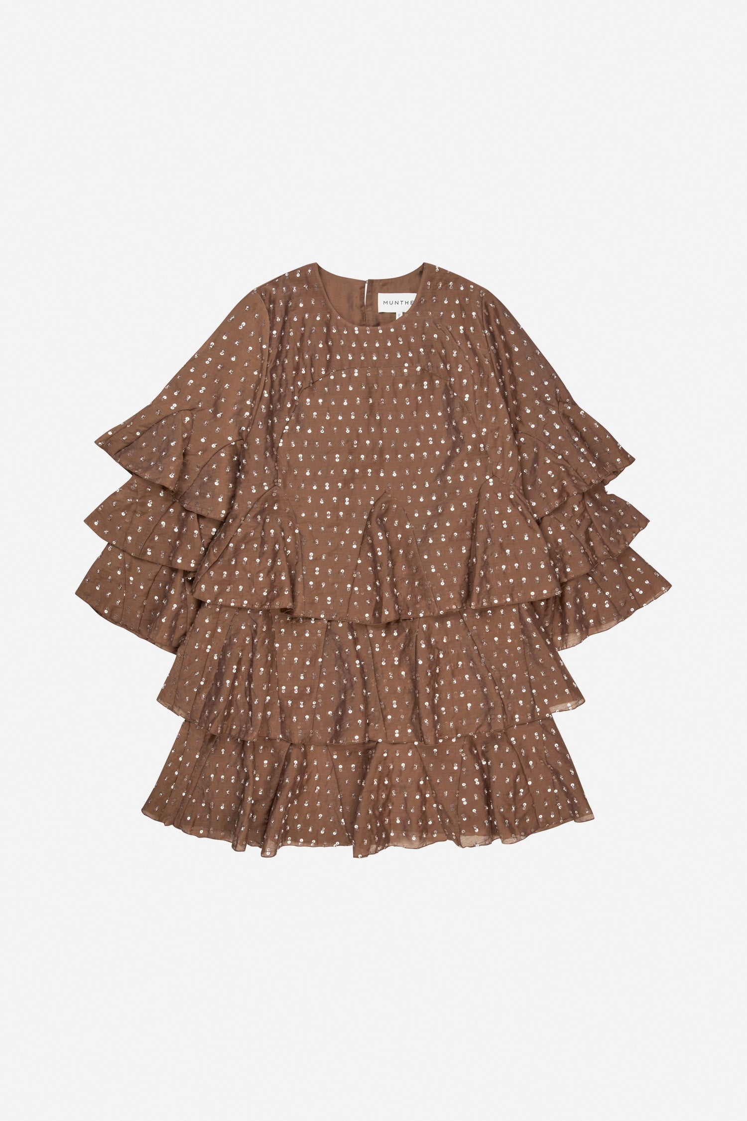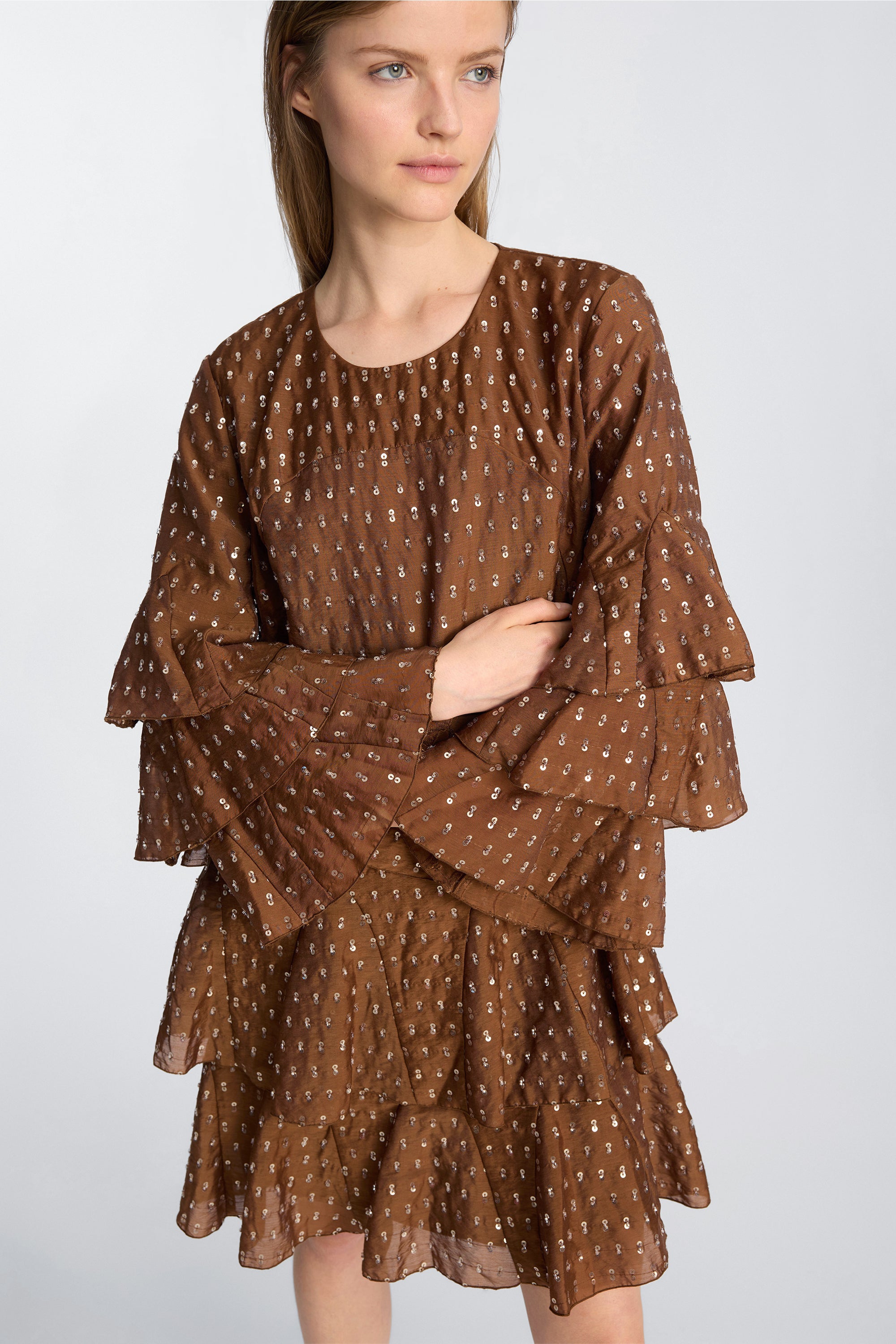 Dress crafted from a lightweight woven fabric embellished with small sequins and pearl details. The design features a round neckline, short sleeves with wide, layered ruffles, and a relaxed fit that offers an airy, voluminous drape. The ruffle layers extend through the skirt, adding structure and movement to the dress.