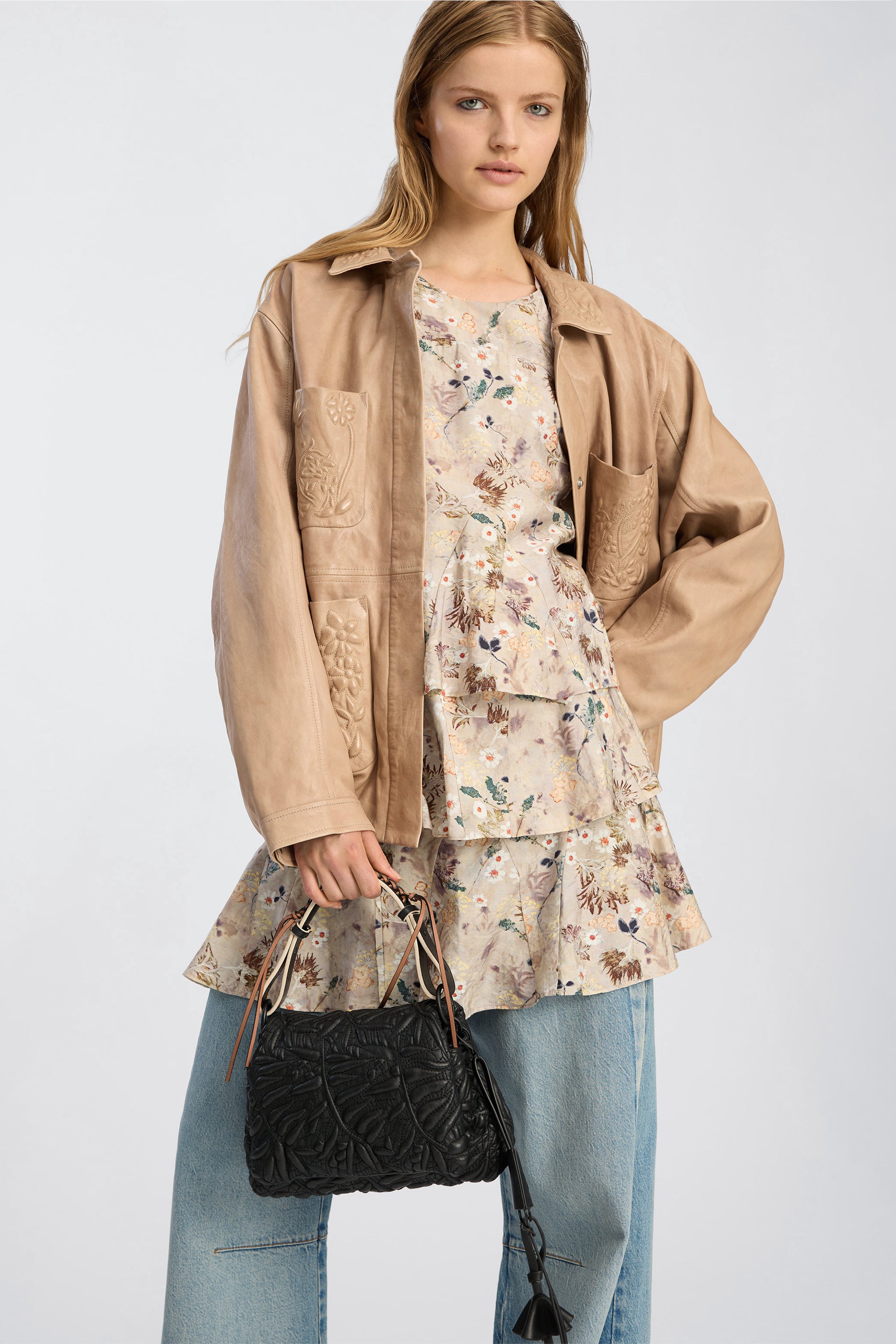 Dress crafted from a lightweight woven fabric embellished with a floral botanical pattern. The design features a round neckline, short sleeves with wide, layered ruffles, and a relaxed fit that offers an airy, voluminous drape. The ruffle layers extend through the skirt, adding structure and movement to the dress.
