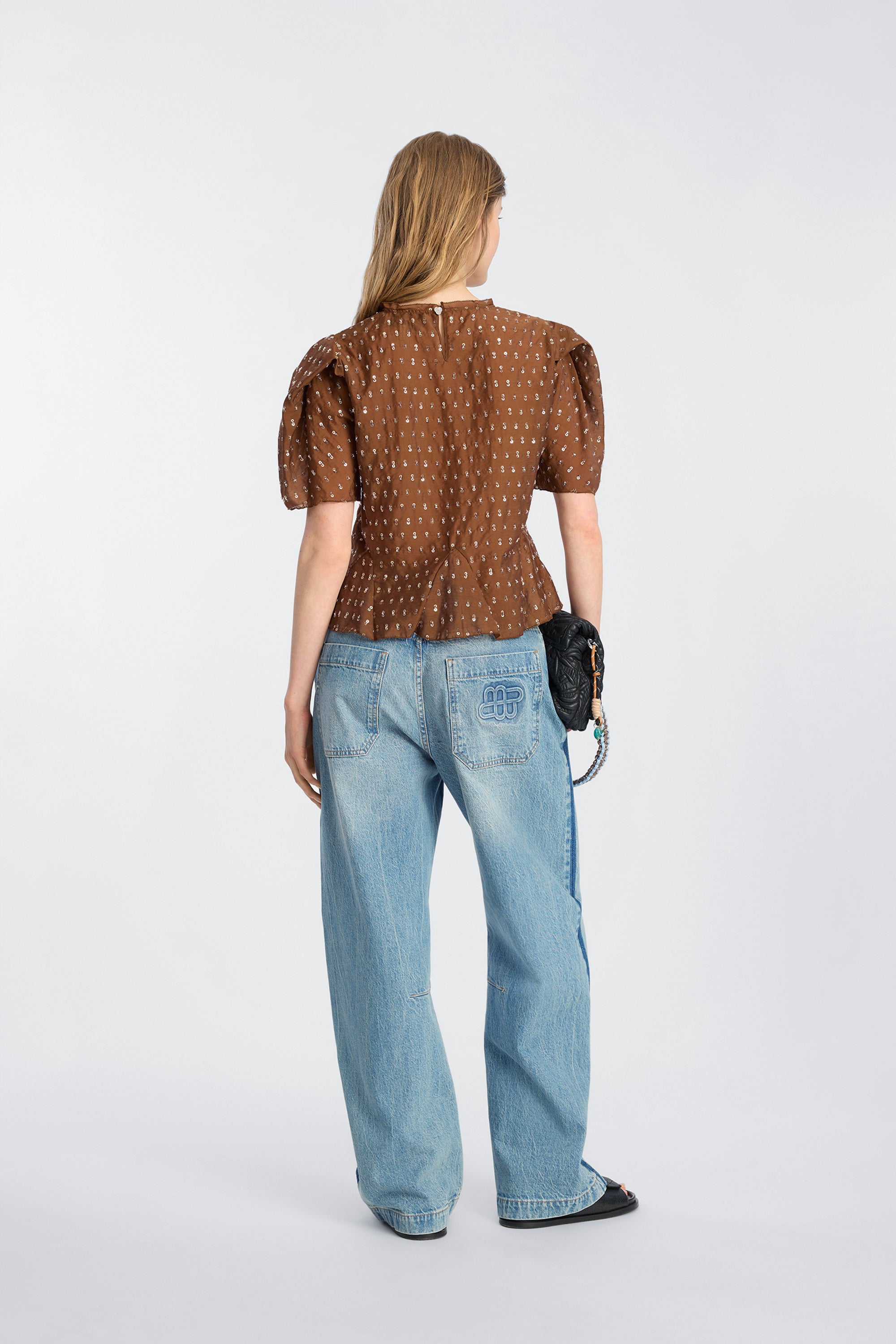Top with sequin detailing, lightly puffed short sleeves, a round neckline, and peplum detailing at the hem.