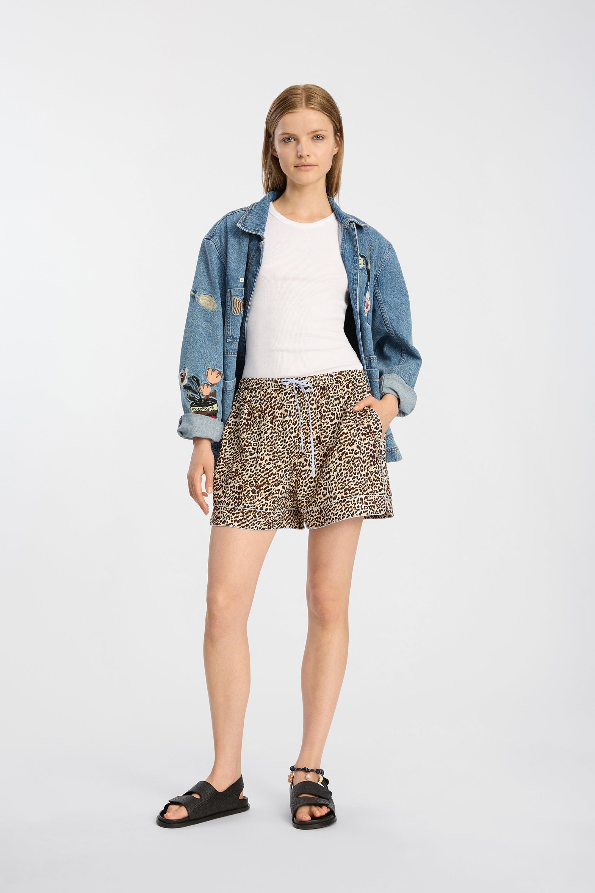 These shorts feature a classic leopard print with subtle contrast stitching along the edges. The silhouette is relaxed and finished with an adjustable drawstring waist.