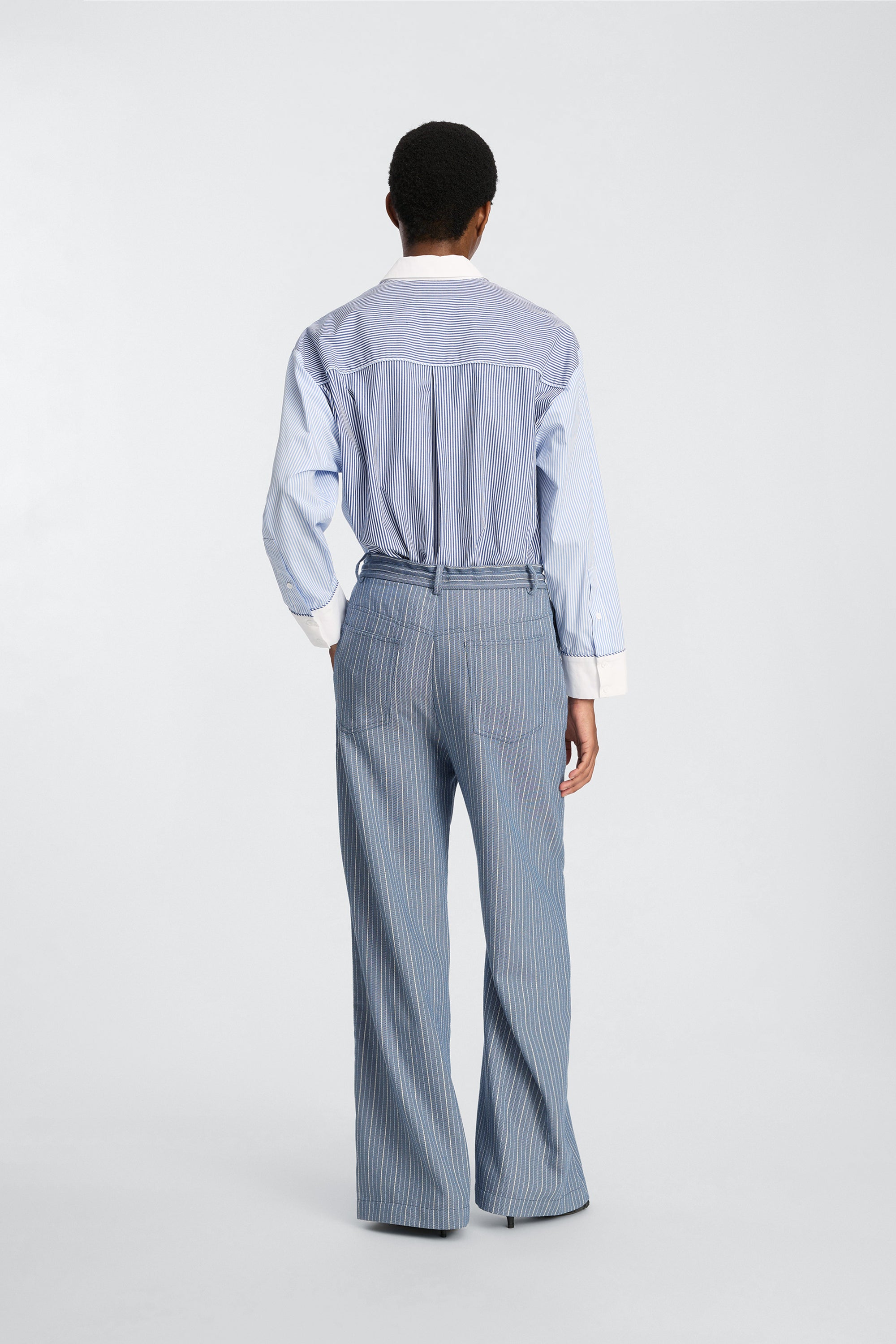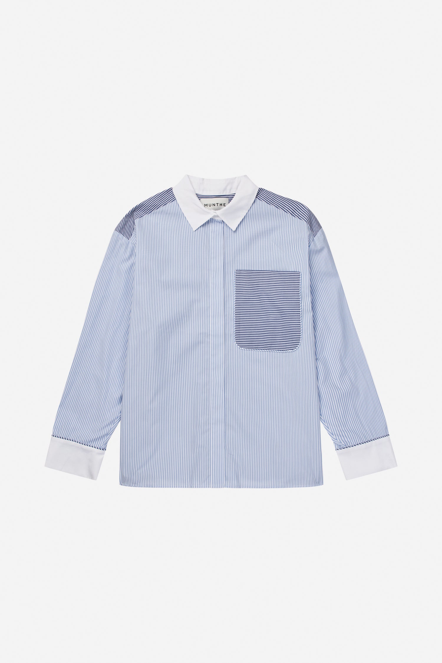 Striped shirt with contrasting white collar and a chest pocket and shoulder panels in a matching striped pattern. It features long sleeves with white cuffs, a concealed button closure, and has a loose fit.