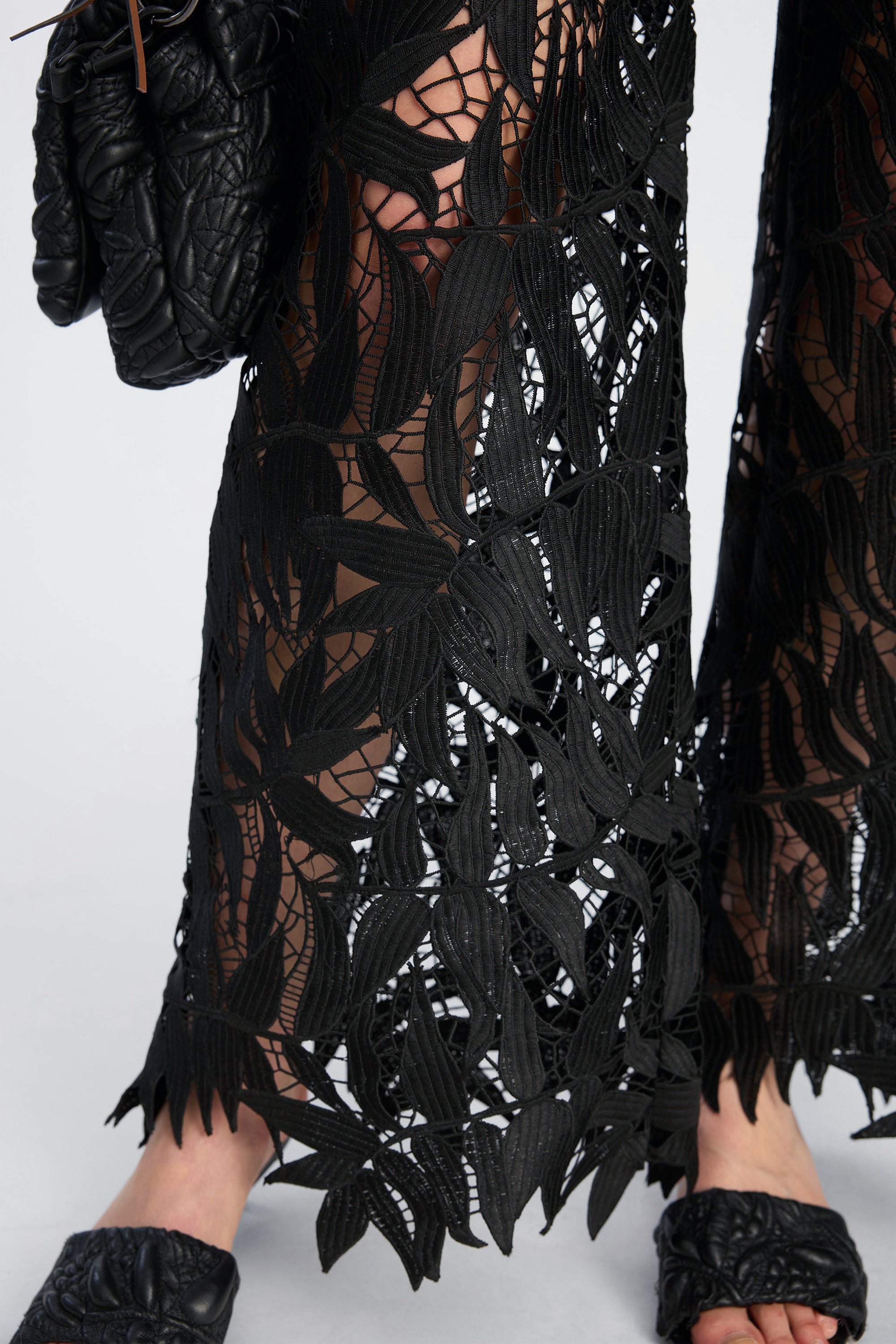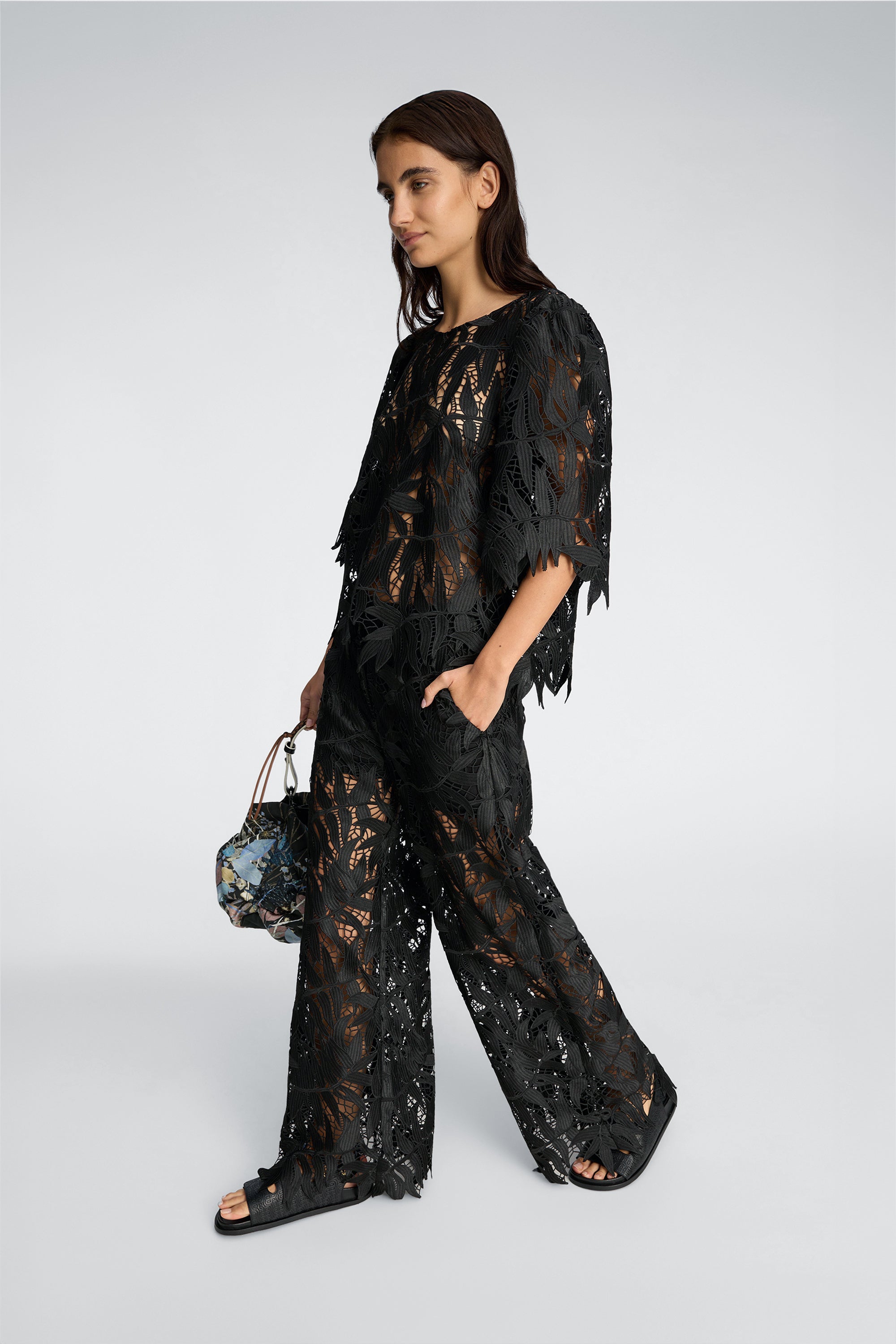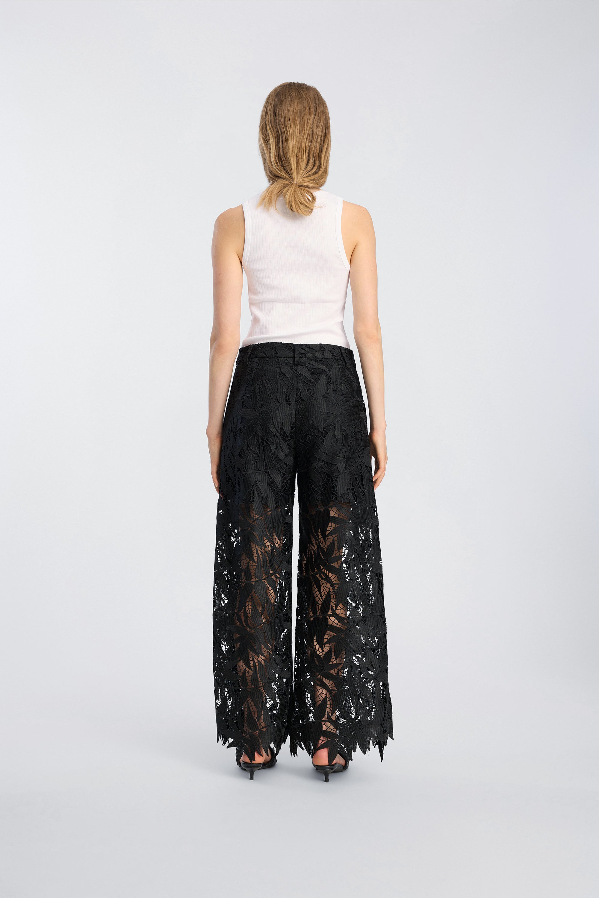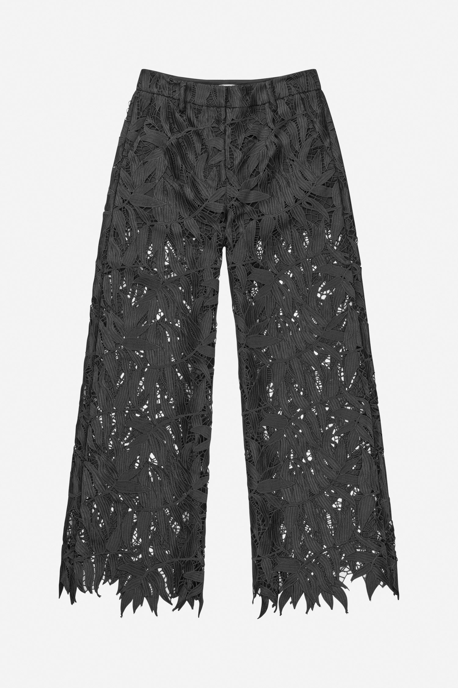 Trousers in lace featuring a bold leaf pattern and light transparency through the legs. The style includes an elastic waist, straight legs, and raw, cut edges that follow the shape of the motif. A design that works both on its own and as part of a set with our BUBBLE top.