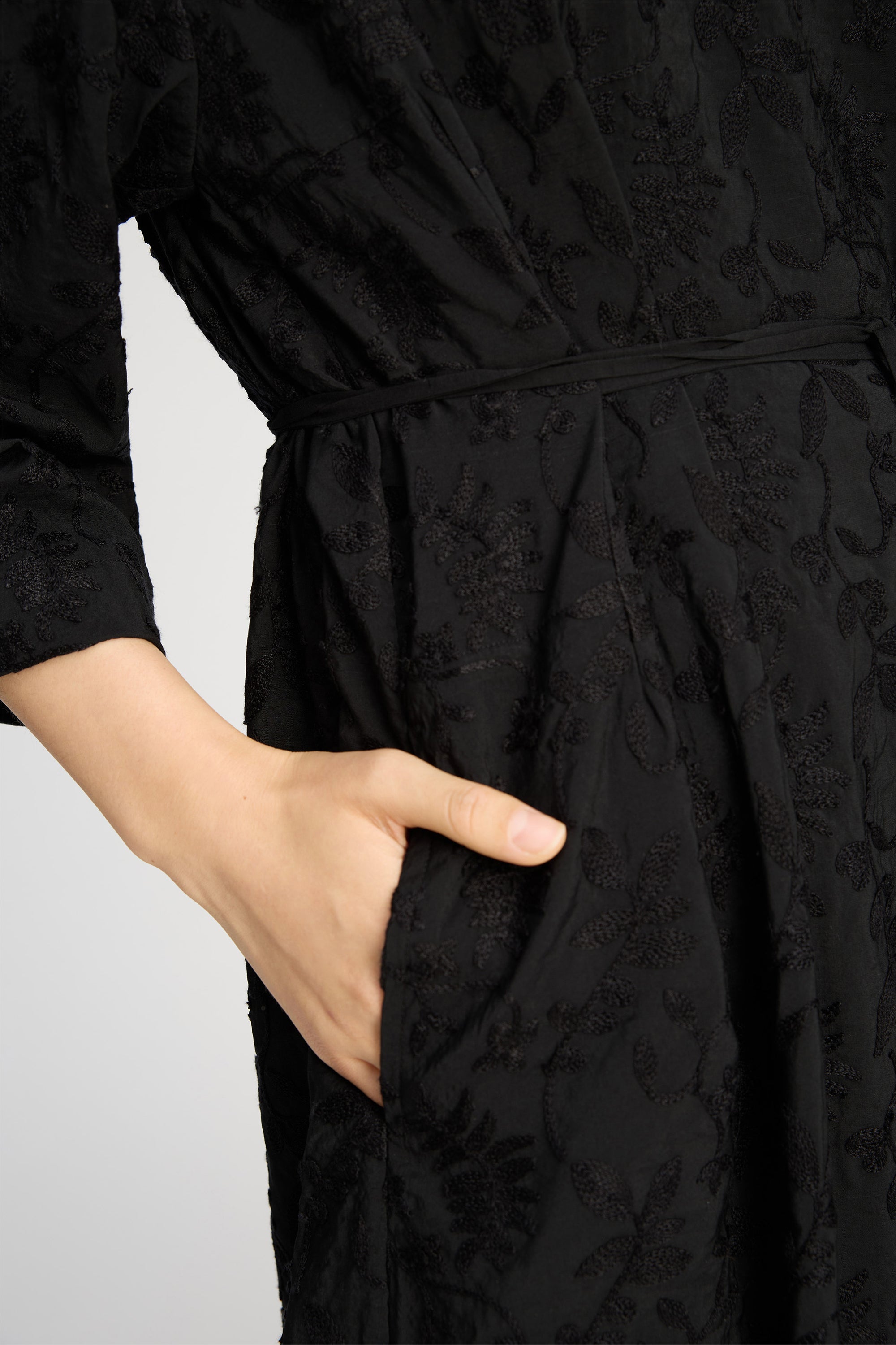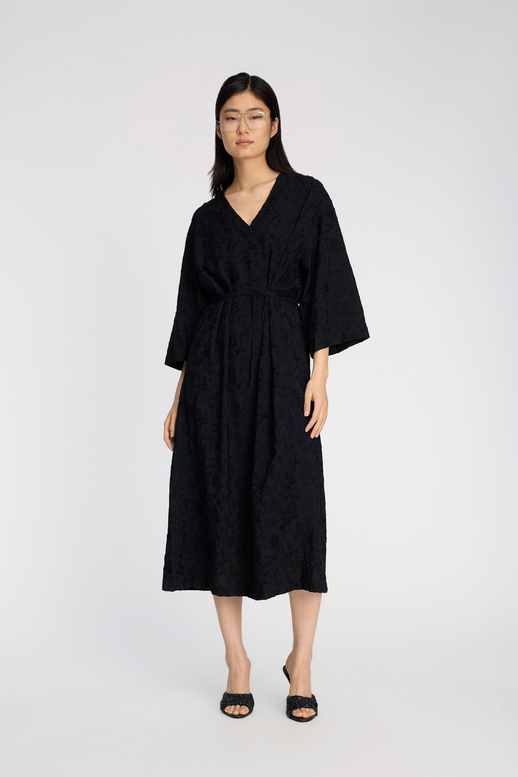 Midi dress crafted from a structured jacquard fabric featuring subtle tonal floral detailing. The style includes a V-neckline, wide sleeves, and a straight silhouette, defined at the waist with a discreet tie fastening. Made in a lightweight woven material with a softly textured surface.