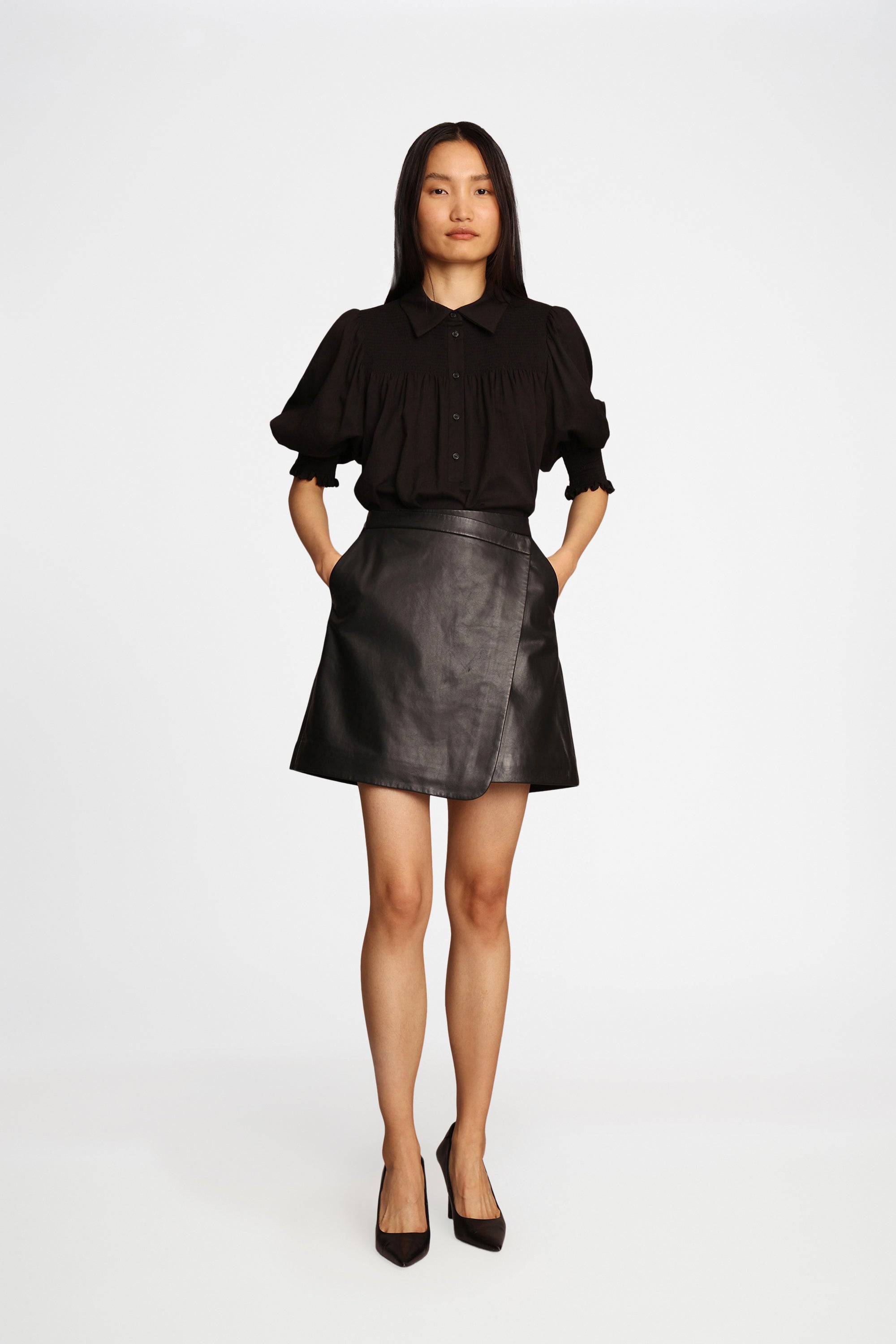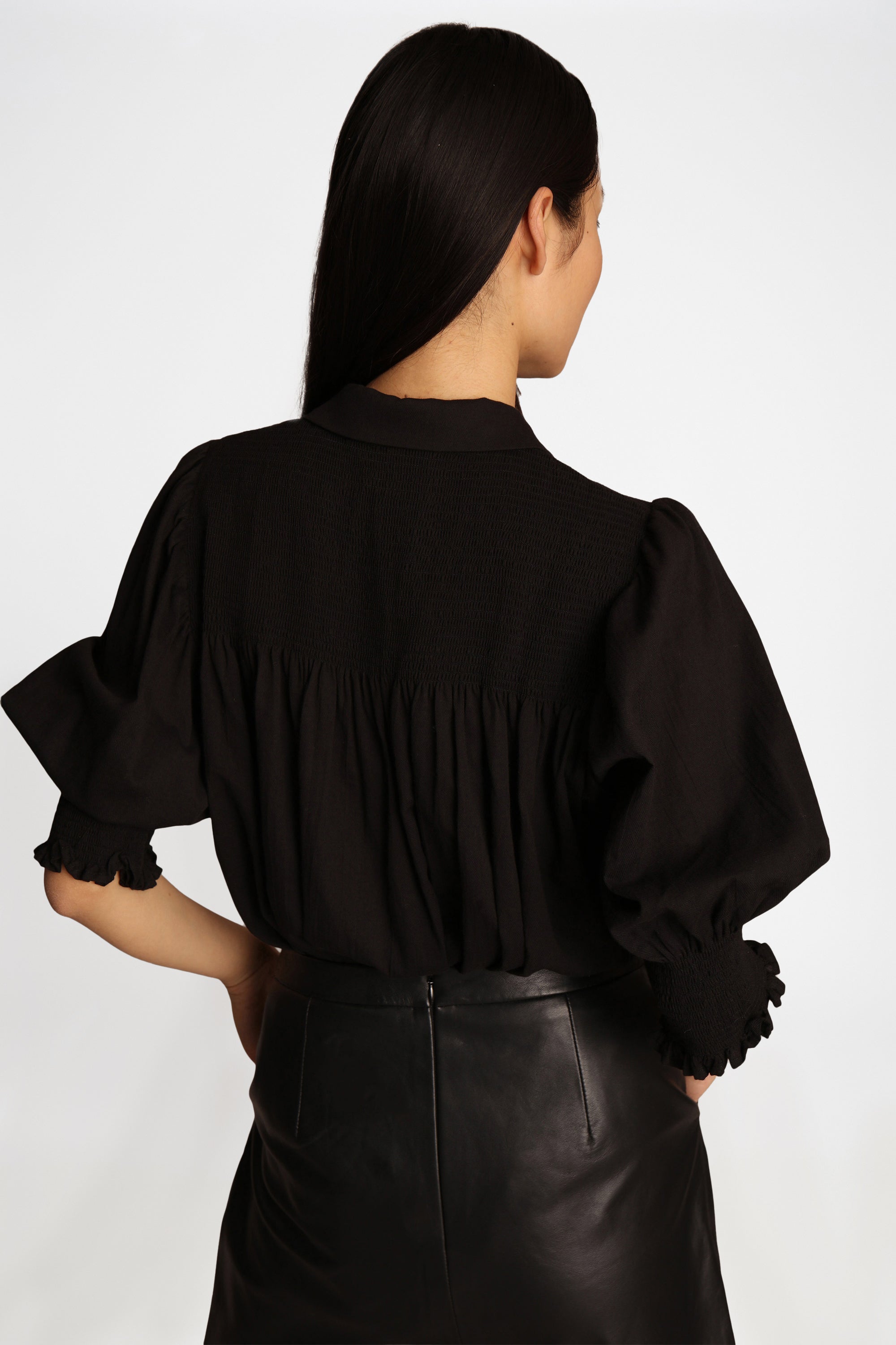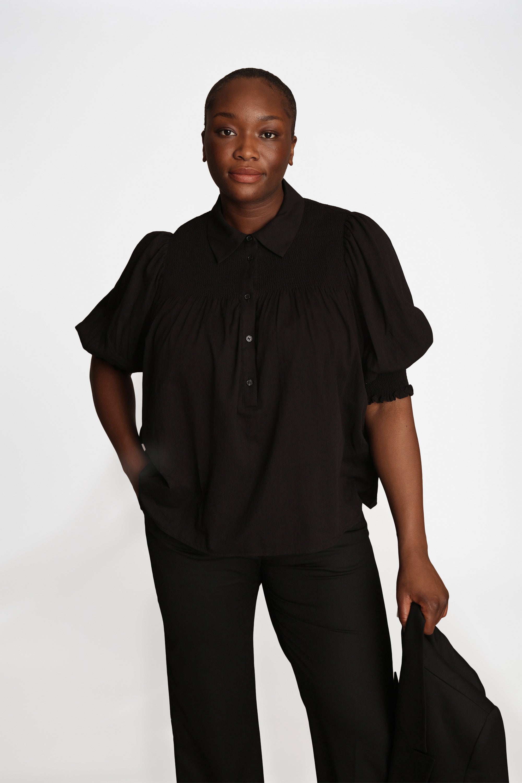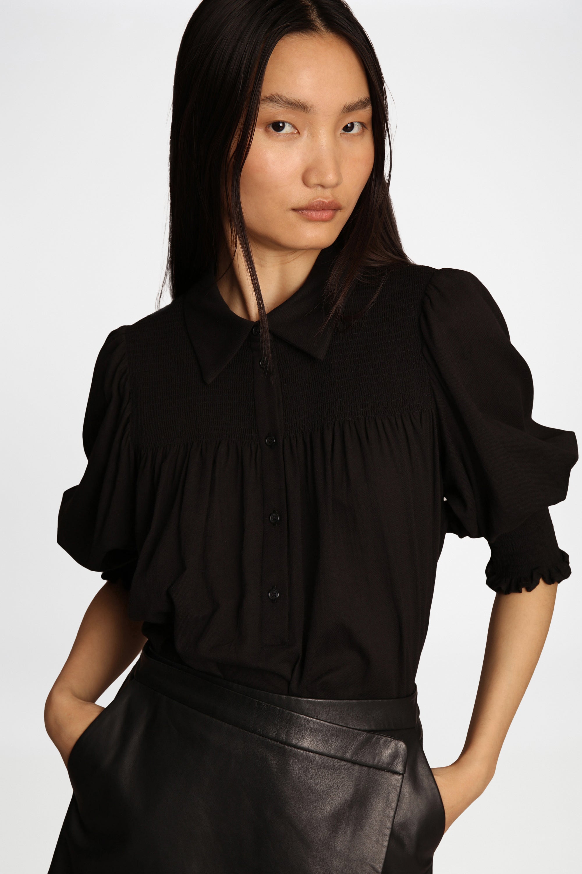 Feminine blouse with beautiful smock details on the sleeves, chest, and back. The shirt has a small collar and a popover front placket, with an elegant button closure.