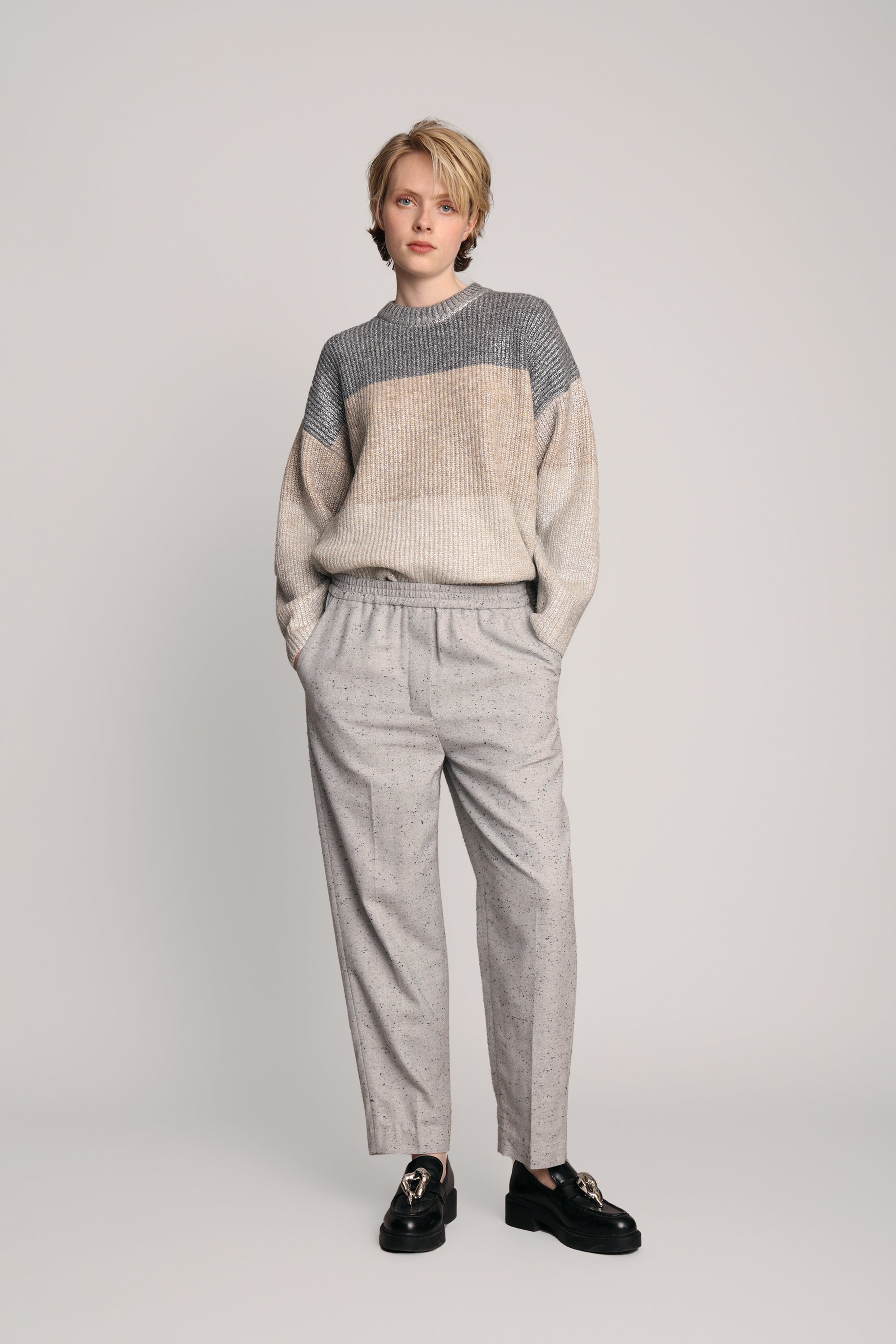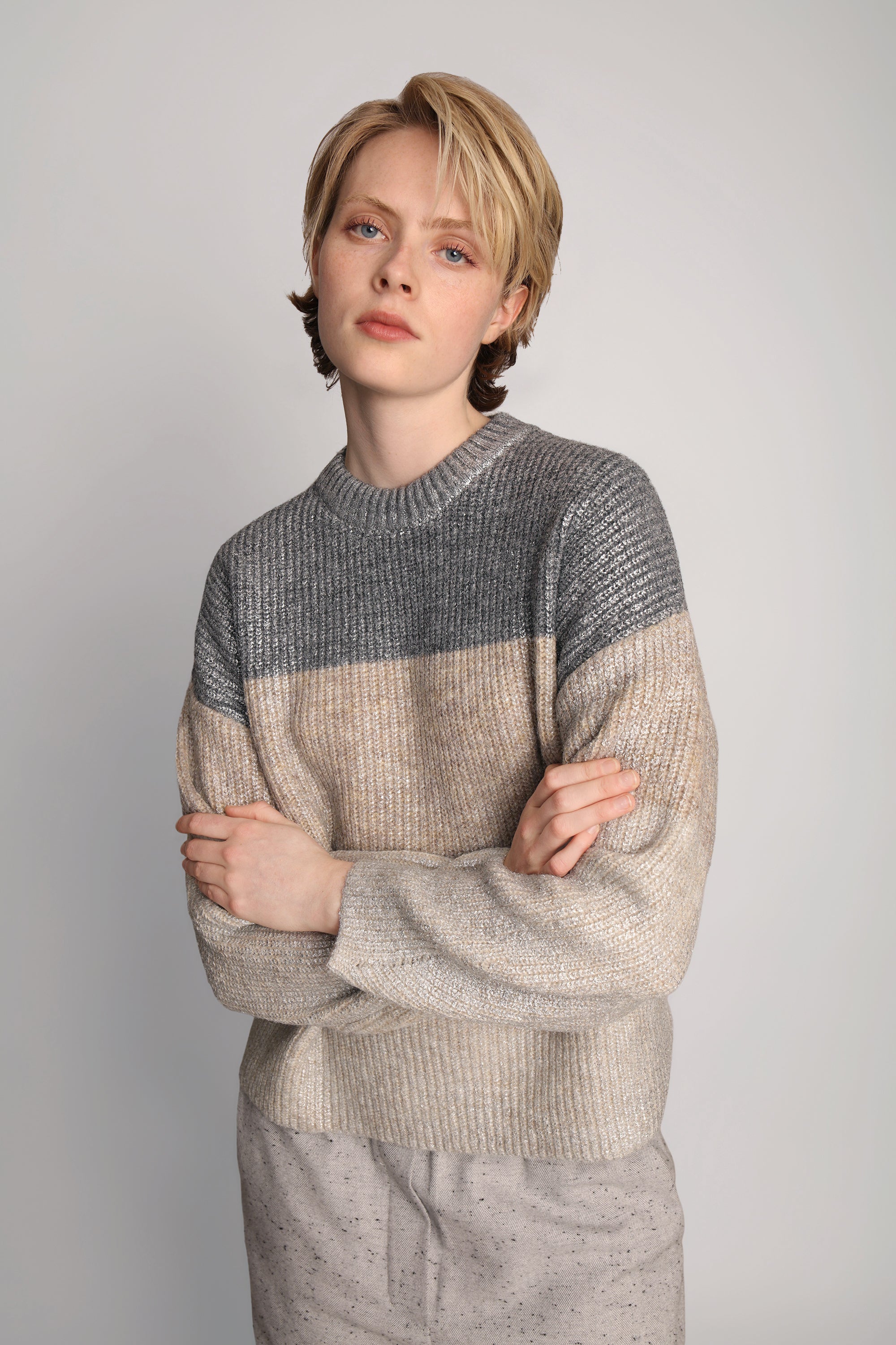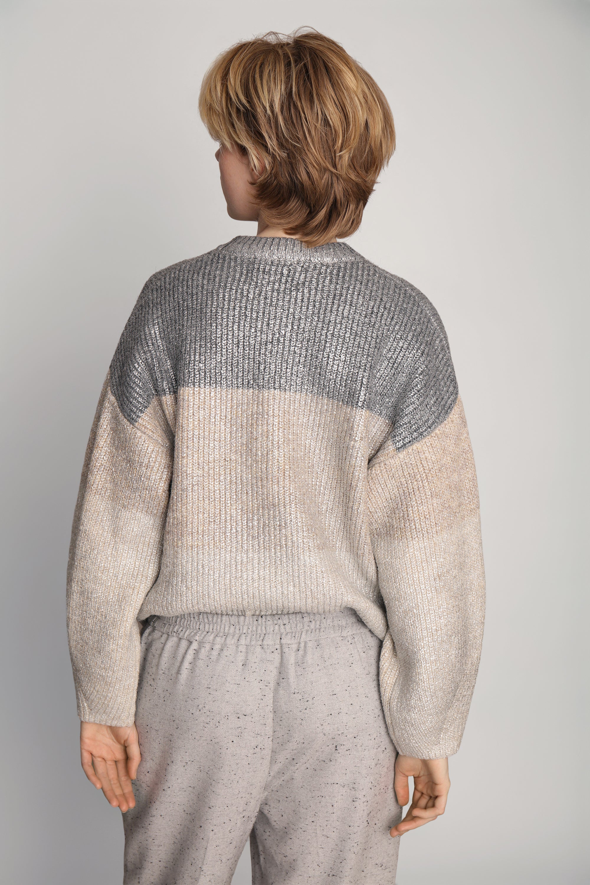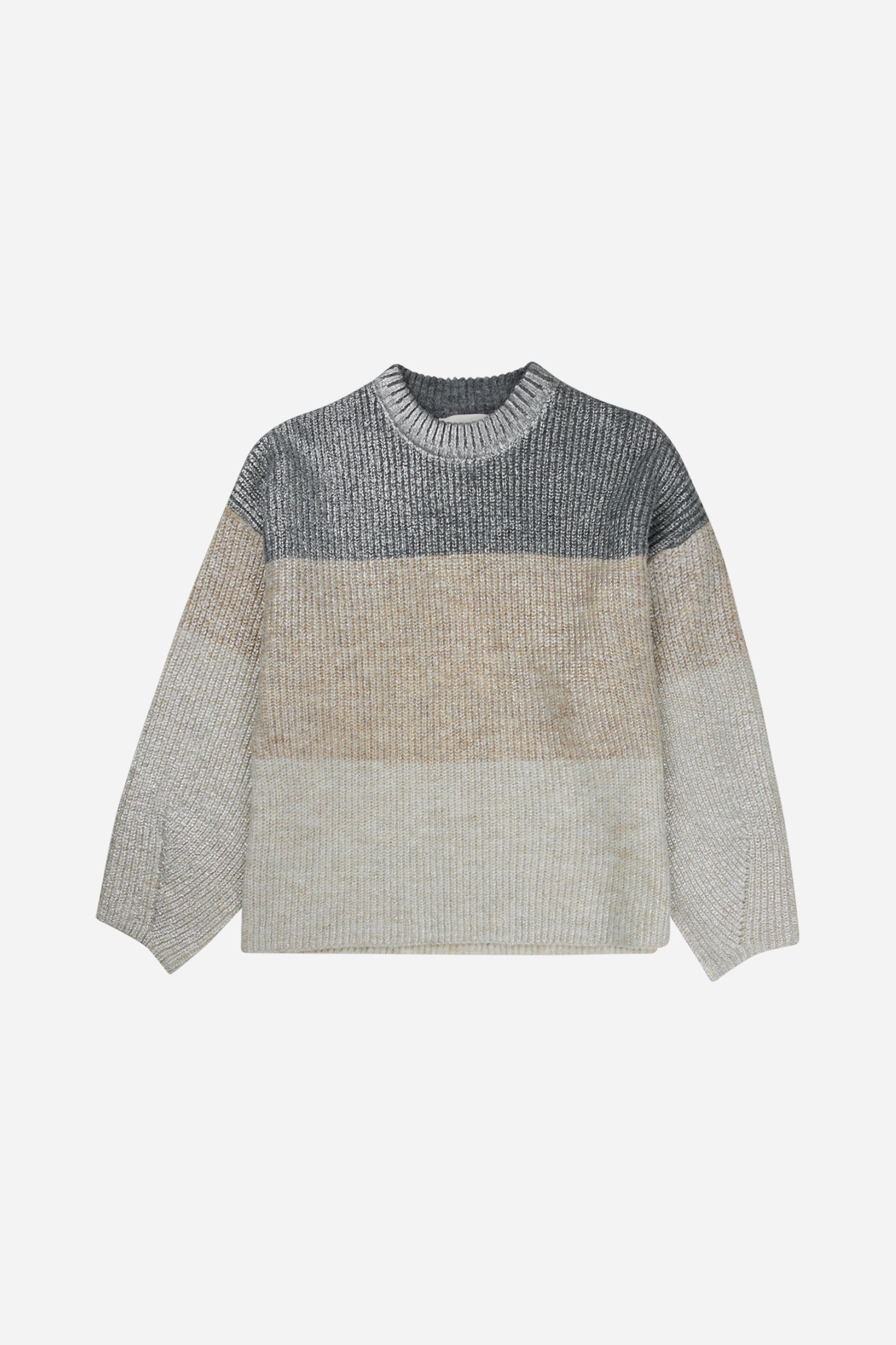 A beautiful striped knit with a metallic finish. The knit has rib edges and a loose fit. Available in the color silver.