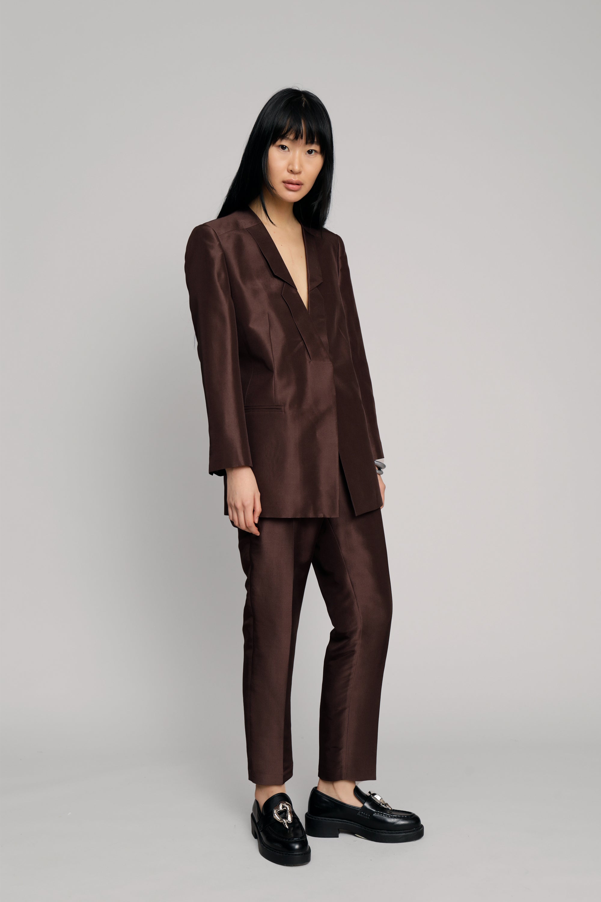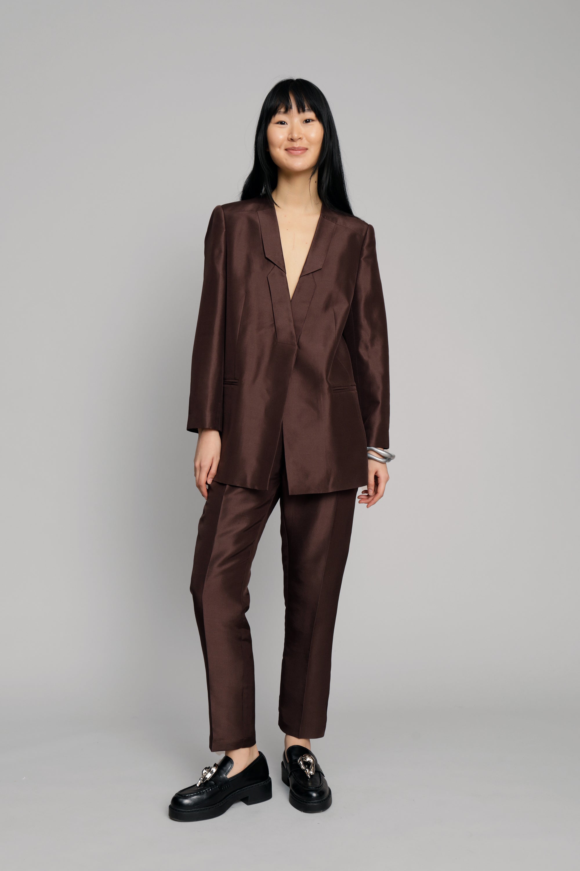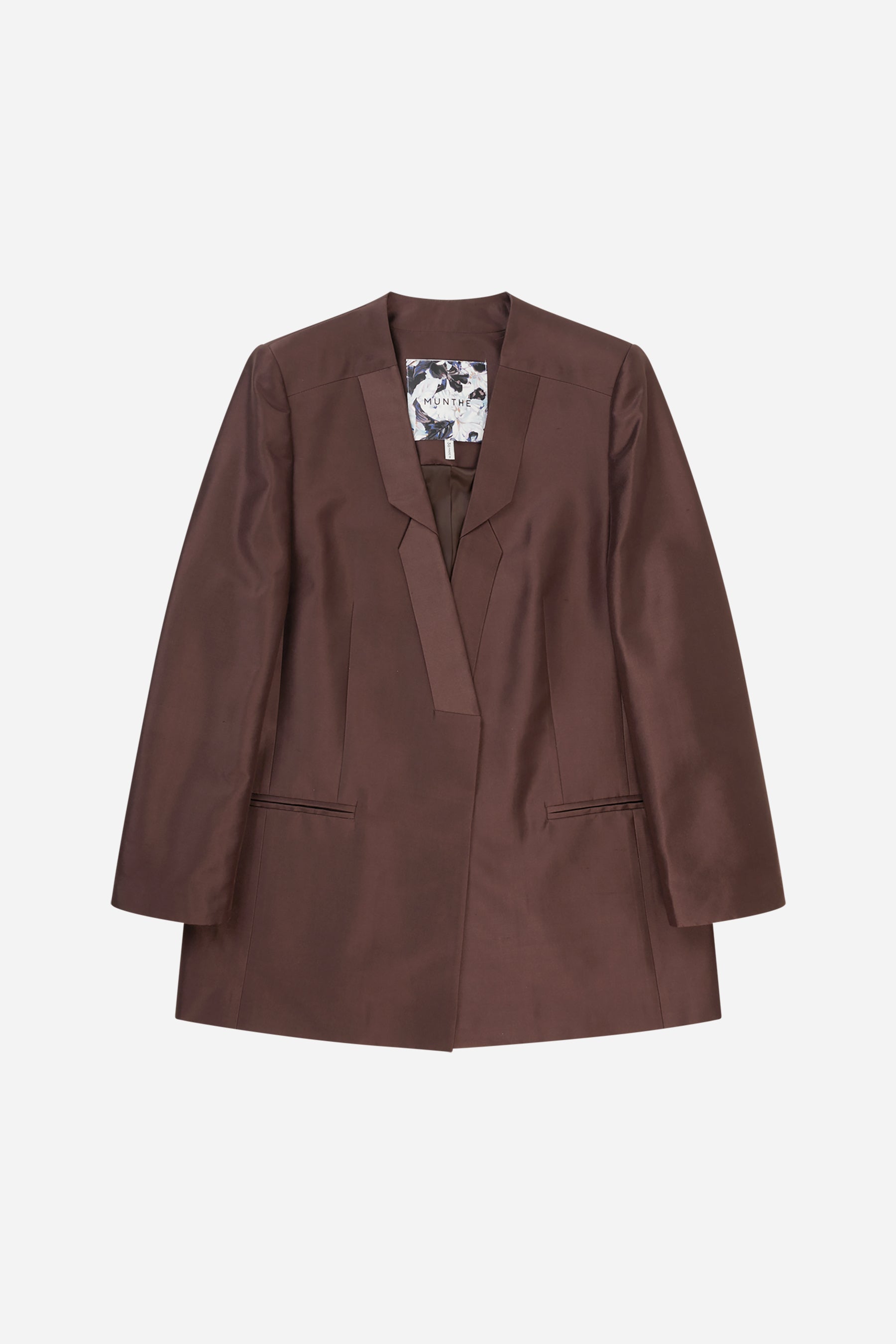 Blazer made from 100% silk, in a regular fit with long sleeves. The blazer has pockets, and a beautifully detailed lapel. Available in the color choco.