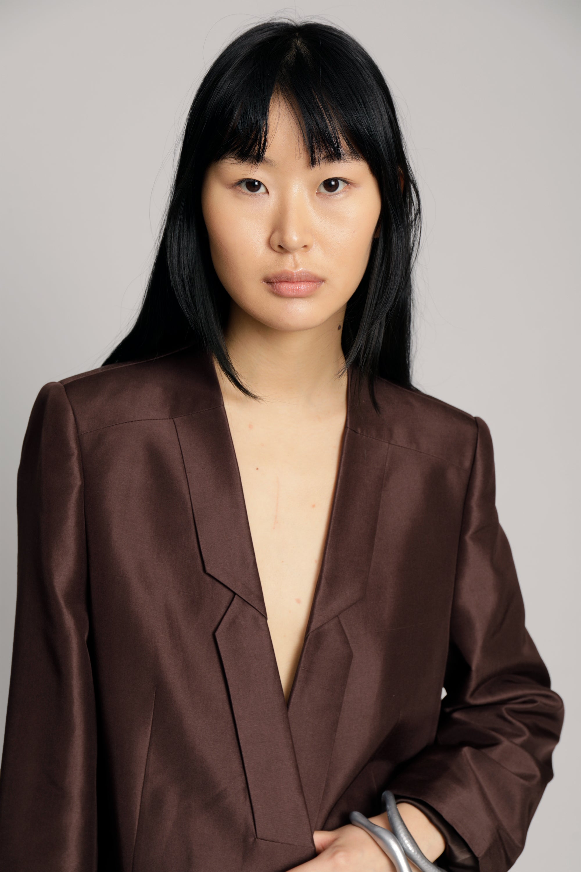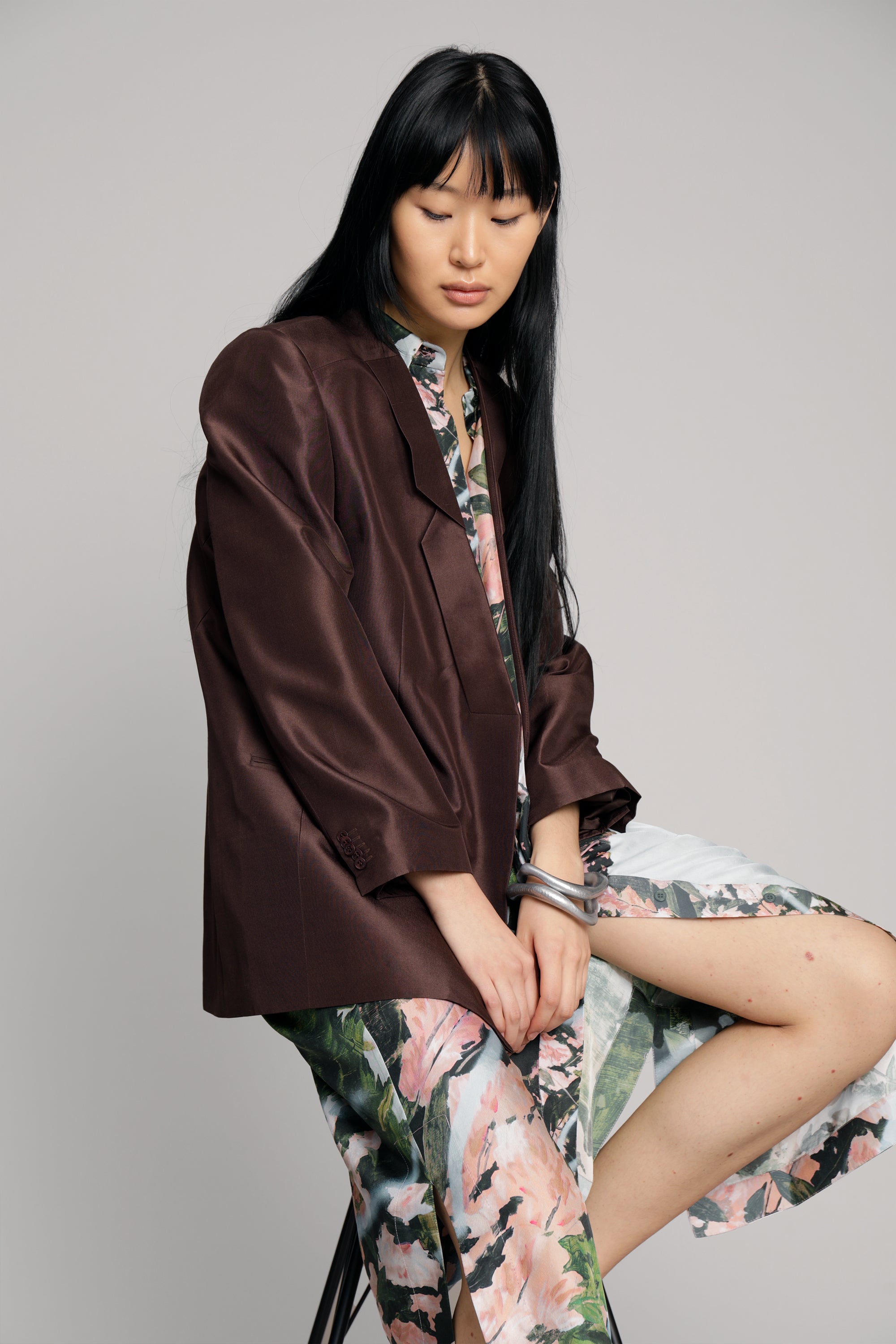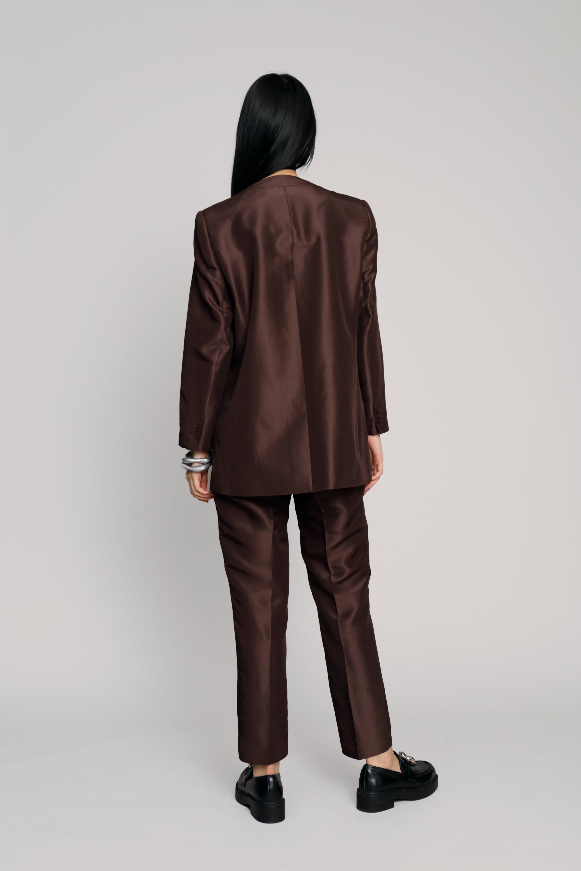 Blazer made from 100% silk, in a regular fit with long sleeves. The blazer has pockets, and a beautifully detailed lapel. Available in the color choco.