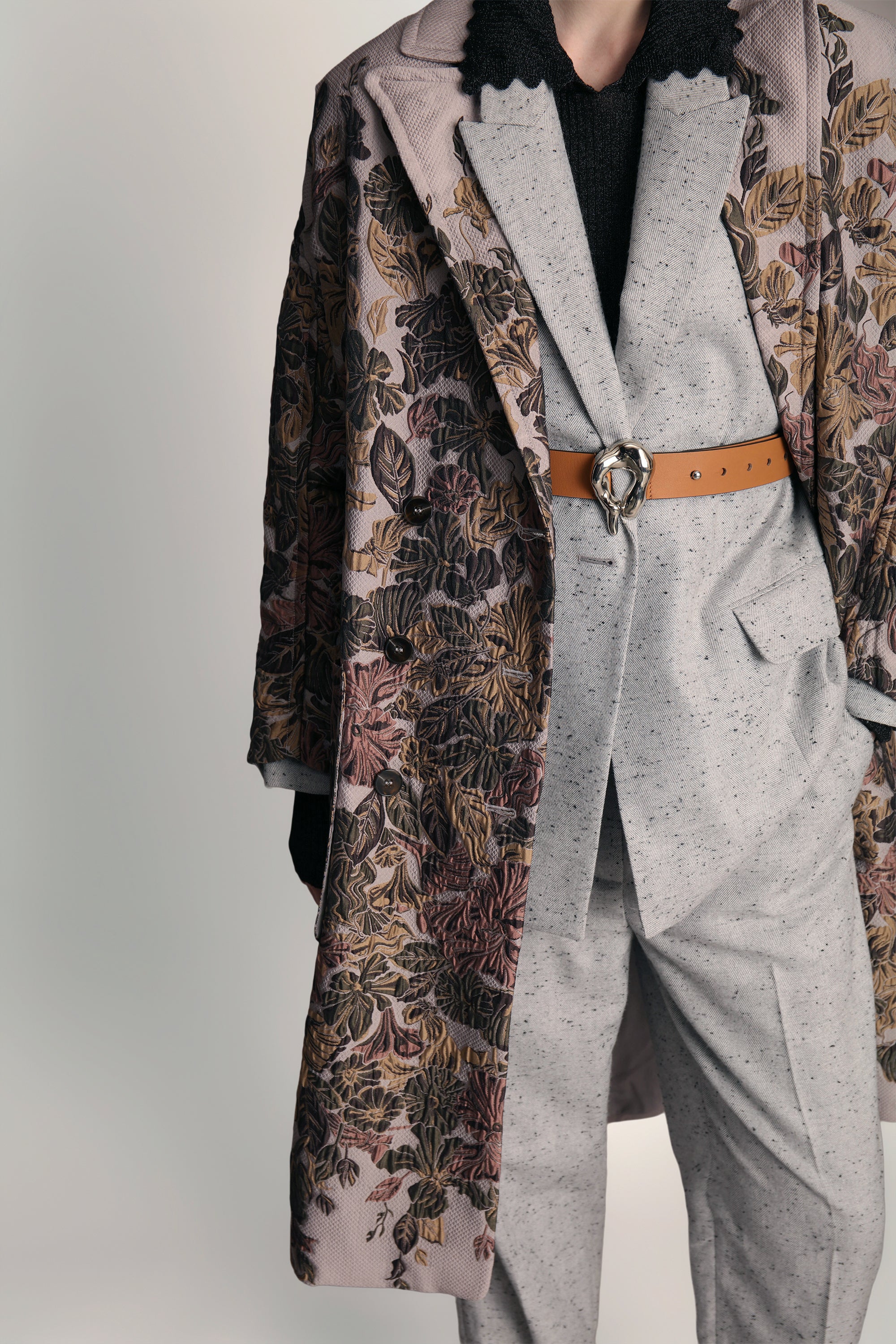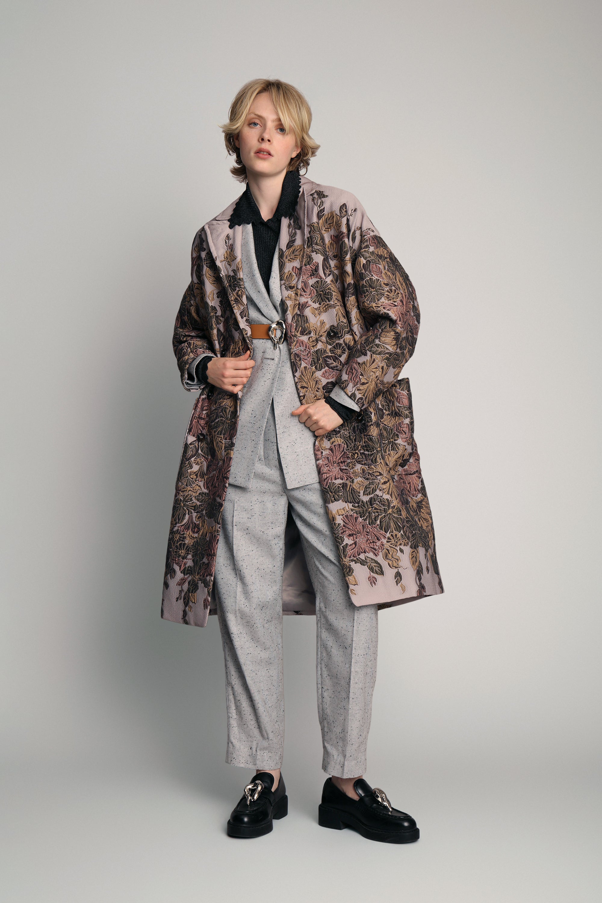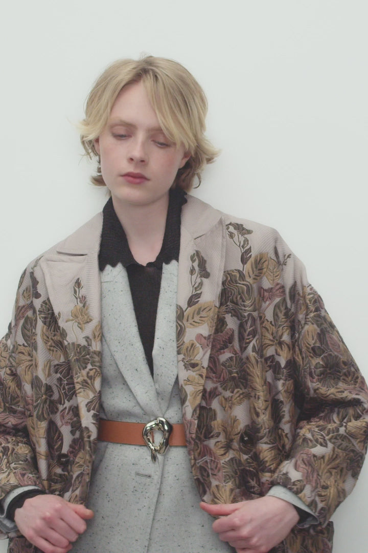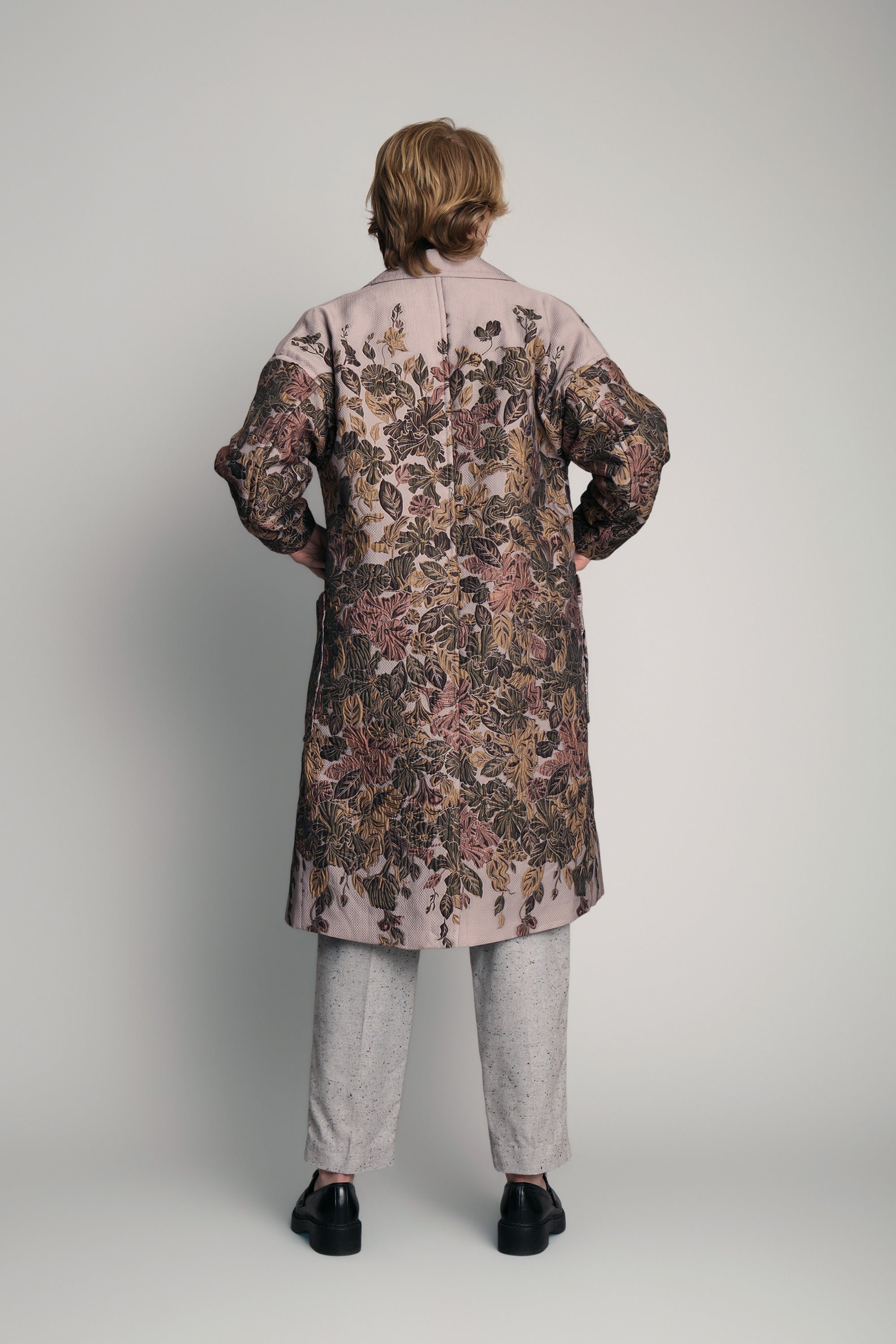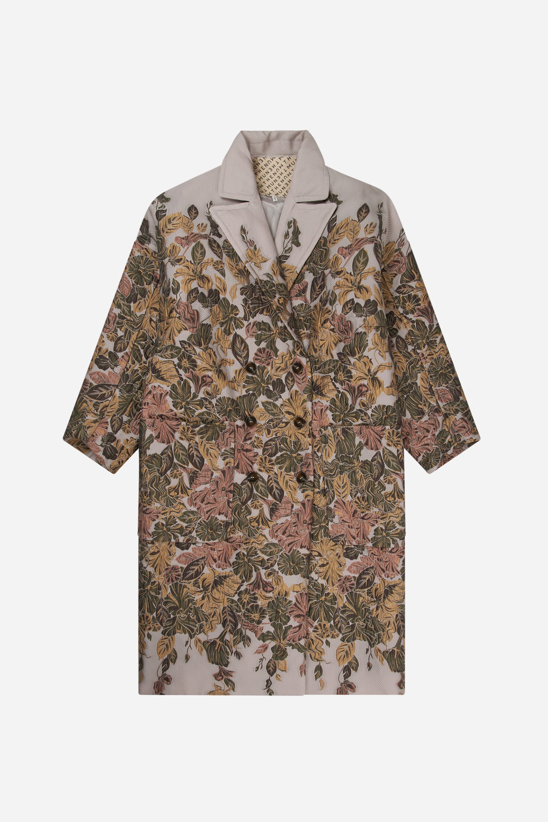 Jacket with an elegant flower print that dissolve at the shoulders and at the bottom. The jacket is designed in a loose fit with pockets, and a double row button closure. Available in the color sand.