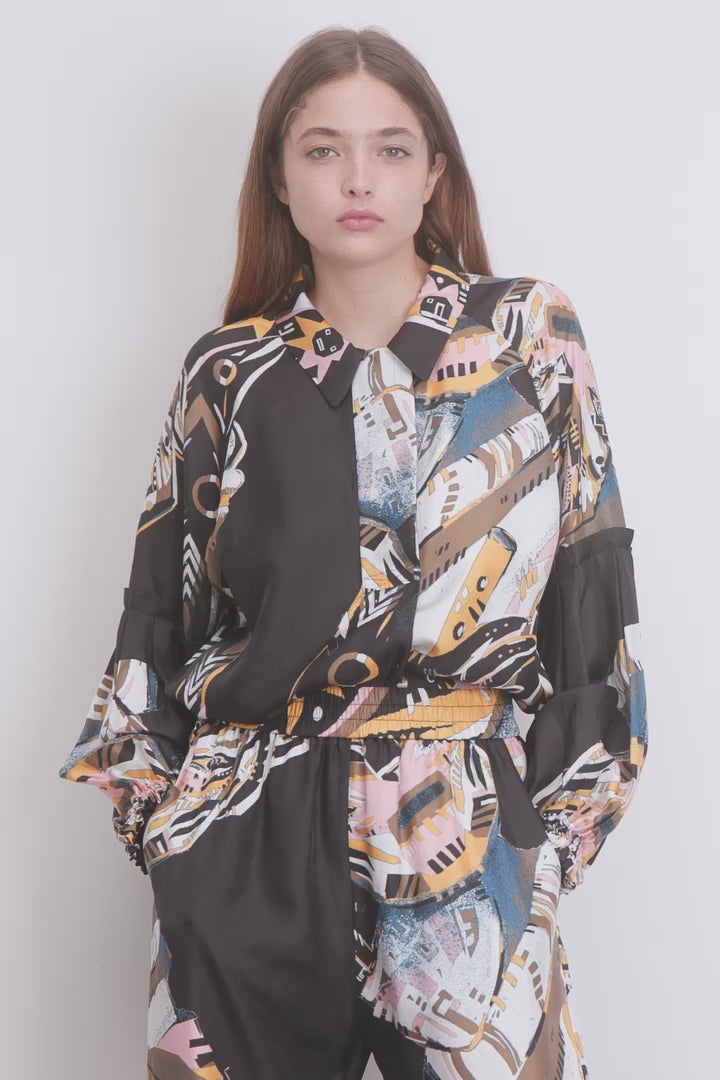 Shirt made from 100% silk with a beautiful all-over print and elegant ruffle details on the sleeves. The shirt has a halfway opening and a small collar, and is designed for a loose fit.