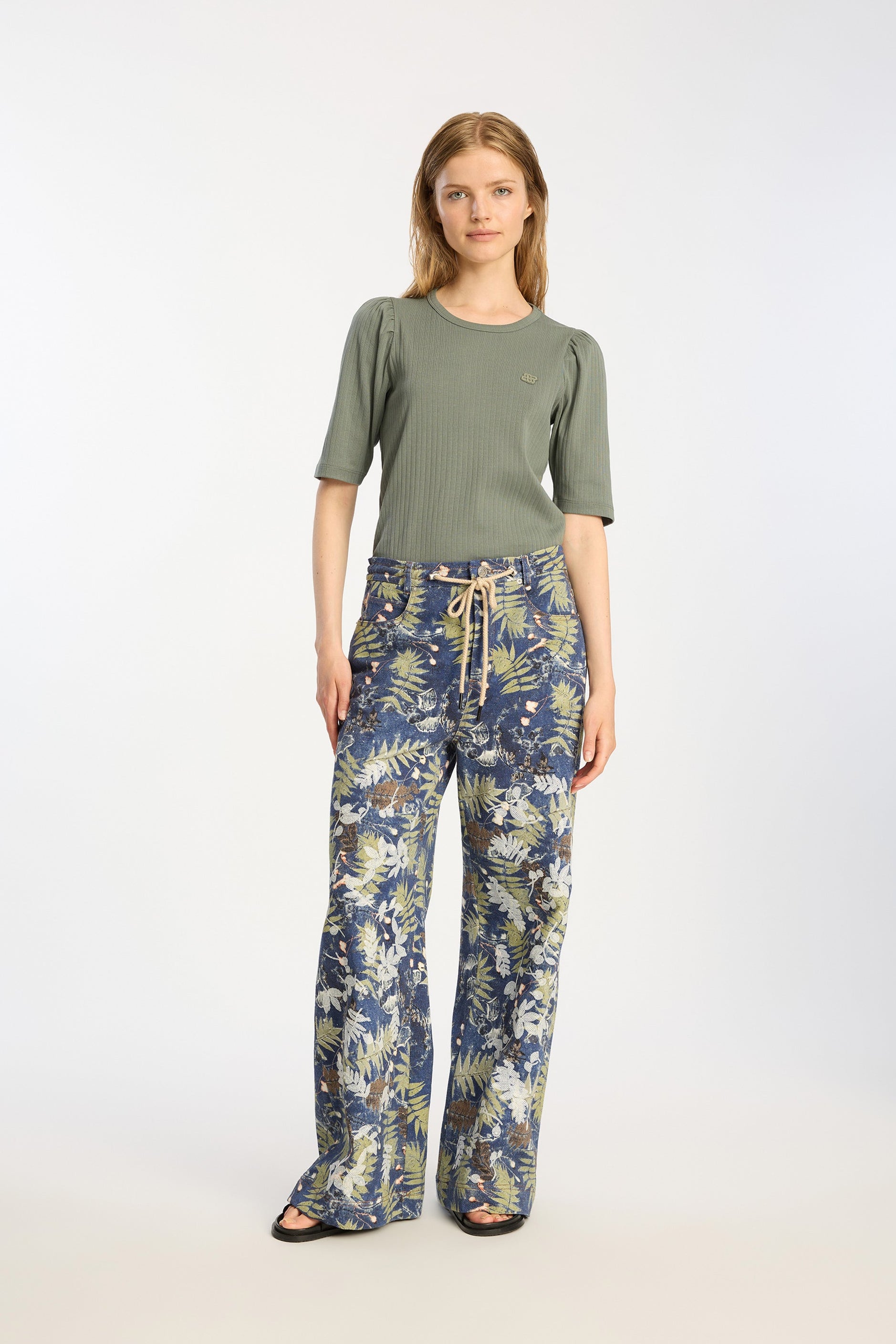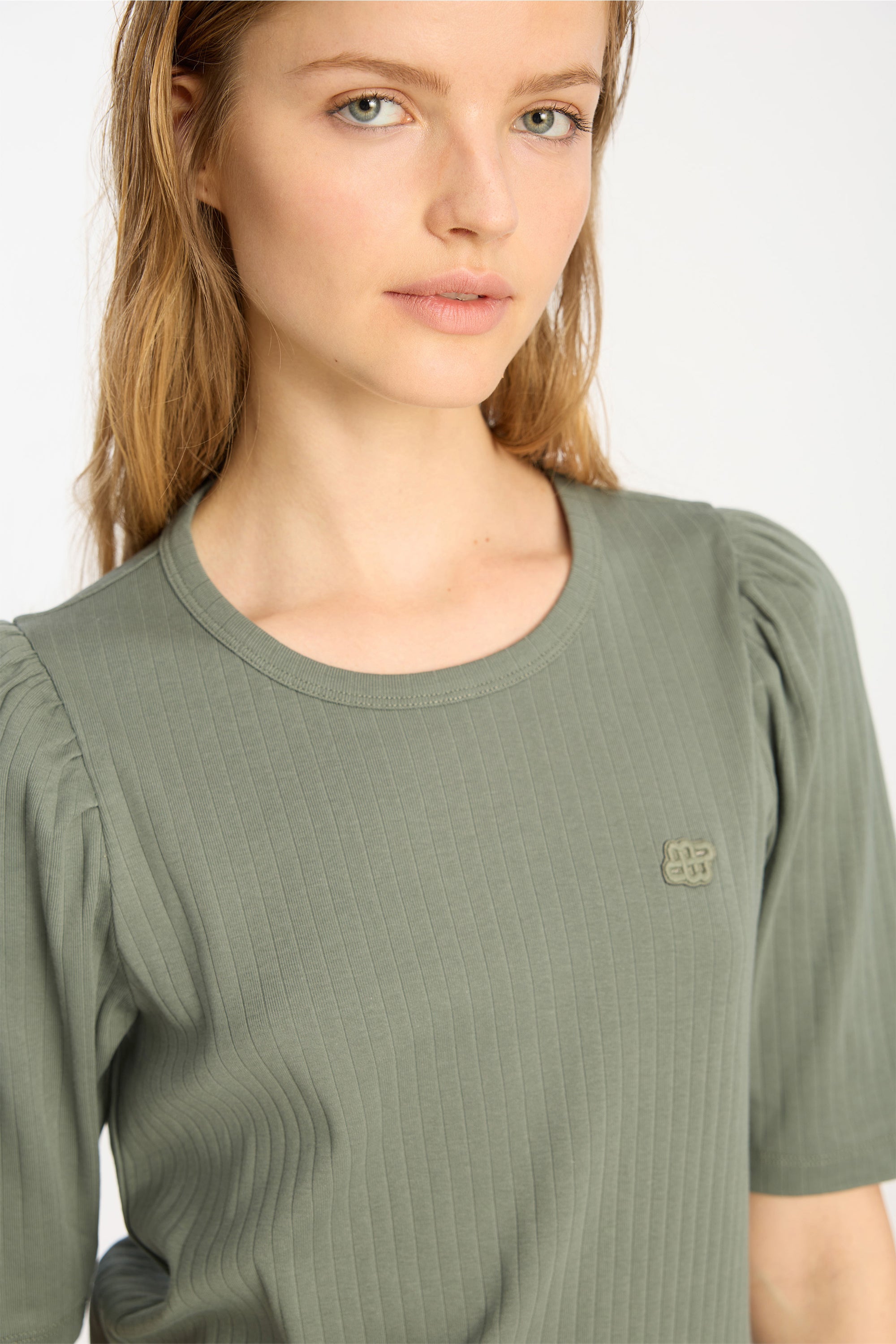 T-shirt in a rib material with elegant puff sleeves. This t-shirt is made in 100% organic cotton and designed with a round neck and low shoulder seam.