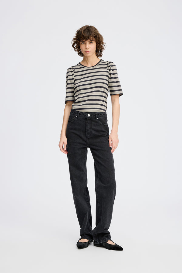 Striped fitted t-shirt with light, elegant puff sleeves. This t-shirt is made in 100% organic cotton and designed with a round neck and low shoulder seam.