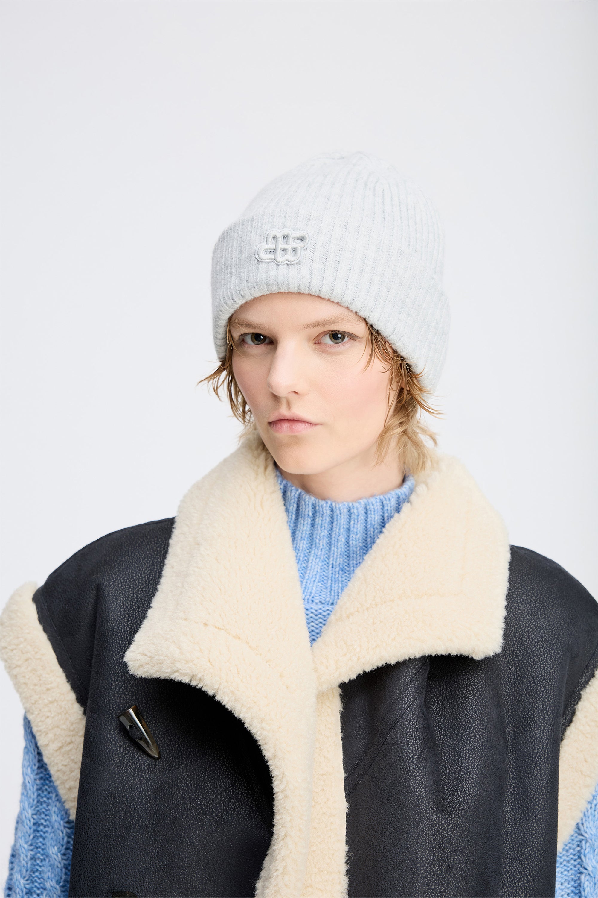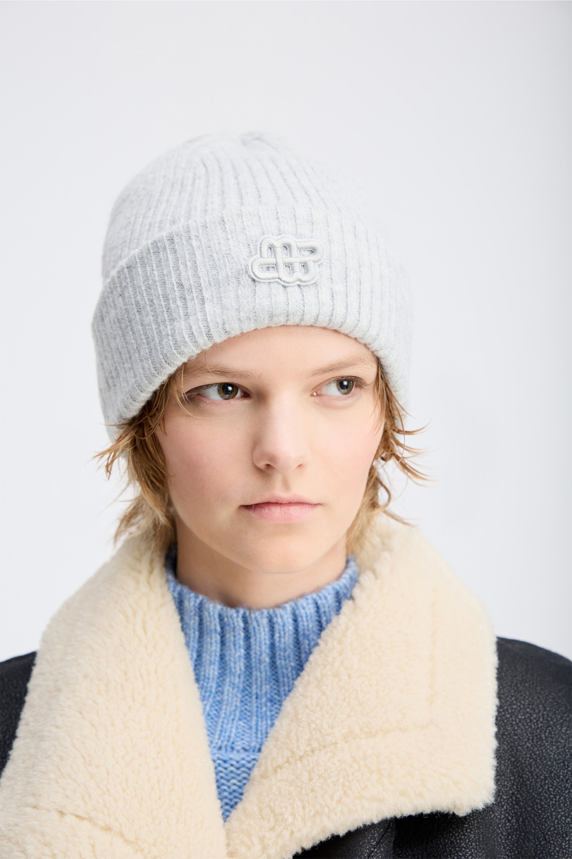 A beautiful ribbed knit hat with an elegant MUNTHE emblem on the front. Made from a soft recycled polyester blend.