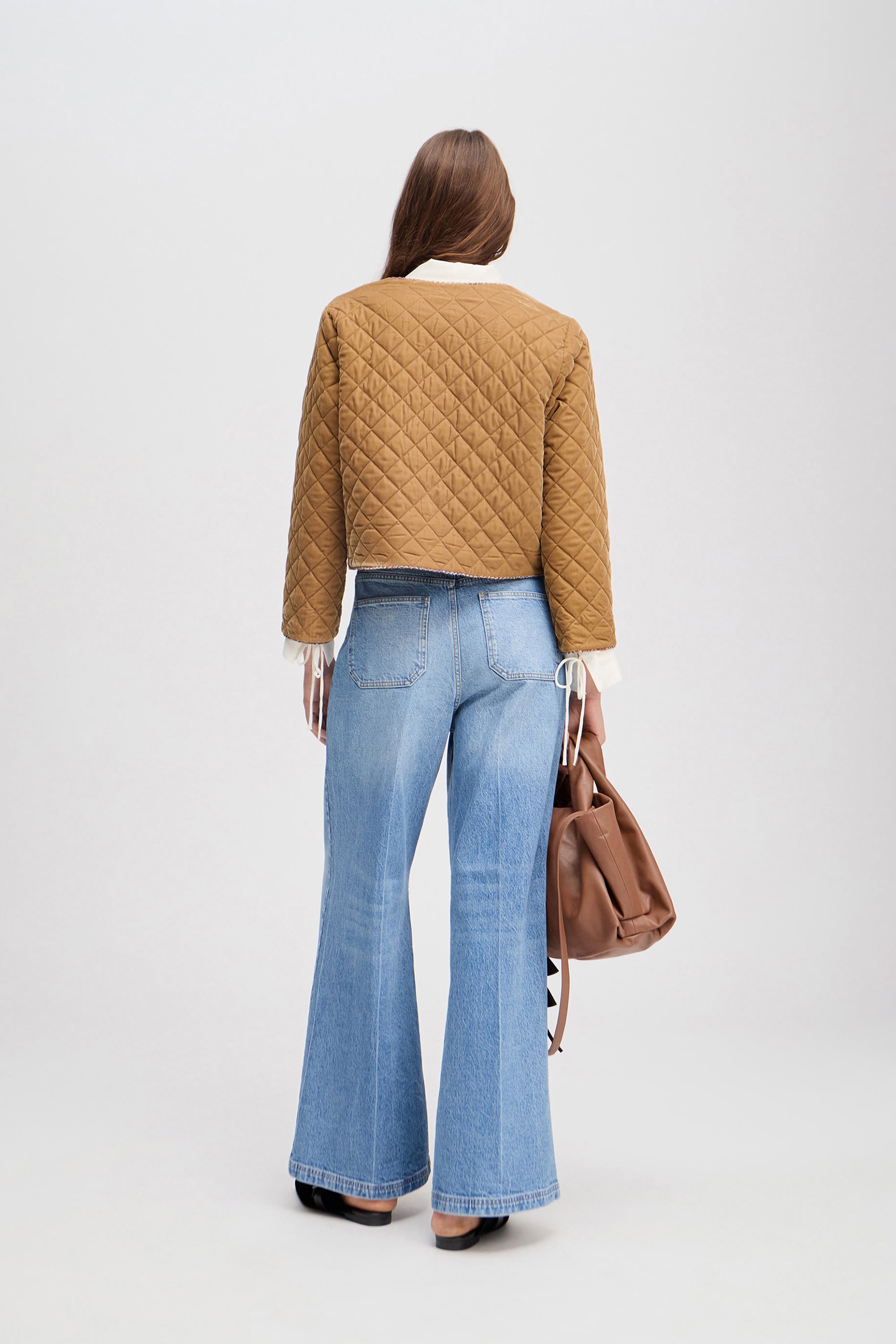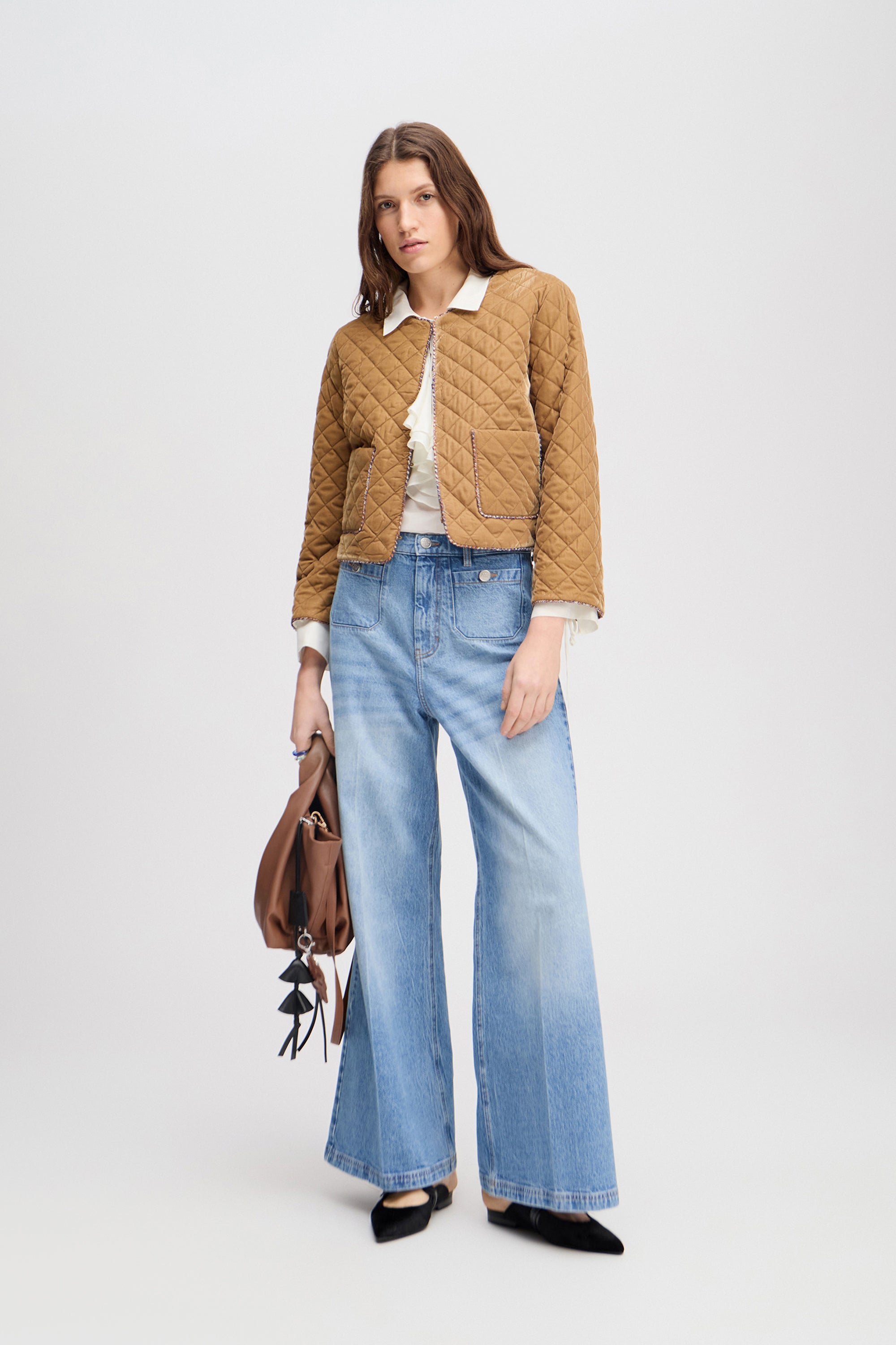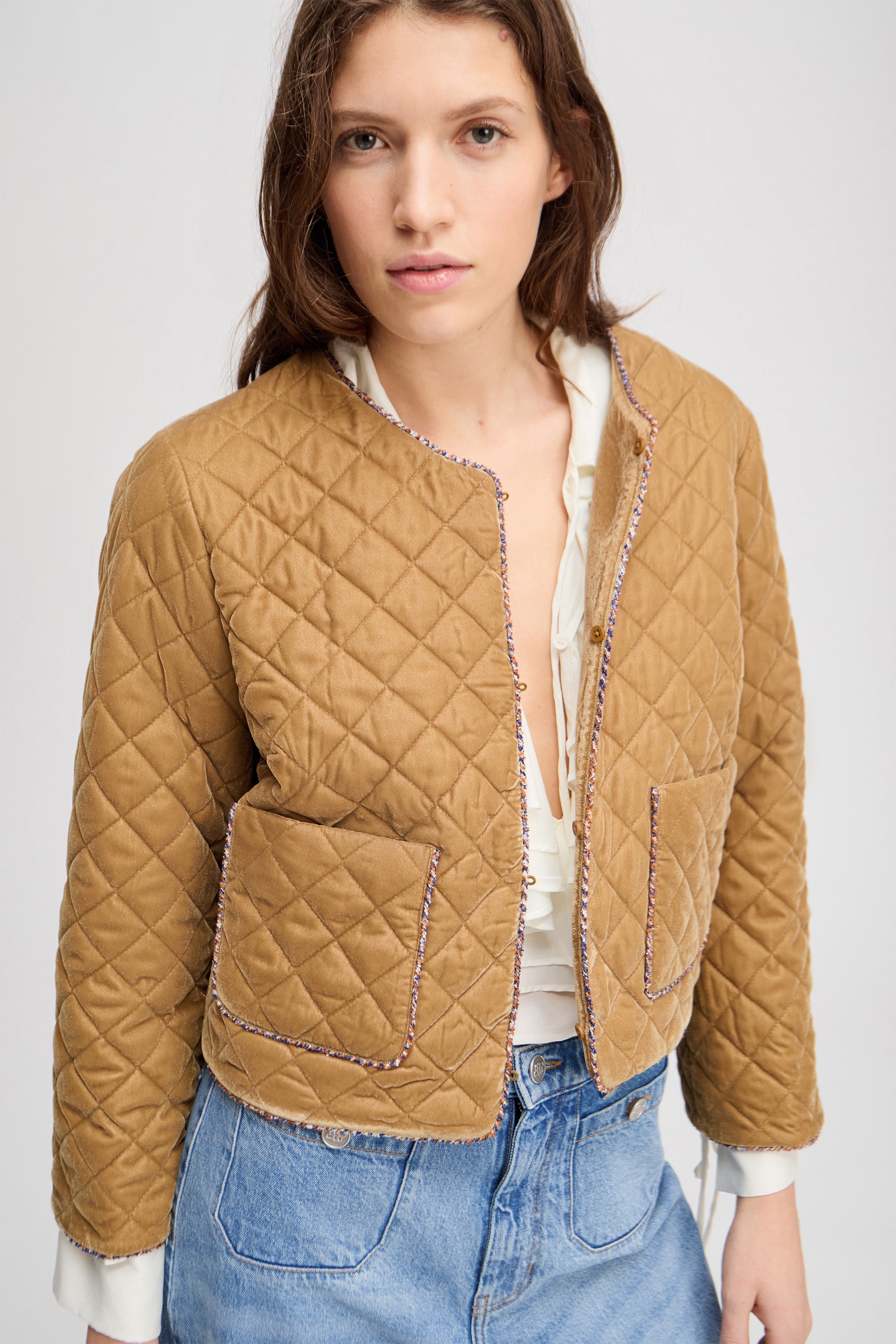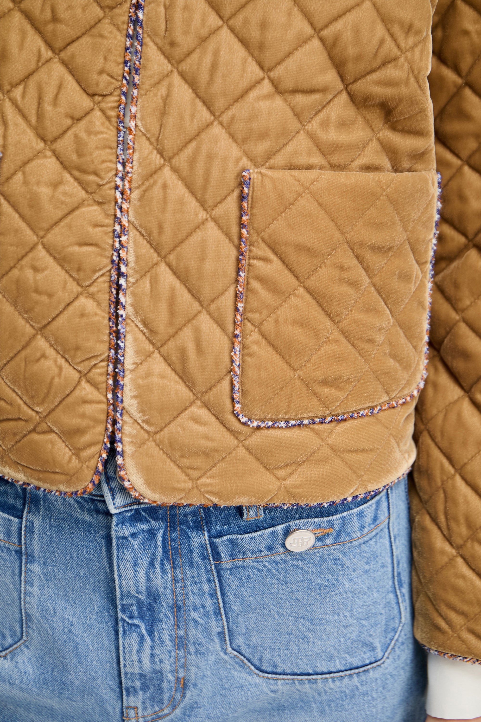 Short, beautiful, quilted velvet jacket with elegant fringed piping. The jacket features button closure and stylish front pockets.