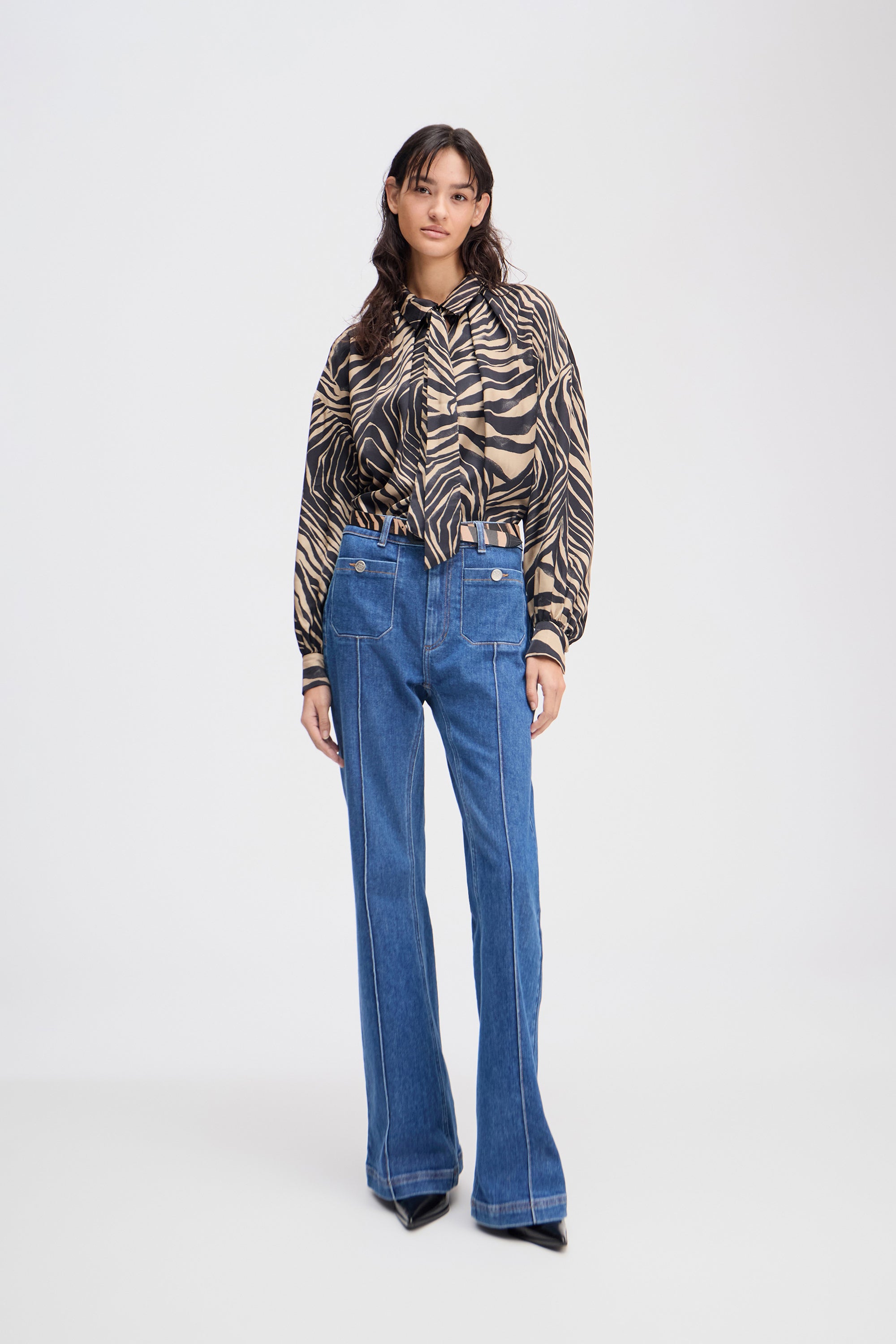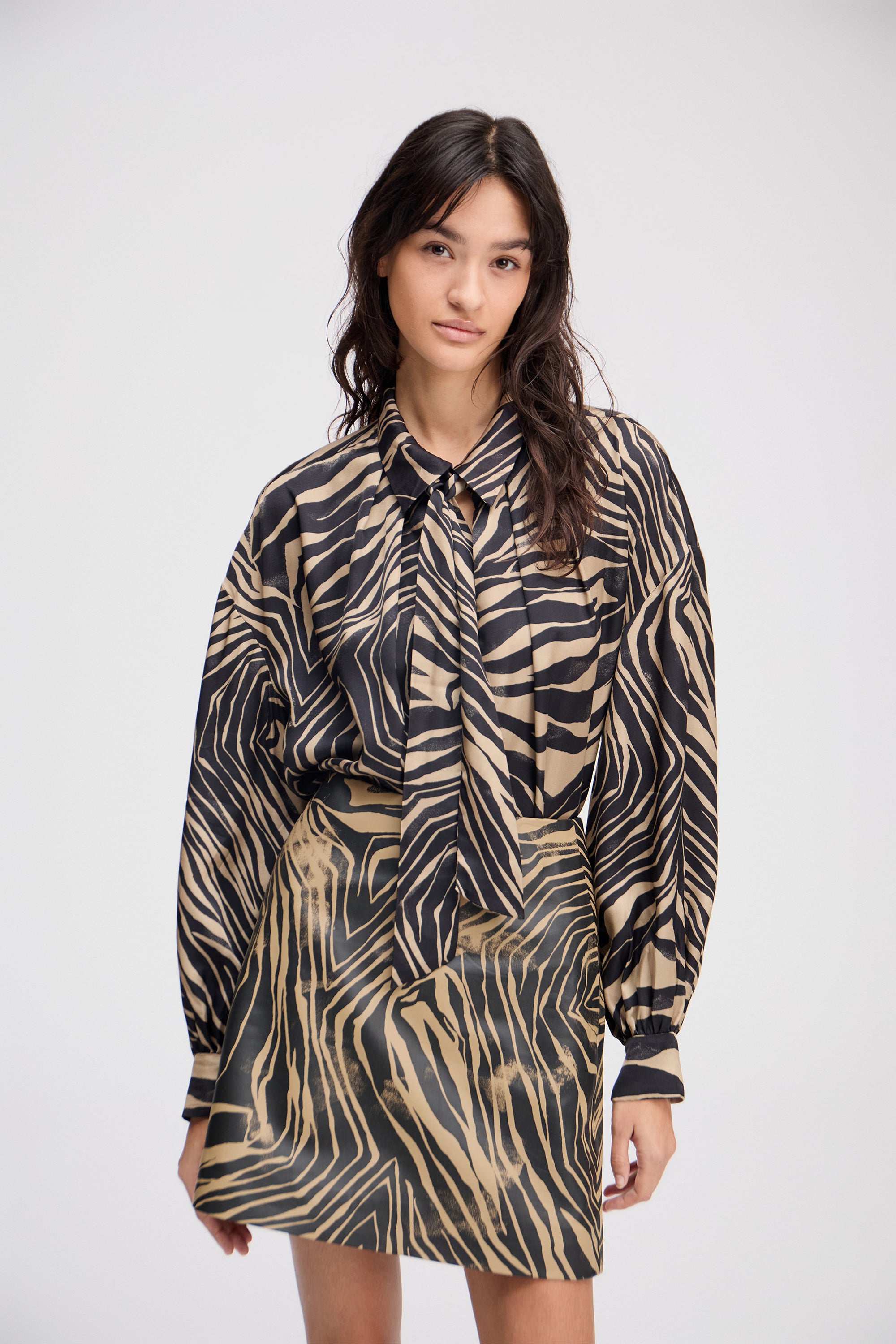 Beautiful shirt blouse with an elegant all-over print and a delicate tie detail at the collar. The shirt features dropped shoulders and stylish wide sleeves finished with cuffs. The blouse can be styled with or without the tie.