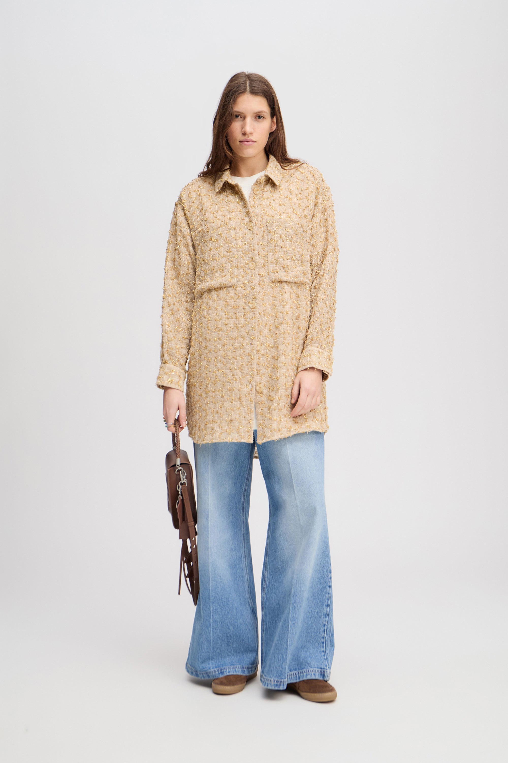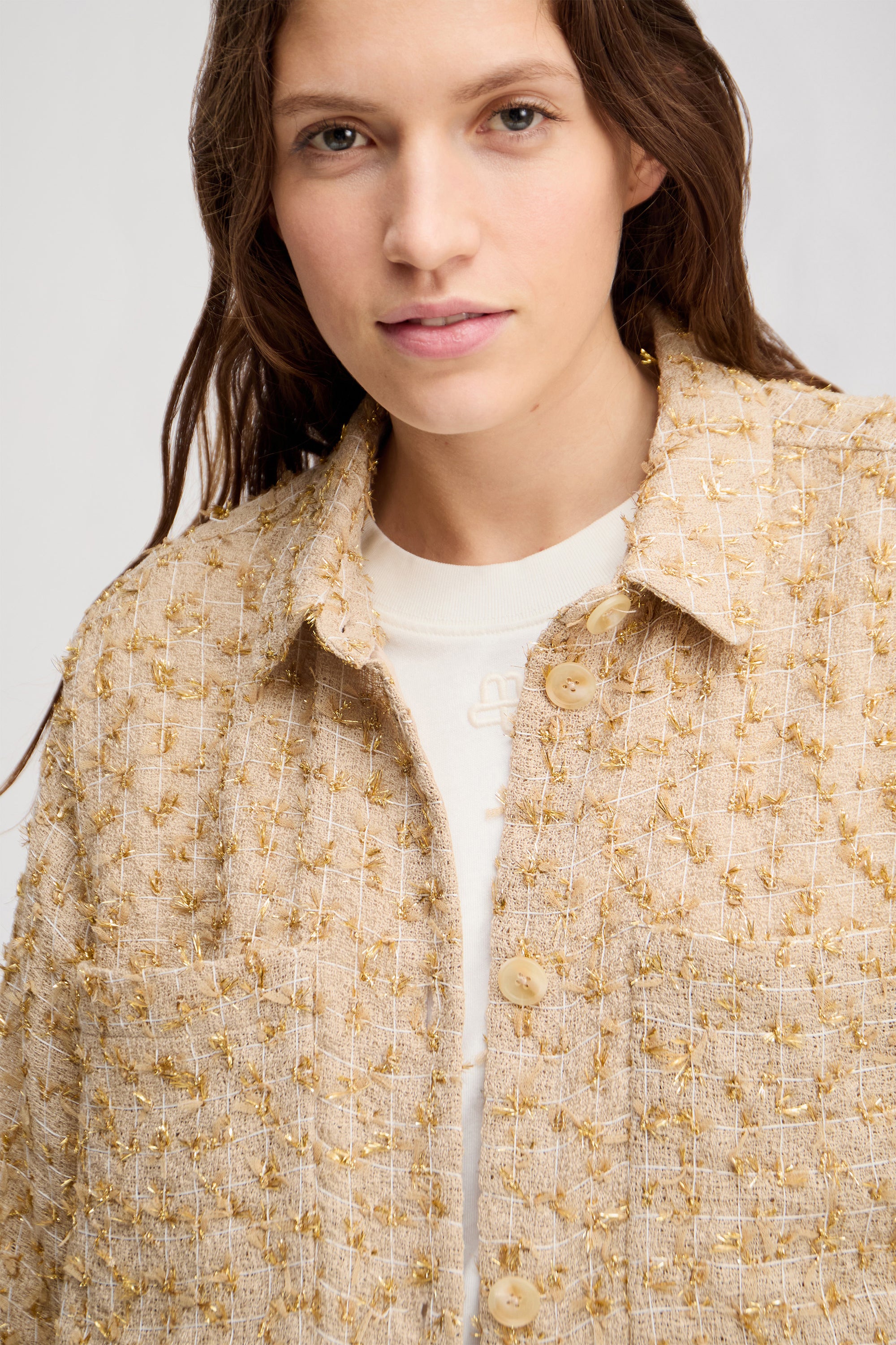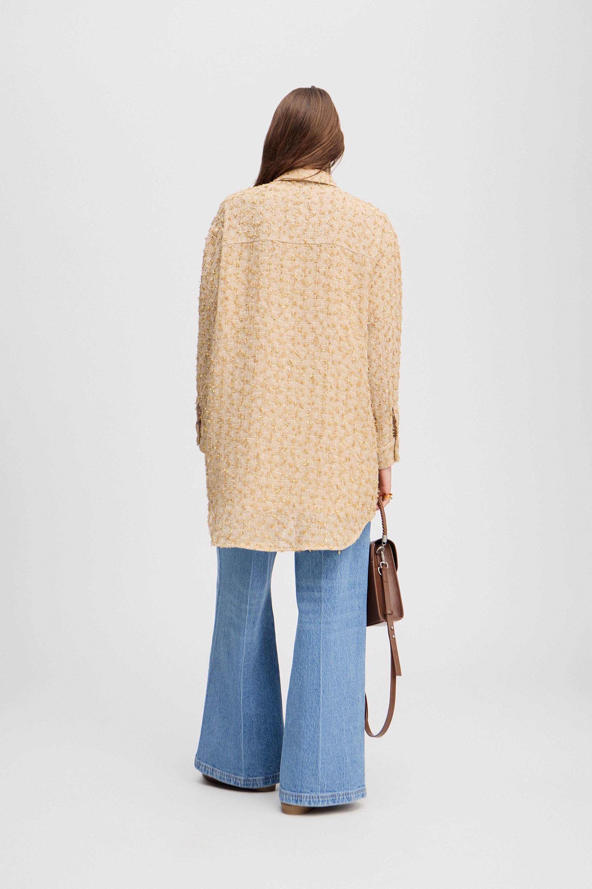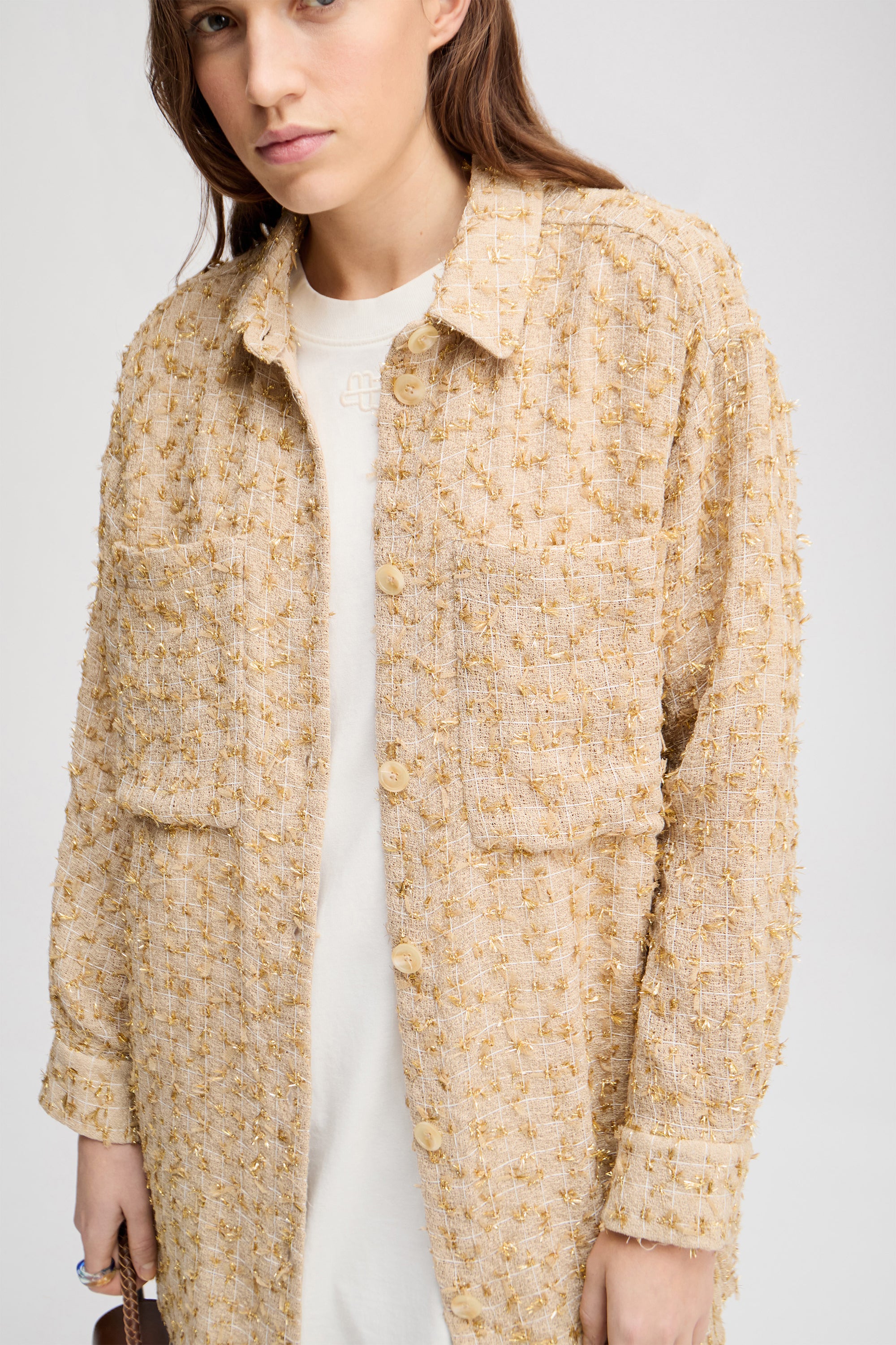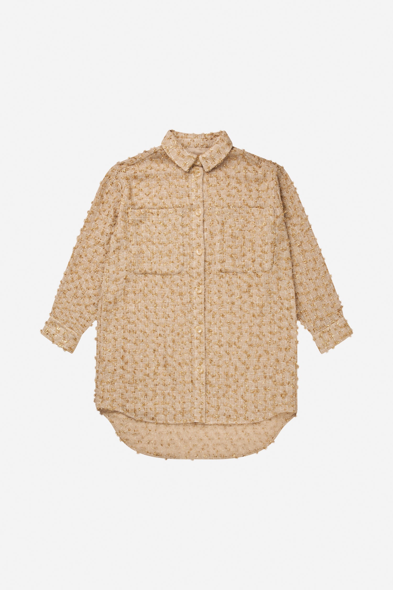 Shirt woven in a beautiful checkered pattern with a coarse texture and a fine gold thread. The shirt is designed with two elegant chest pockets, long sleeves, and can be styled both open and closed.