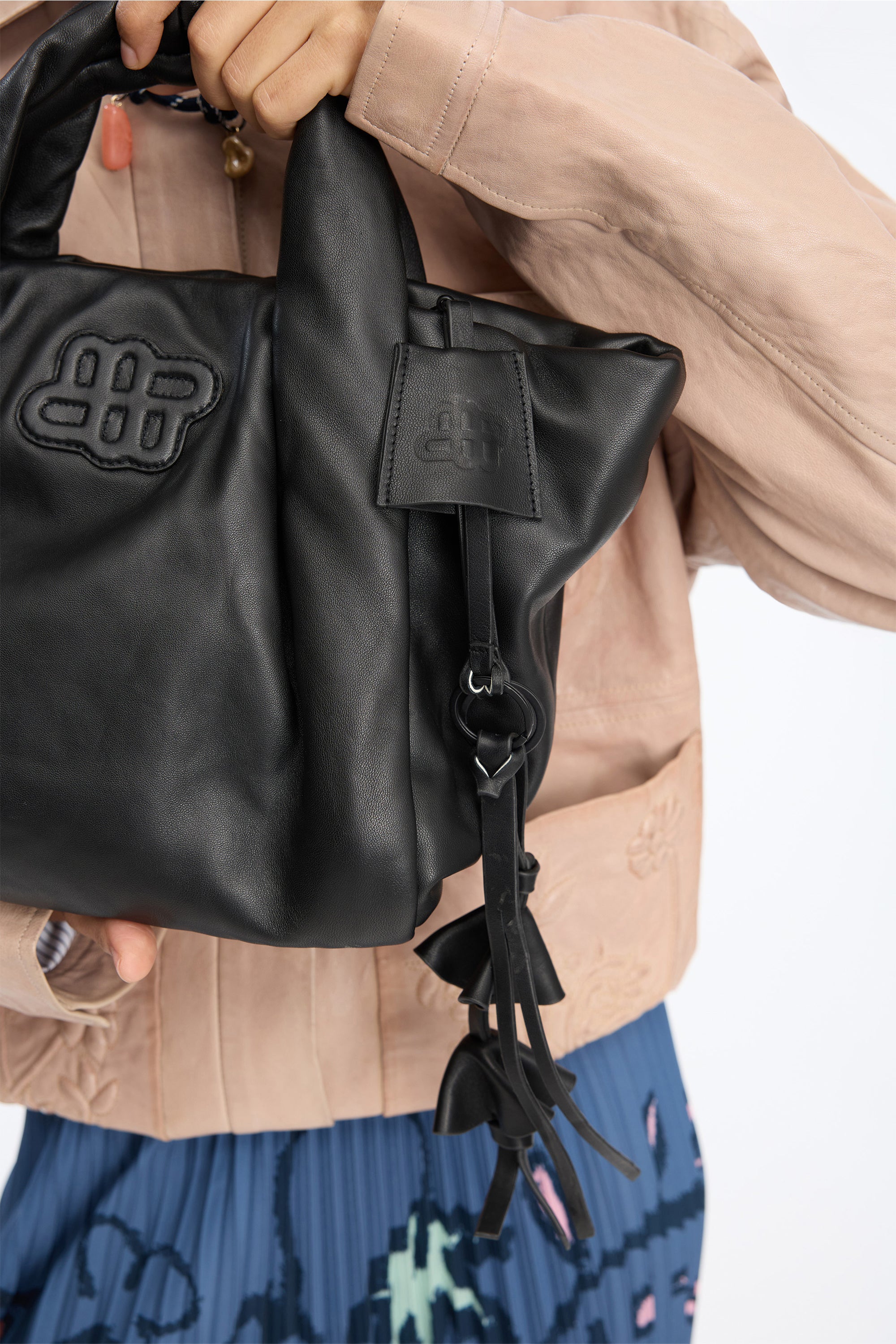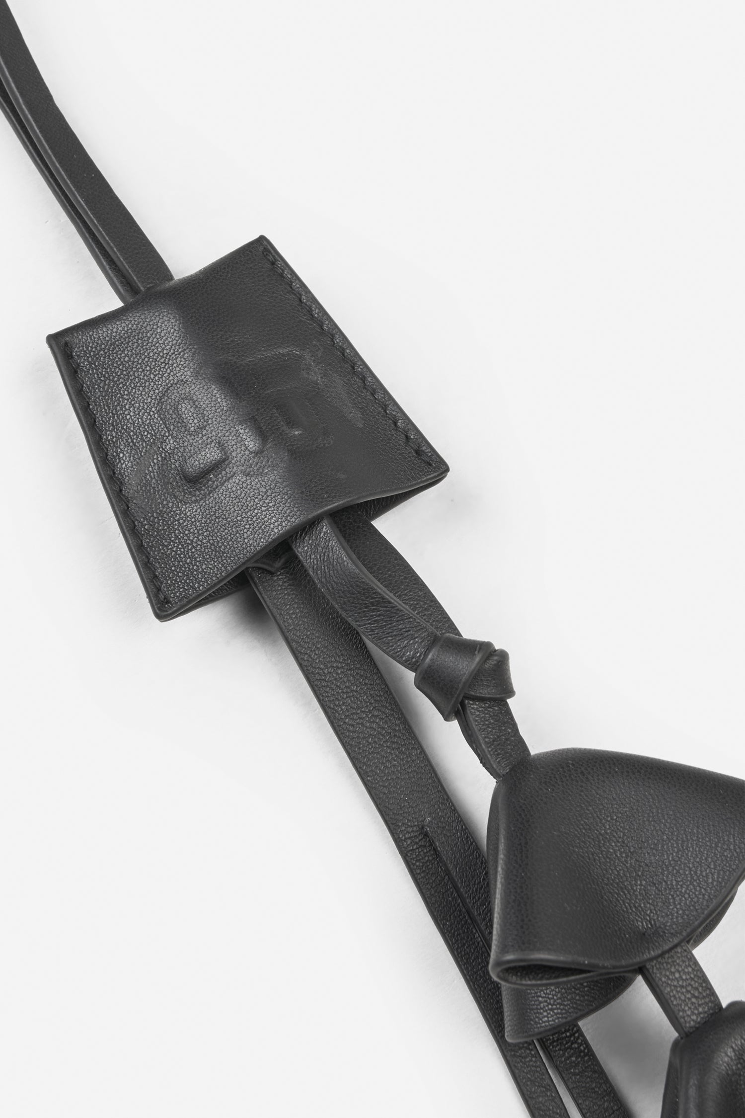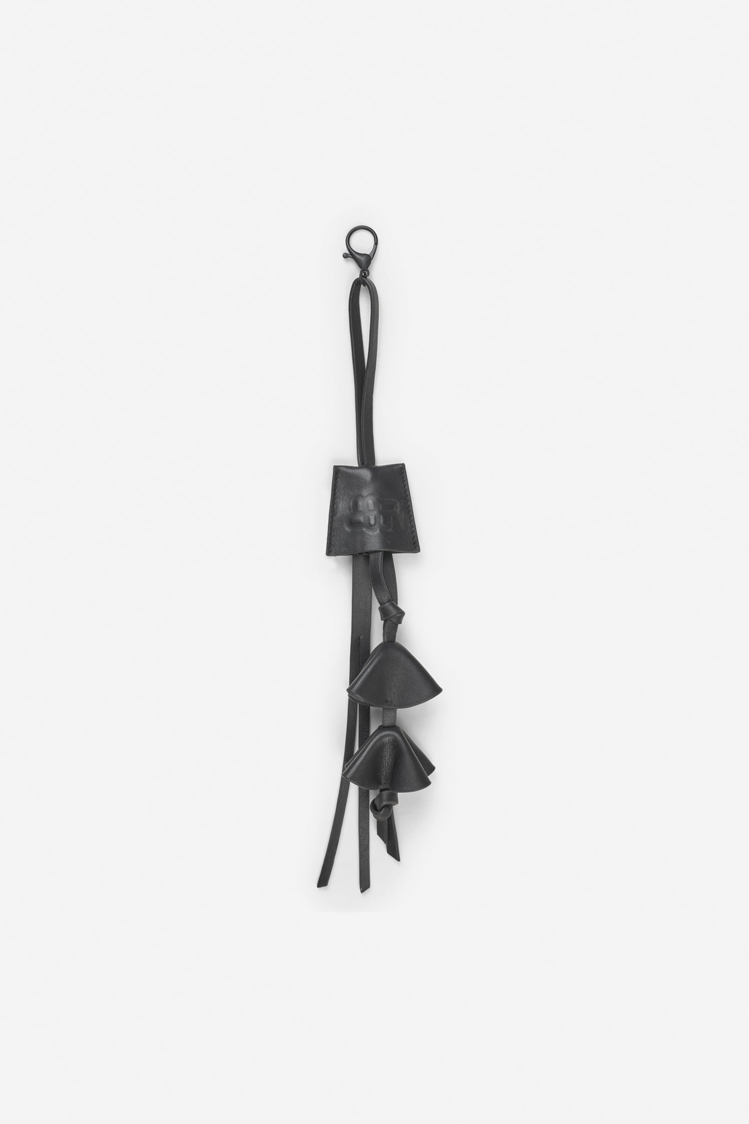 This bag charm is crafted from lamb leather and designed with three small layered leather charms and a long, slim strap.