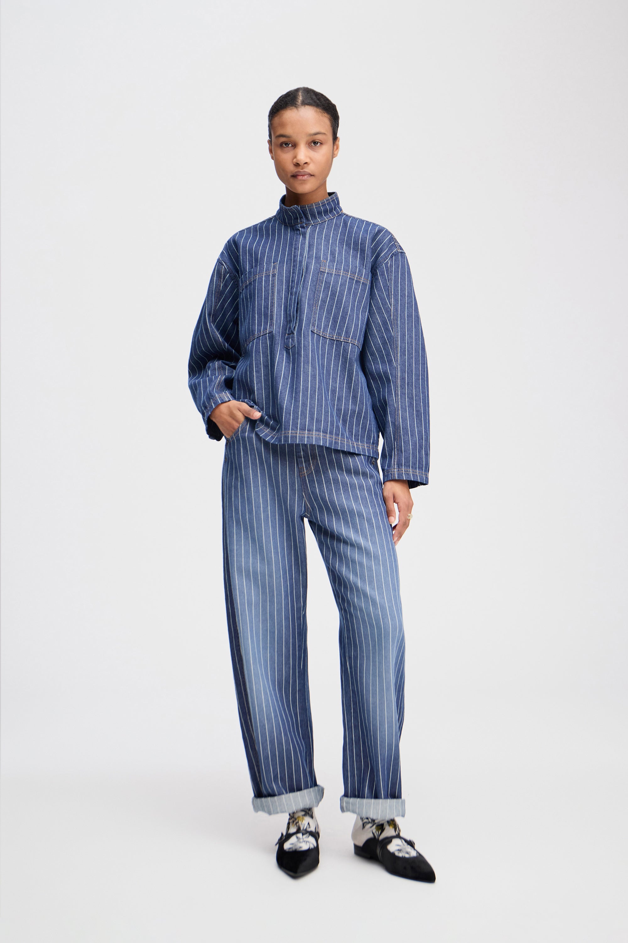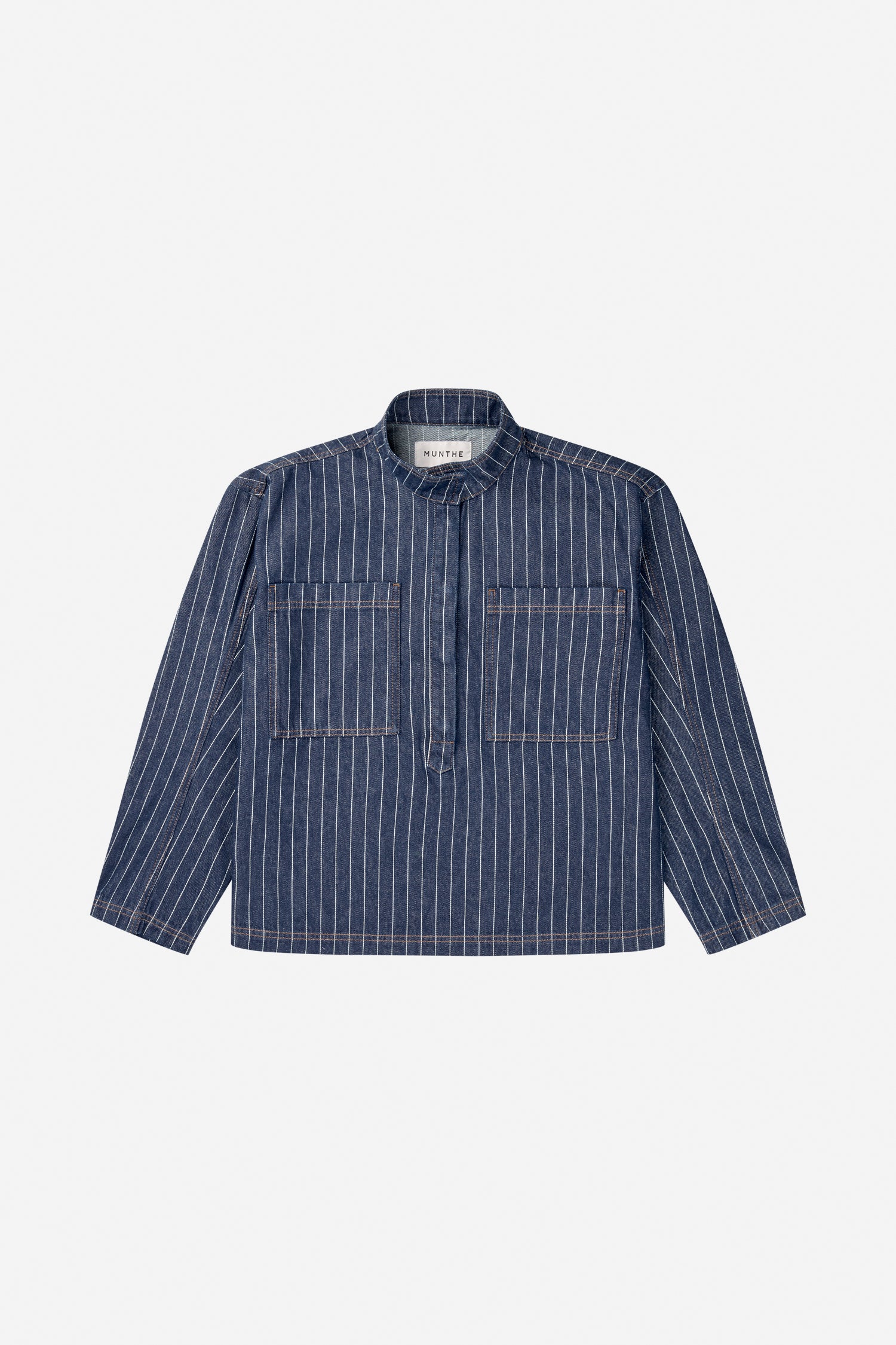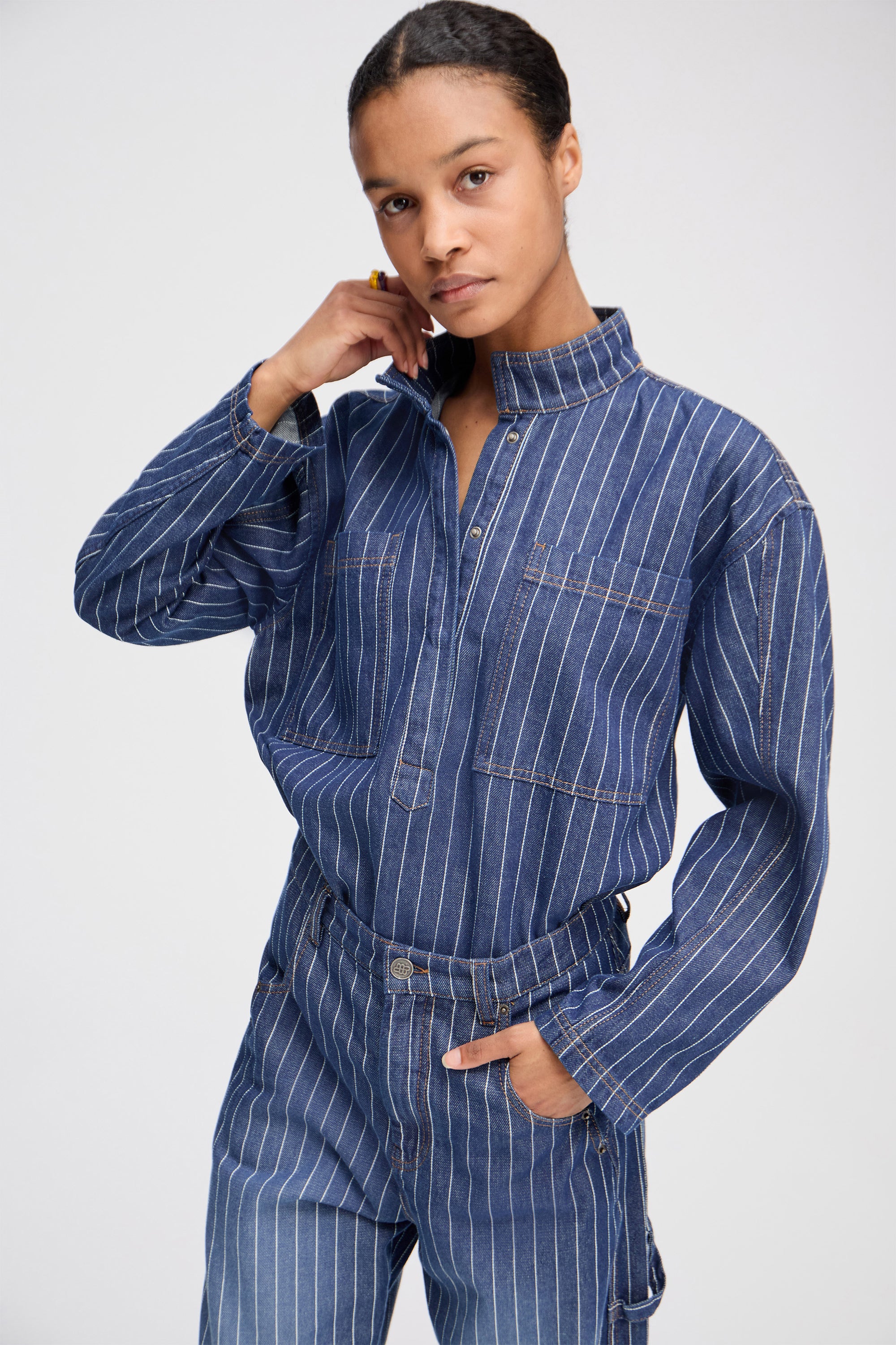 Elegant needle-striped denim blouse with a beautiful low collar and two fine chest pockets. The blouse features long sleeves and can be buttoned halfway down.