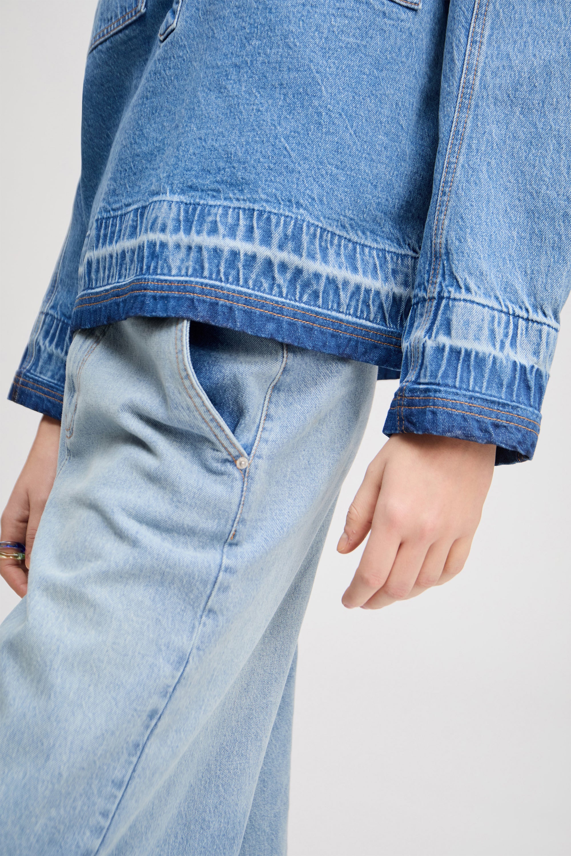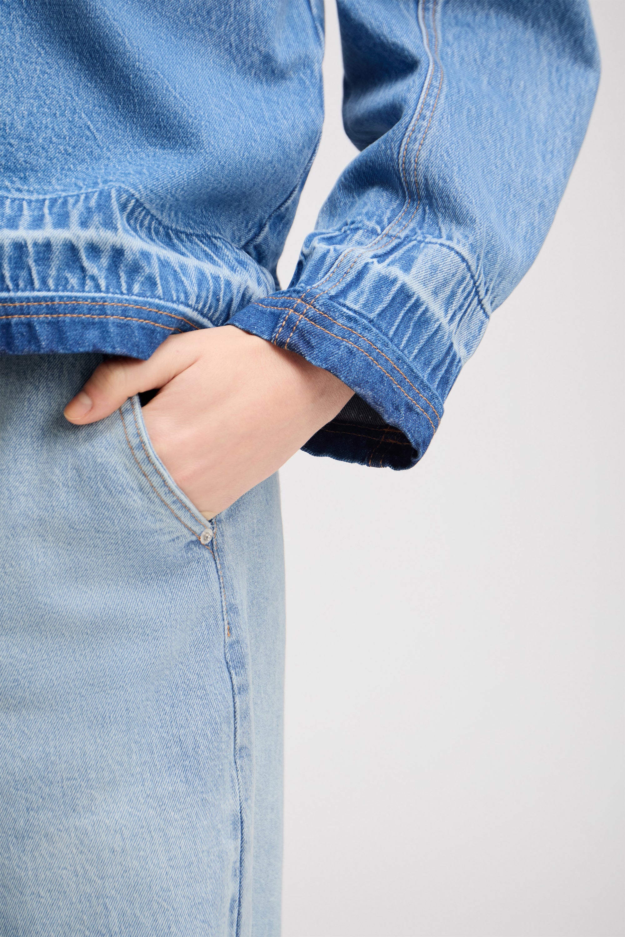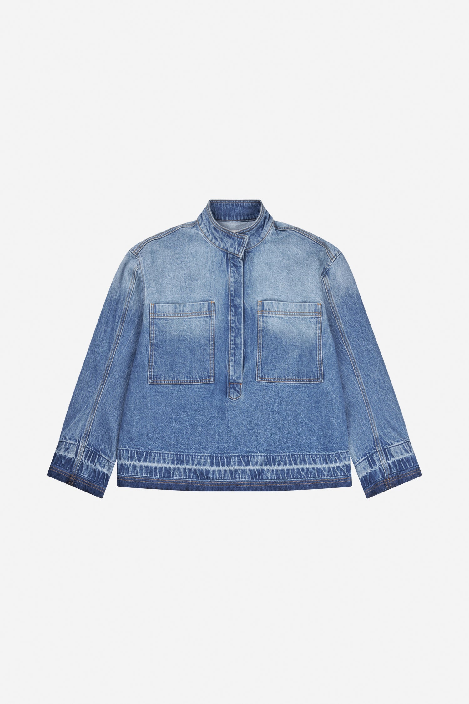 Elegant denim blouse with a beautiful denim effect along the cuffs and the edge of the blouse. The blouse is designed with two pockets and can be buttoned halfway down.