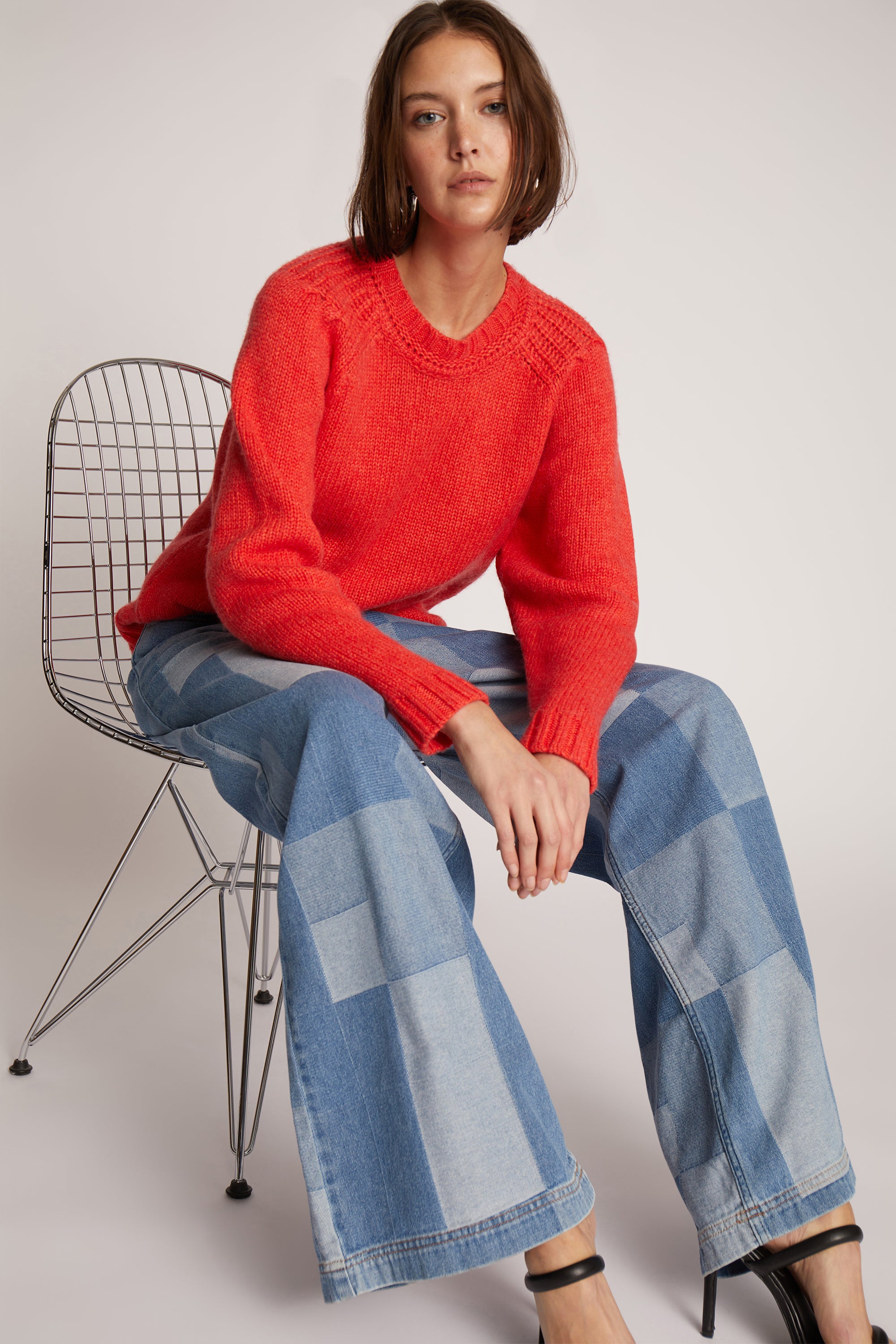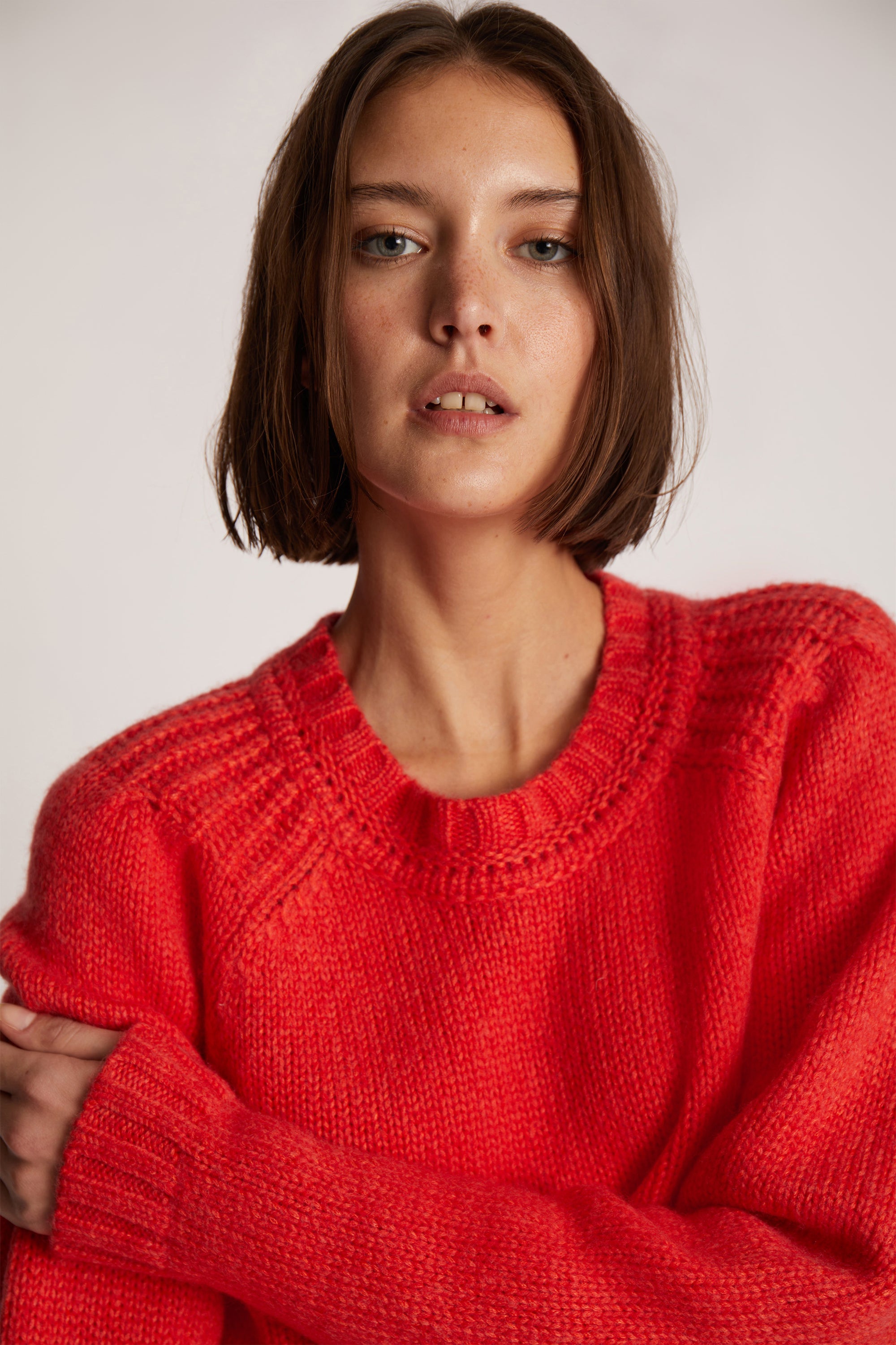 Soft classic knit with discrete knitted details on the shoulders. This knit is made from a soft merino wool blend and has long sleeves, a round neck, and an elegant rib along the edges. Available in the colors red or creme.