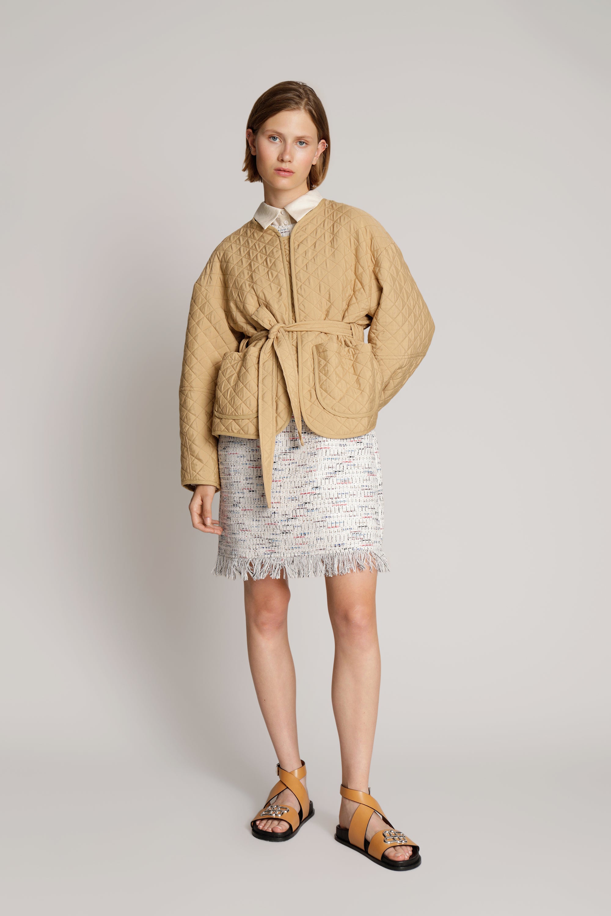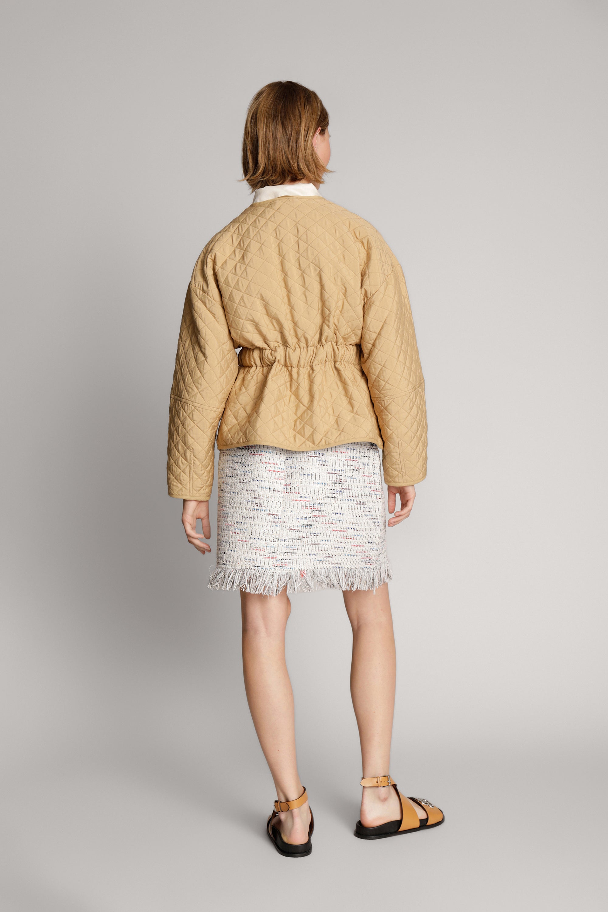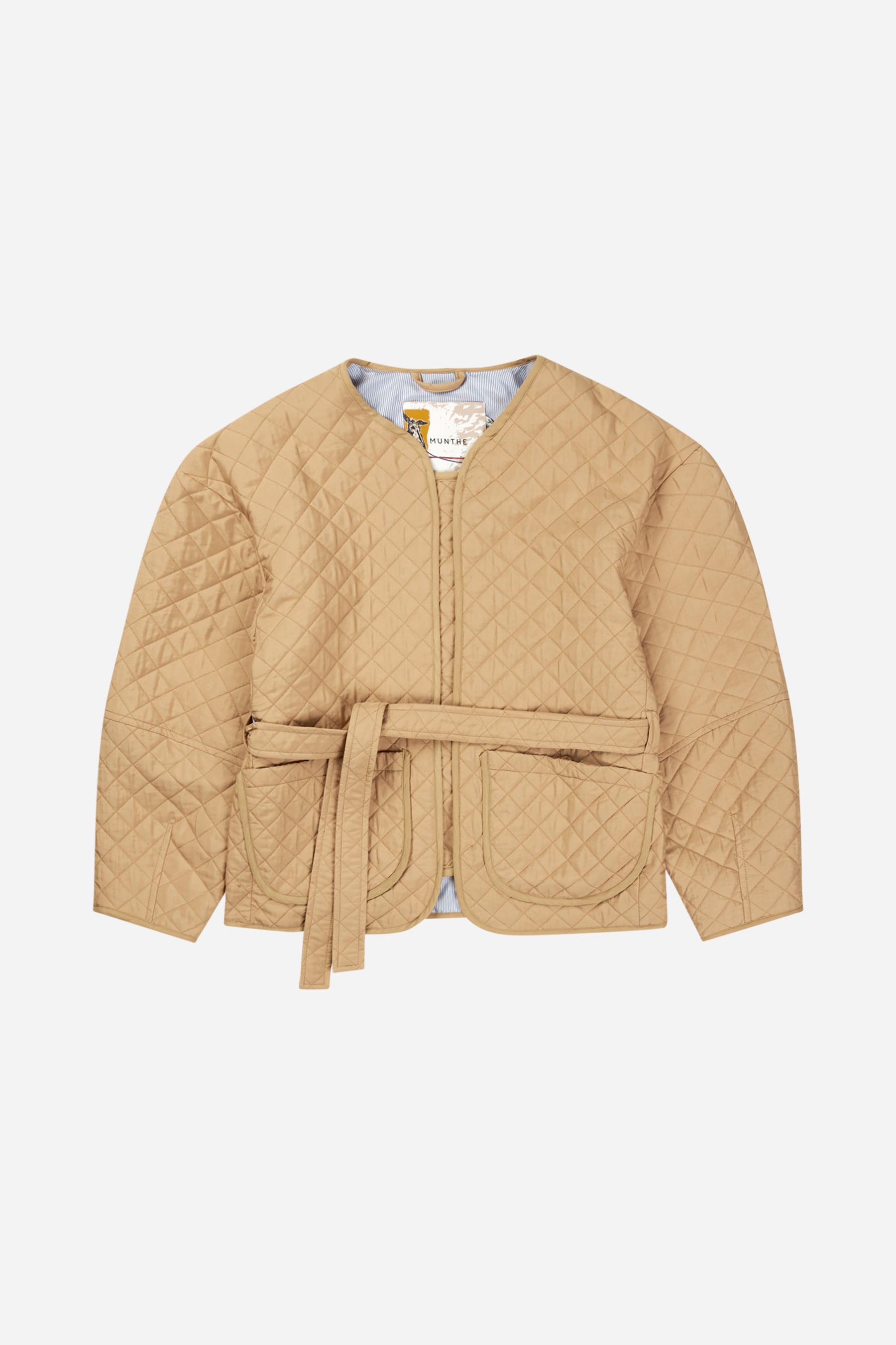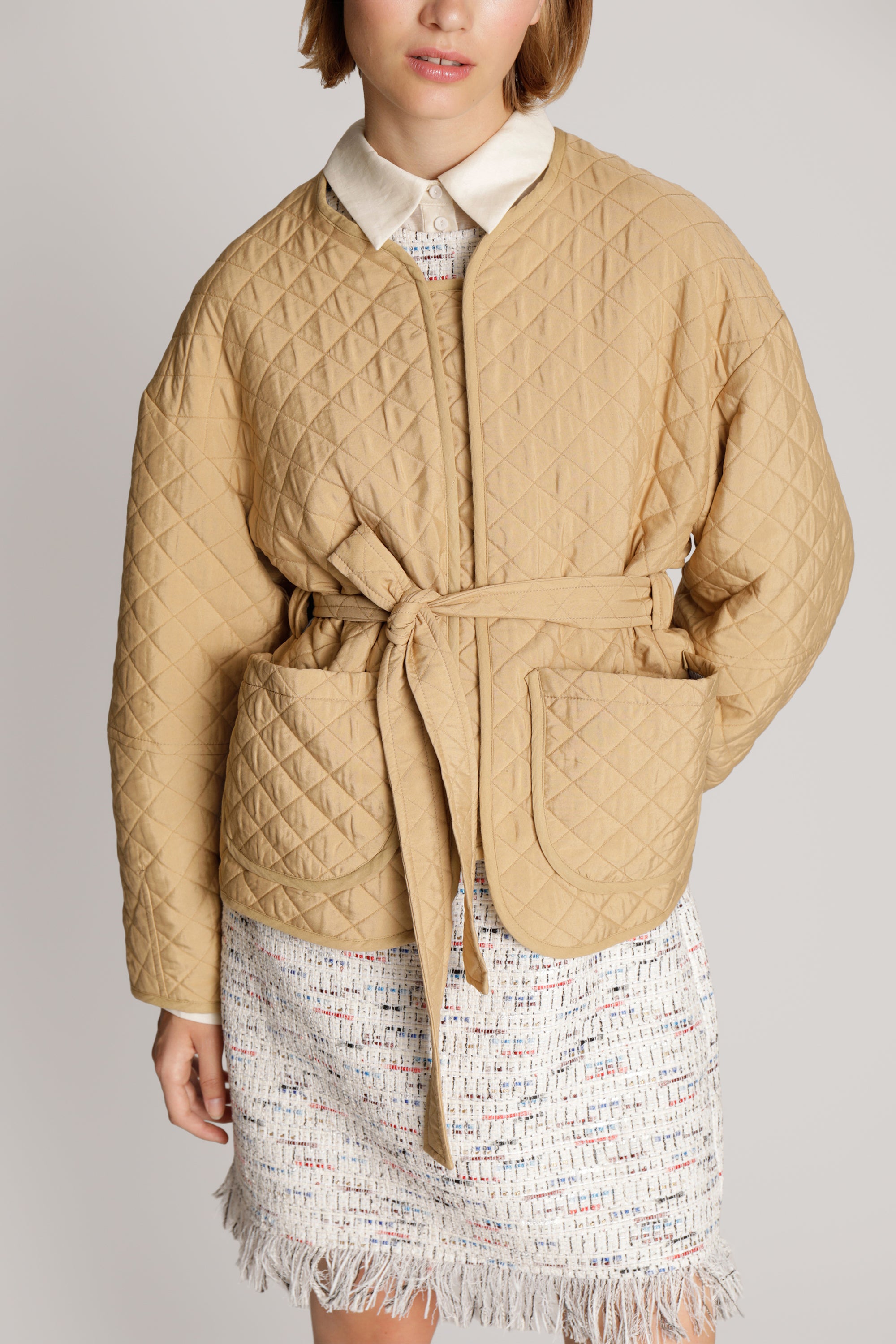 Elegant quilted jacket with semi-wide sleeves, a flattering belted waist, and pockets at the front. The jacket comes with a quilted belt, but it is styled with the Munthe Matter belt in the first picture. Available in the colors caramel and black.