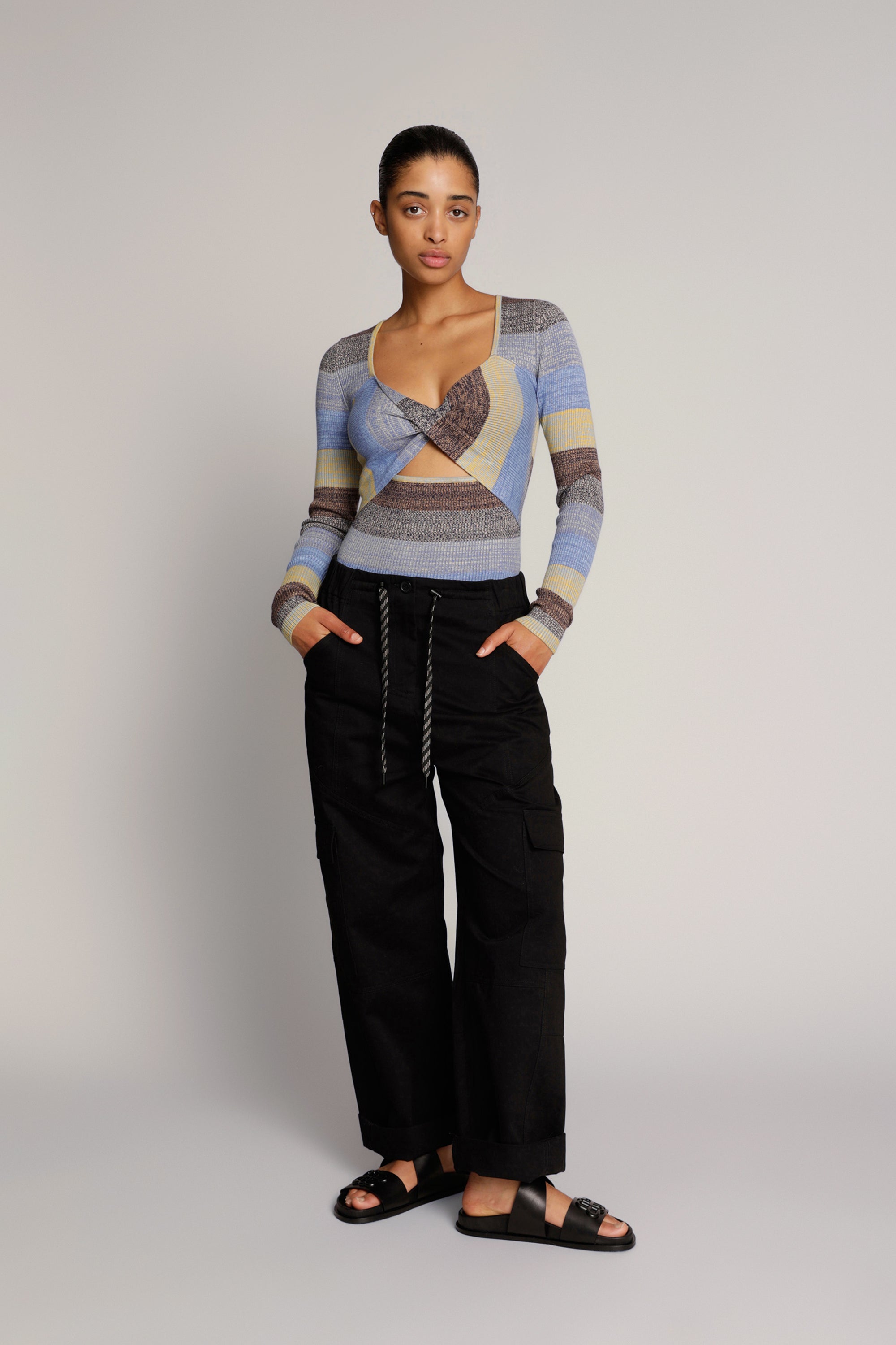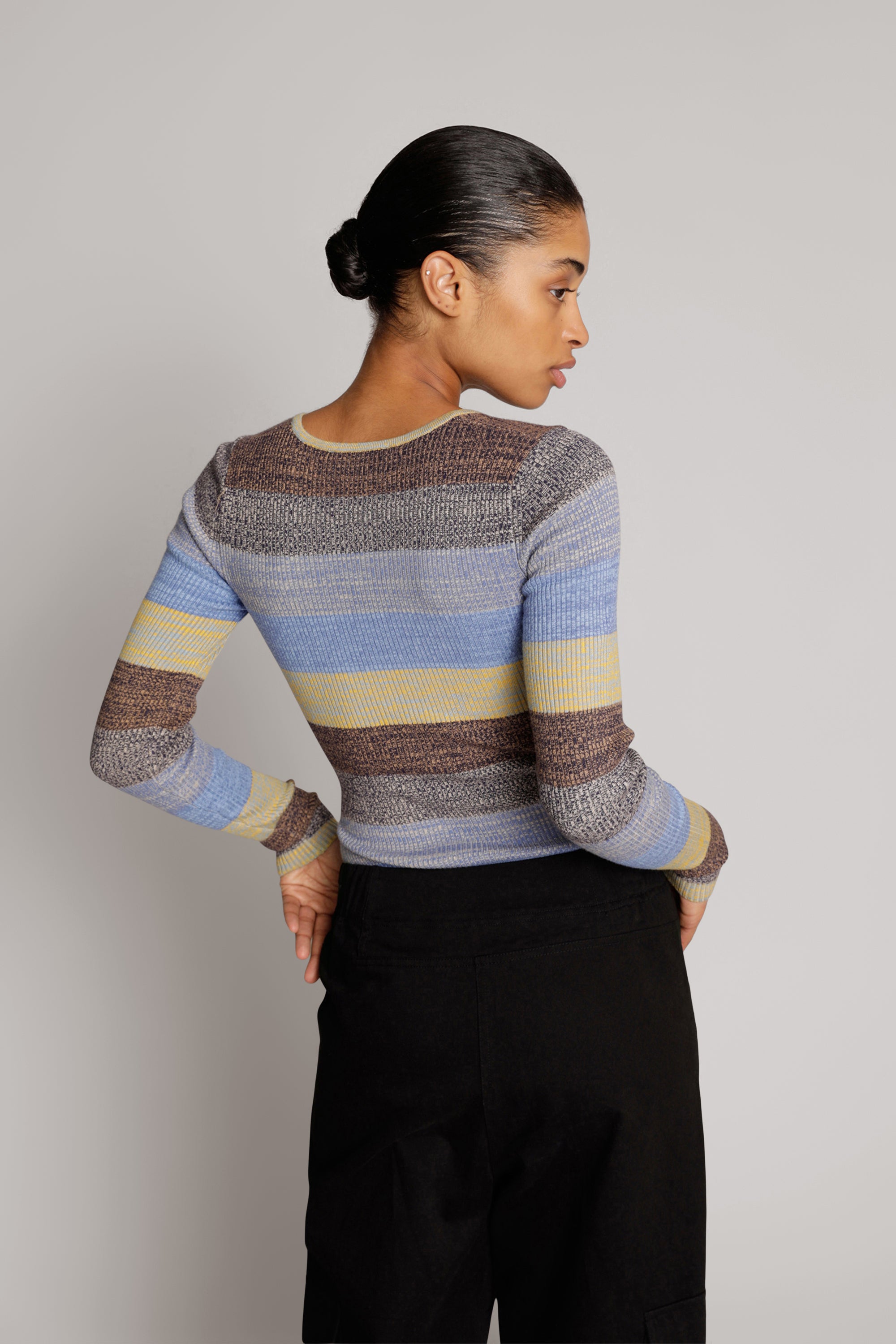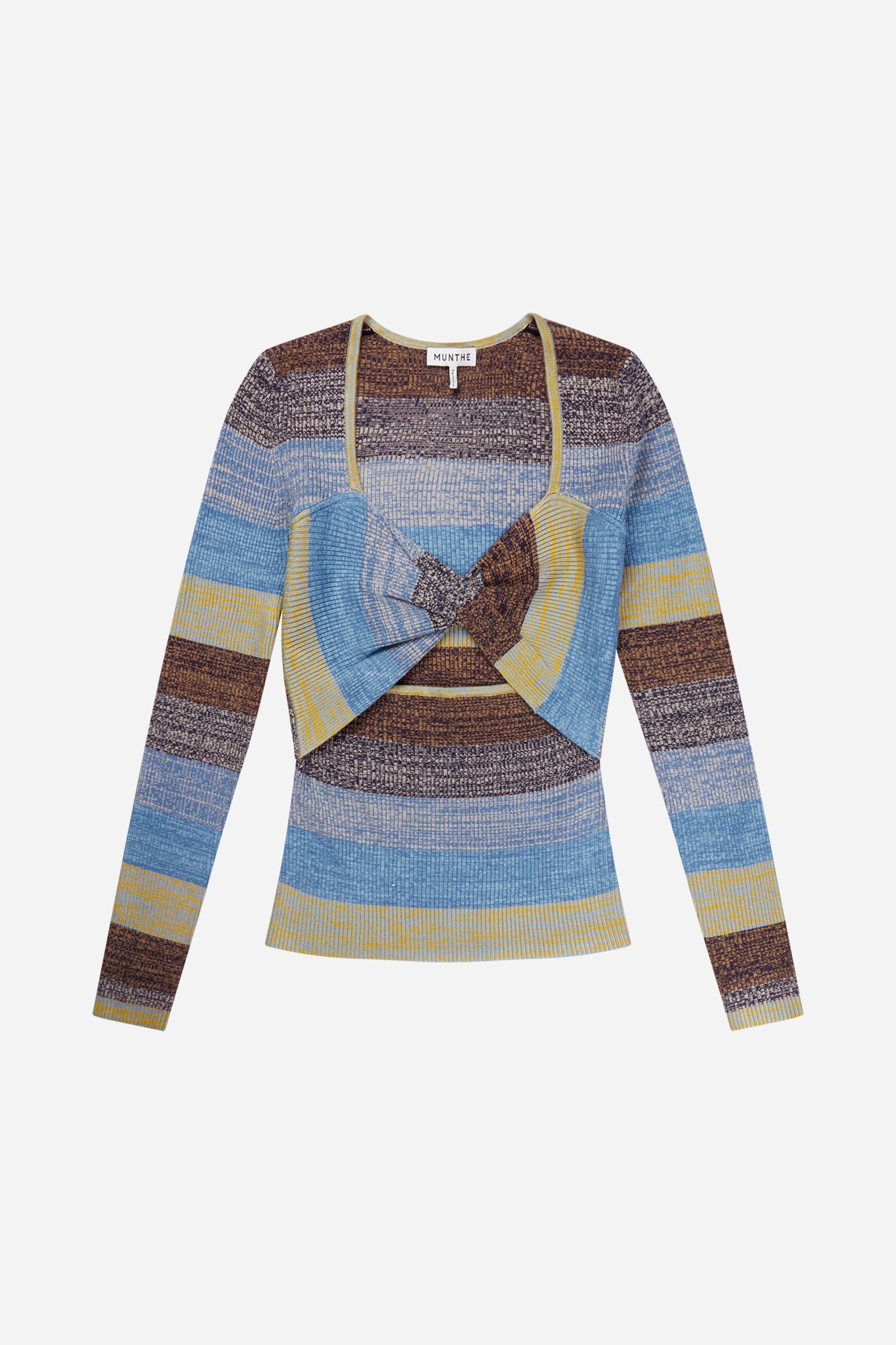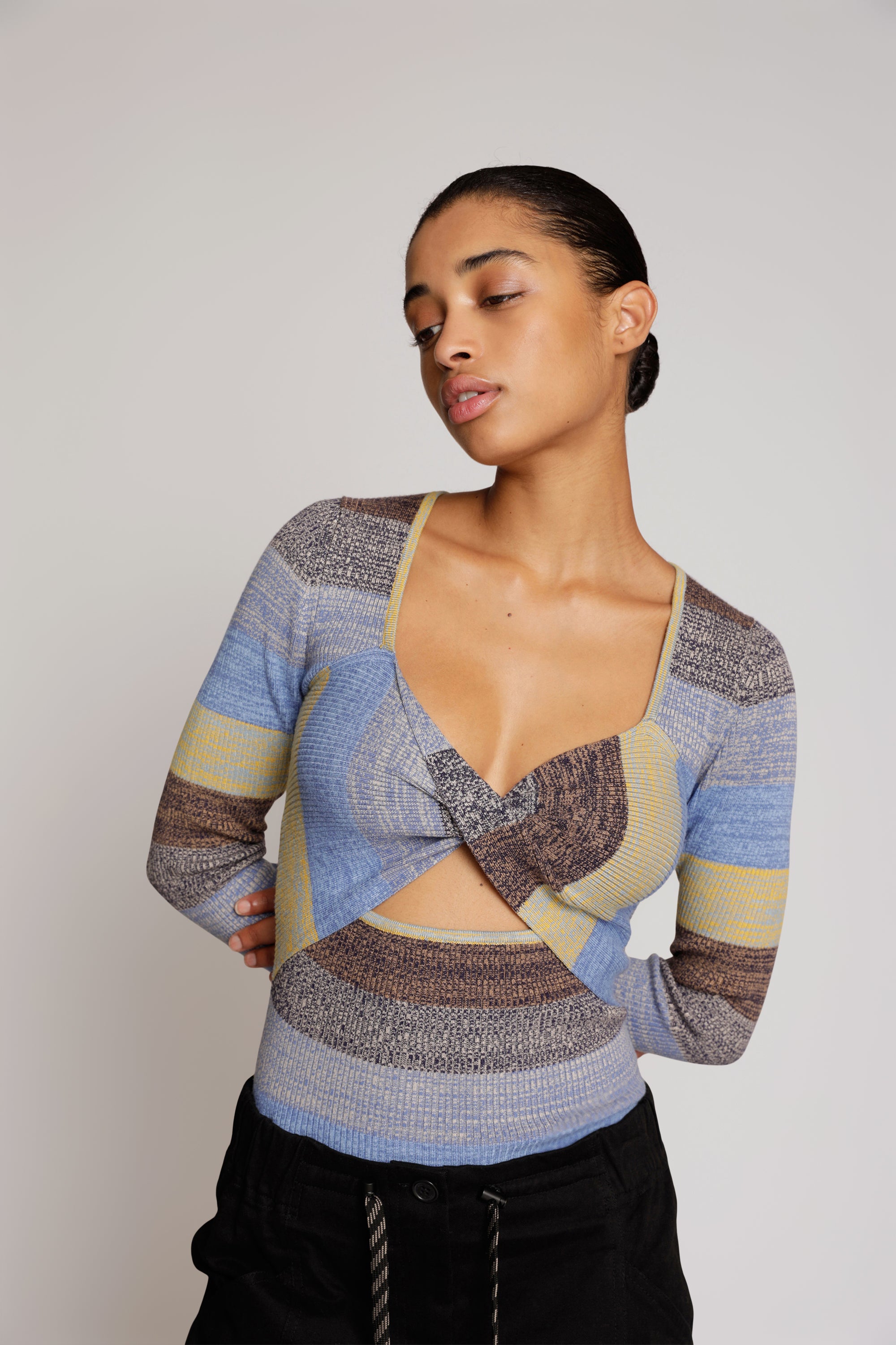 A fitted knit with a feminine cut-out and twist detail. This knit has long sleeves and is made in an elegant rib. Available in the color mix or navy.