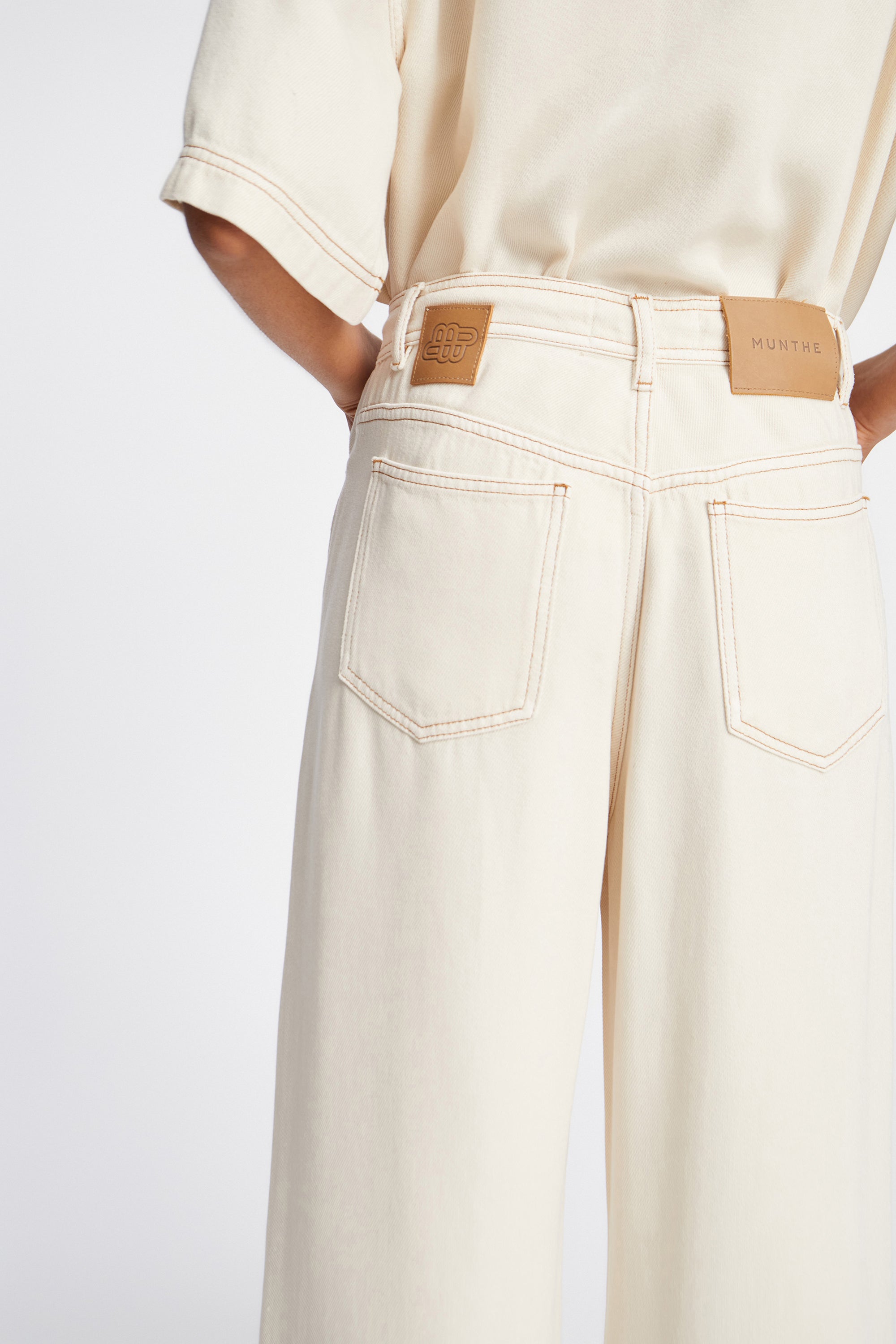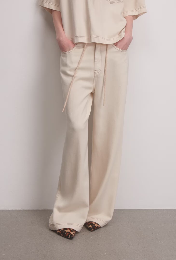 Light, beautiful jeans designed with an elegant lace-up detail at the waist. These trousers feature a loose fit, wide legs, and pockets both at the front and back.