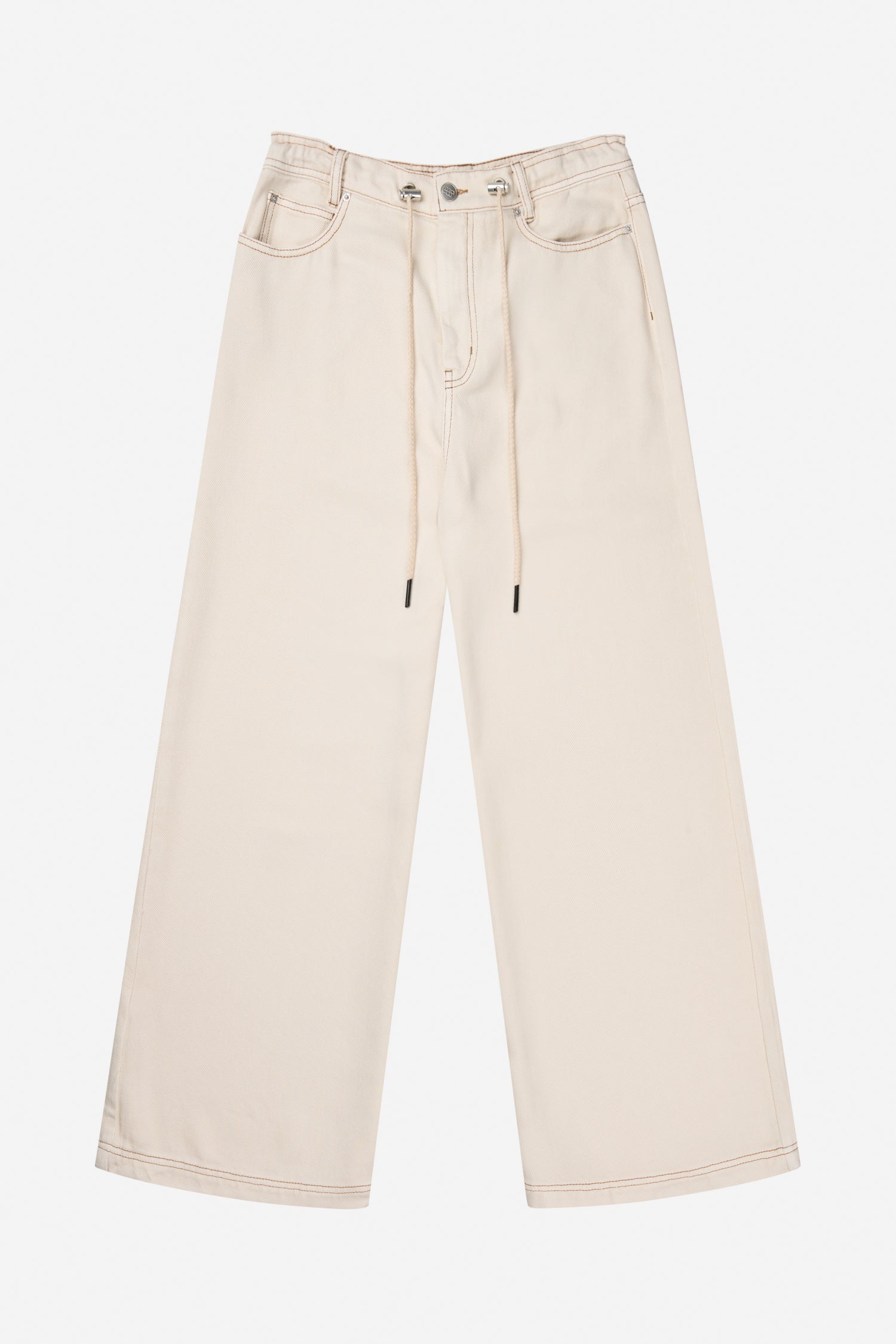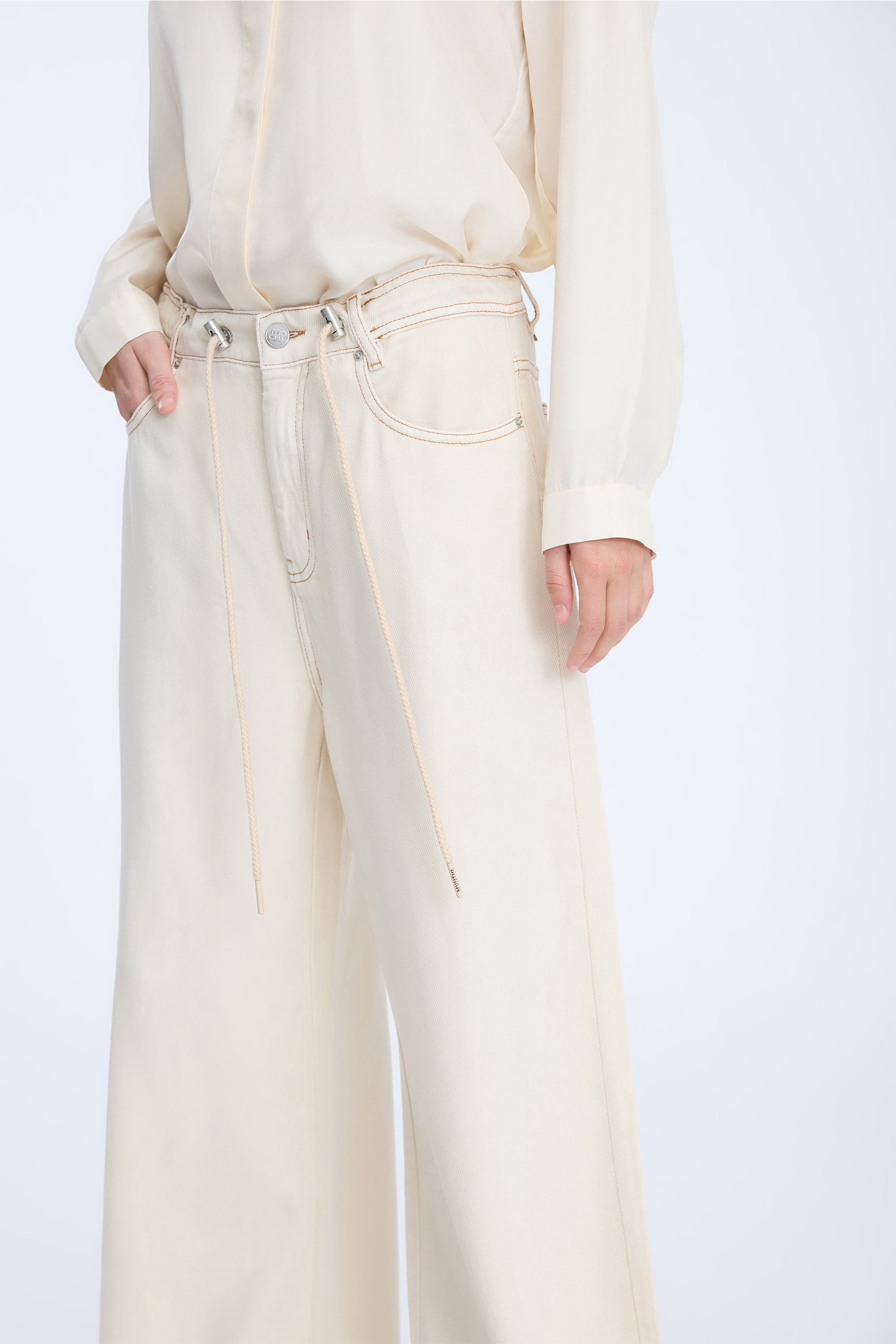 Jeans designed with an elegant tie string detail at the waist. These pants have a loose fit, wide legs, and front and back pockets.