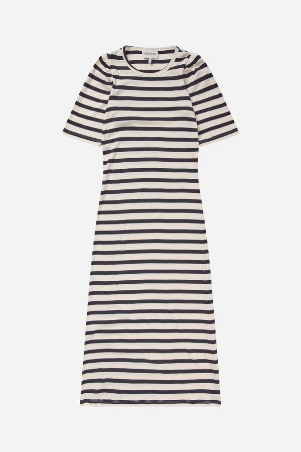 Soft long rib dress with elegant classic stripes made from 100% organic cotton. The dress has short sleeves with a small puff on the shoulders.