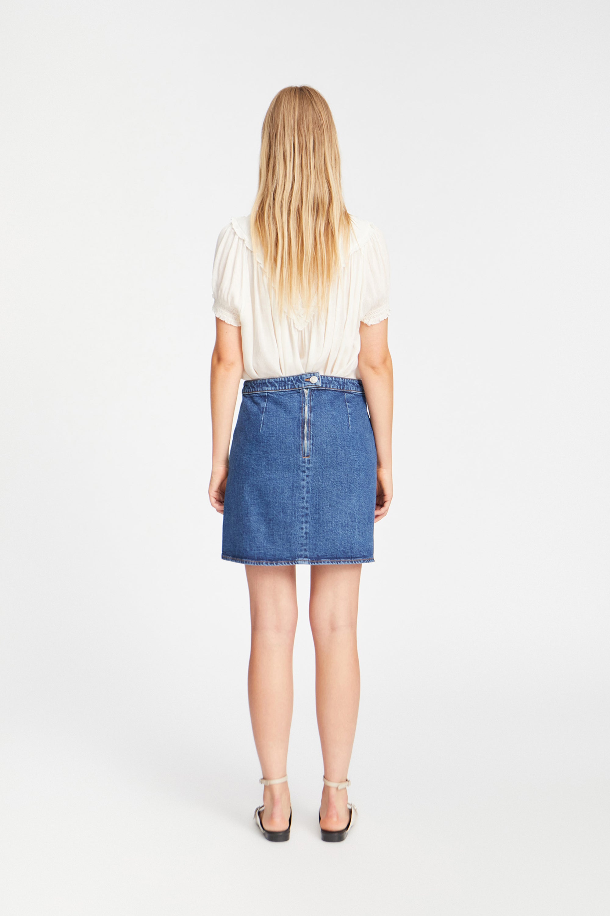 A short denim skirt with an elegant wrap-effect. The skirt features pockets as well as a zip and button closure at the back.