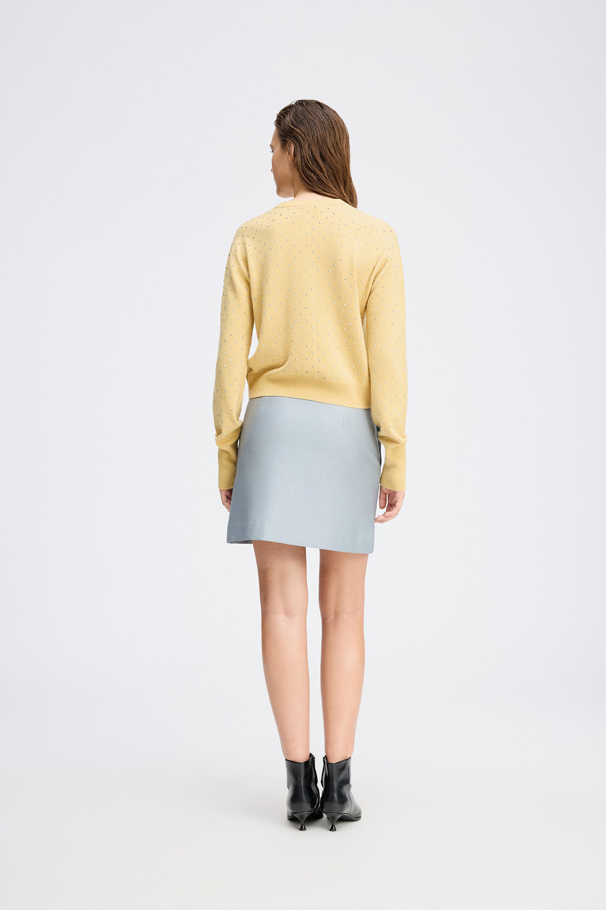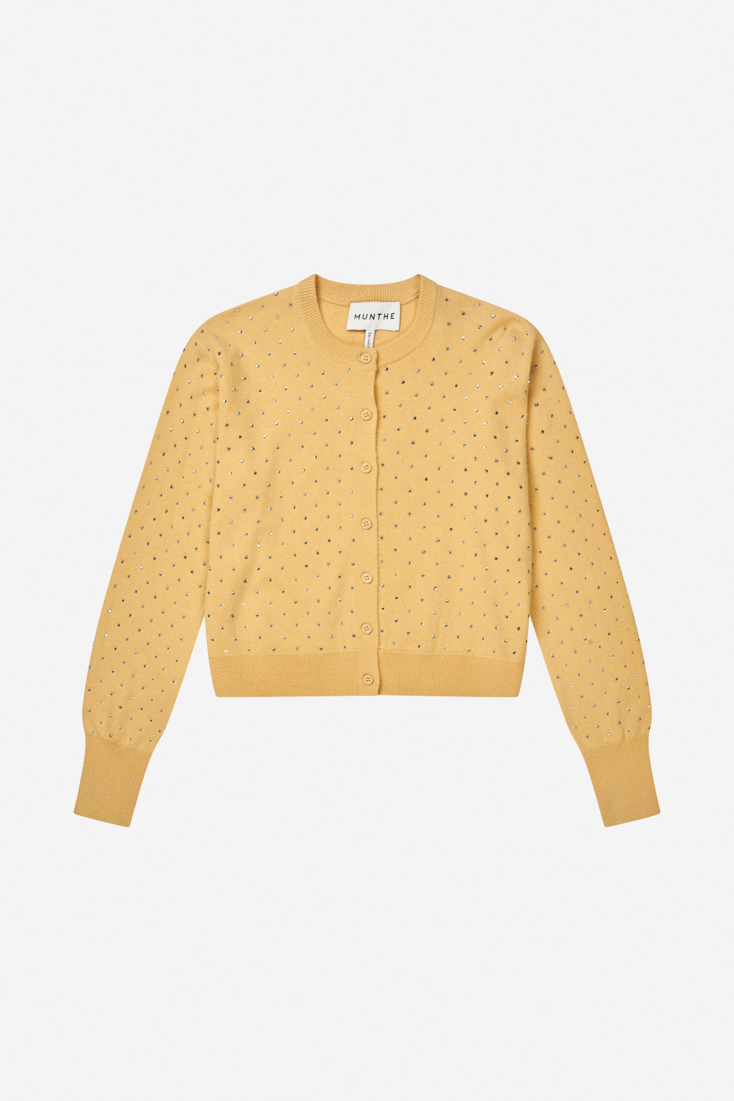 Beautiful, soft cardigan with elegant silver-colored studs. The cardigan features a classic round neckline, long sleeves, and a front button closure.